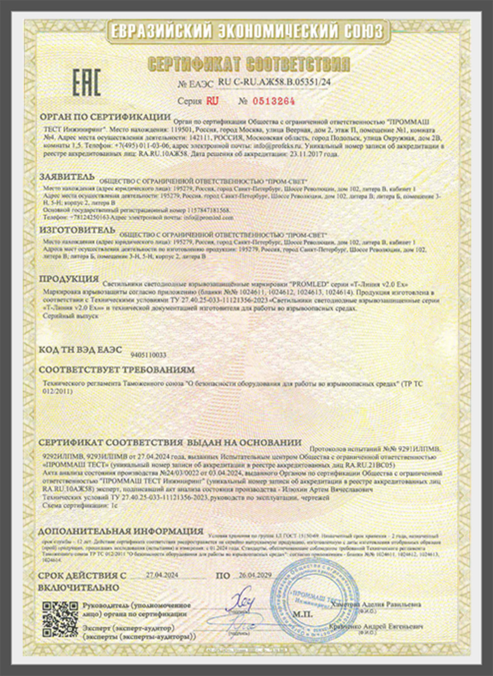 Светильник «Т-Линия v2.0 Ex» соответствует требованиям технического регламента Таможенного союза «О безопасности оборудования для работы во взрывоопасных средах», что подтверждено сертификатом соответствия.