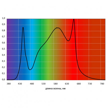 | Фотонное красно-зелено-синее отношение в области ФАР (600-700; 500-600; 400-500 нм), [К:З:С; %]: | 40:43:17 |