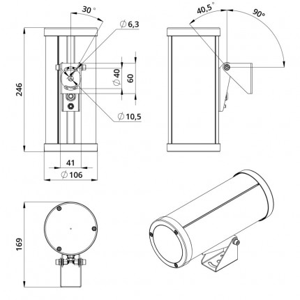 Прожектор крепится на поверхность с помощью стального поворотного кронштейна с возможностью регулировки угла наклона на ±5°.