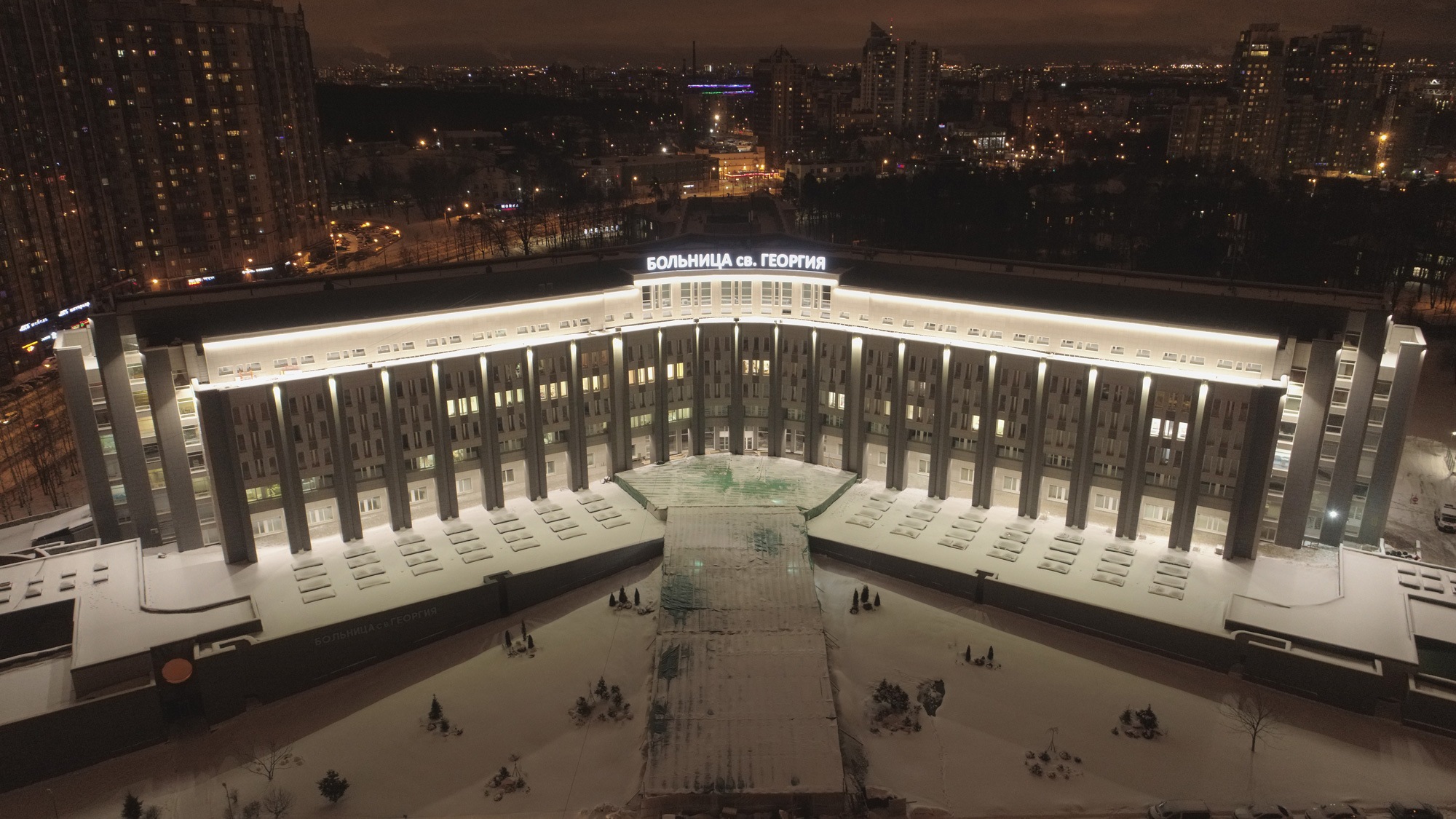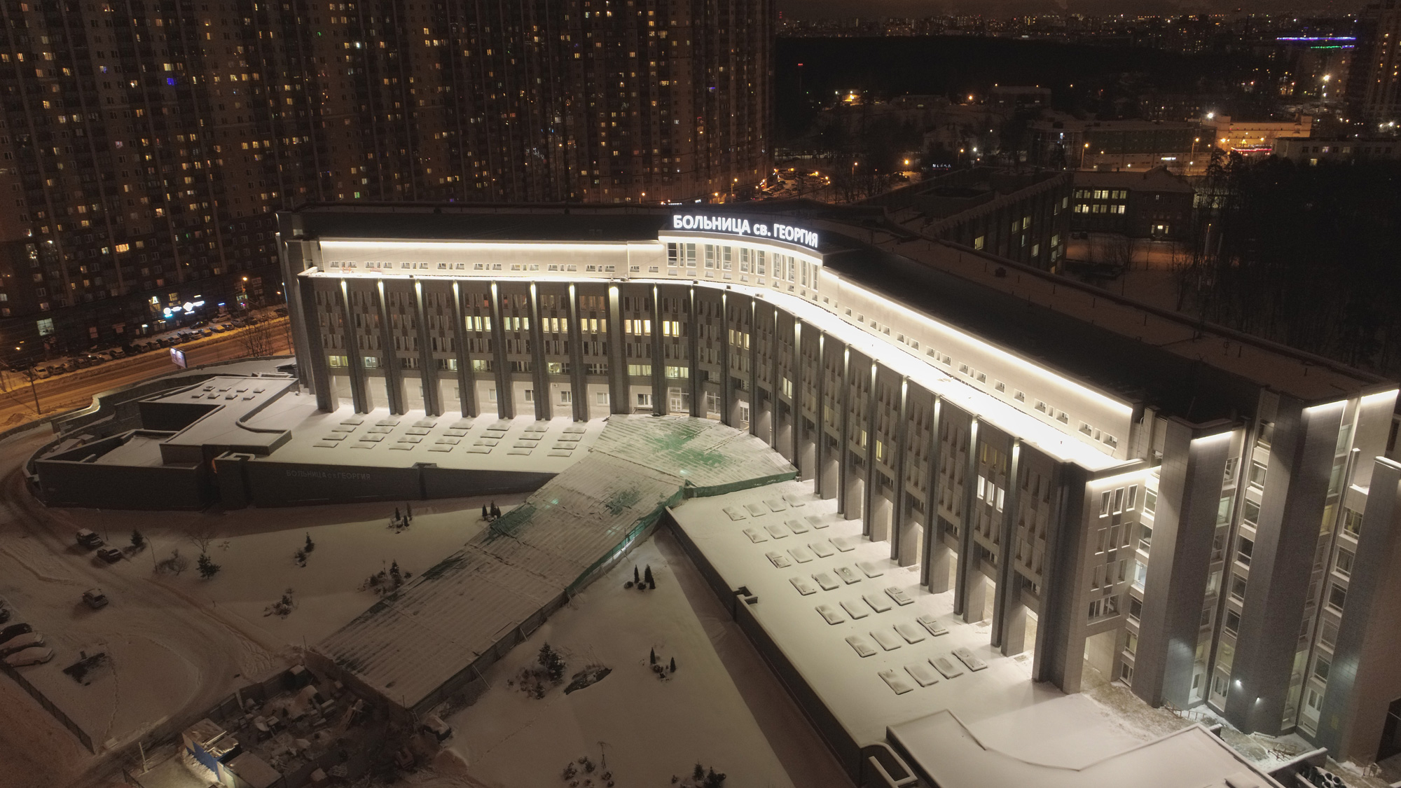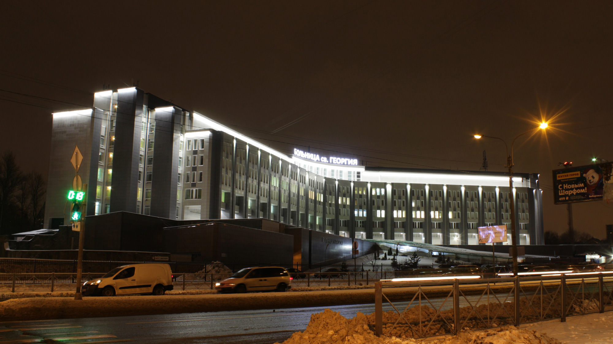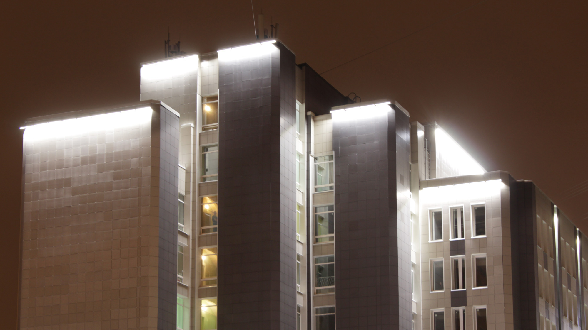 Предложенное осветительное решение: Архитектурно-художественная подсветка фасада здания больницы была поделена на 3 этапа. На верхний фасад здания установили светодиодные светильники ПромЛед Барокко-40-1000 Оптик с линзами 10x65° для равномерного распределения света вдоль всего периметра. Для освещения углублений внутри колонн и создания акцентного света установили светодиодные светильники ПромЛед Прожектор К-30. Торец здания осветили светодиодными светильниками ПромЛед Барокко-20-1000