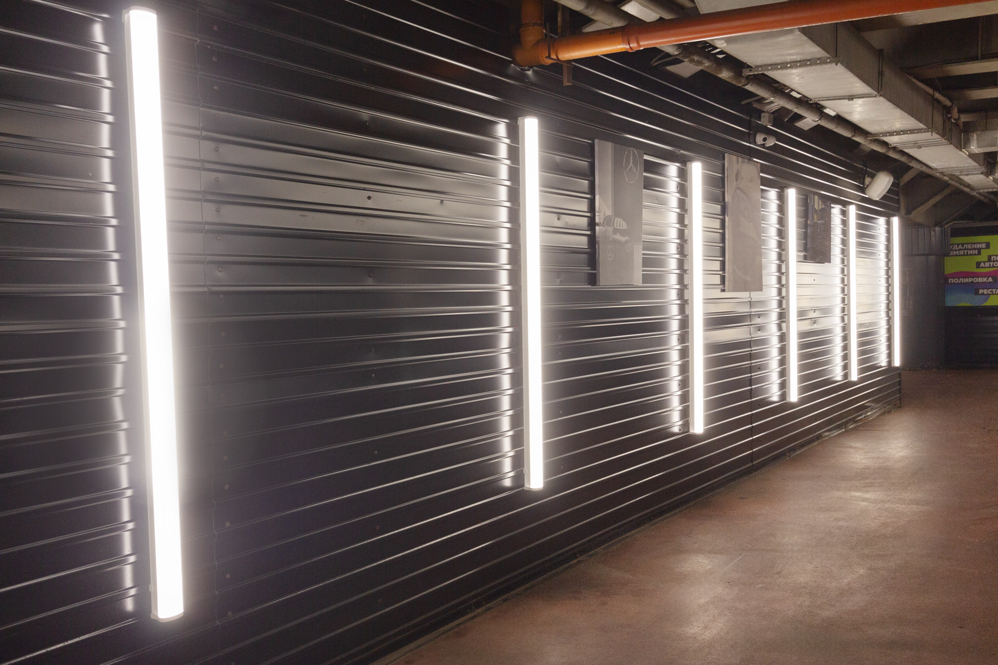 в рамках реализации проекта совместно с официальным партнером «Лед78» были разработаны светильники длиной 1,8 и 3 м на основе серии светильников «Айсберг v2.0». Данные модели были смонтированы таким образом, чтобы получить эффект единого прямоугольного светильника. Также в качестве дополнительного освещения были установлены одиночные светильники по периметру на стенах.