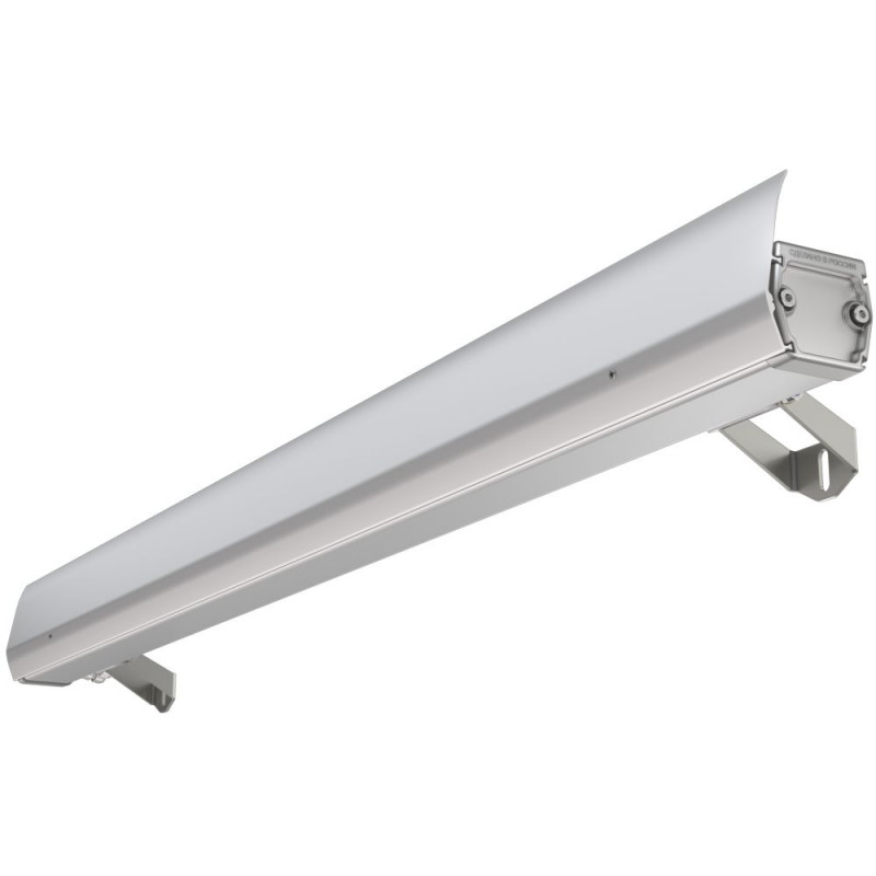 У светильников предусмотрен монтажный профиль с подвижными монтажными скобами, которые перемещаются вдоль корпуса, позволяя скорректировать точки крепления светильника. С помощью этих скоб светильники крепятся на поворотные кронштейны.