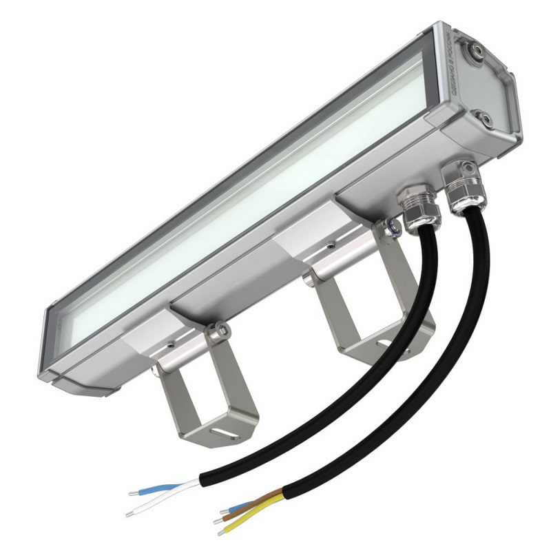 У светильников предусмотрен монтажный профиль с подвижными монтажными скобами, которые перемещаются вдоль корпуса, позволяя скорректировать точки крепления светильника. С помощью этих скоб светильники крепятся на поворотные кронштейны.