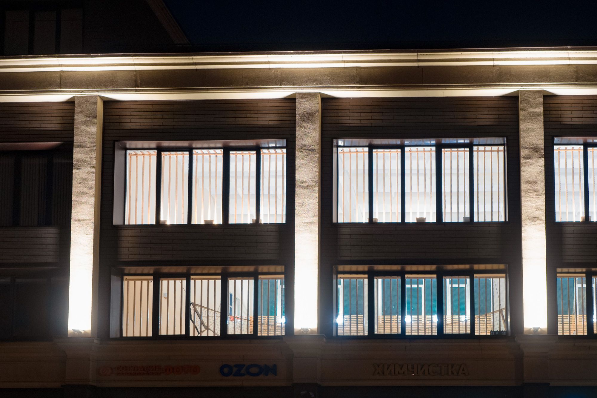 Предложенное осветительное решение: для подсветки фасада здания установлены светодиодные светильники