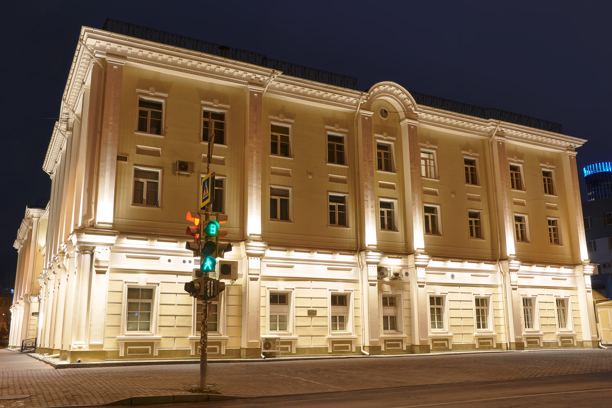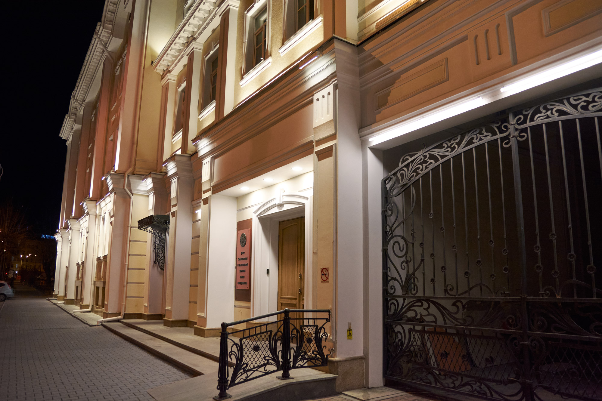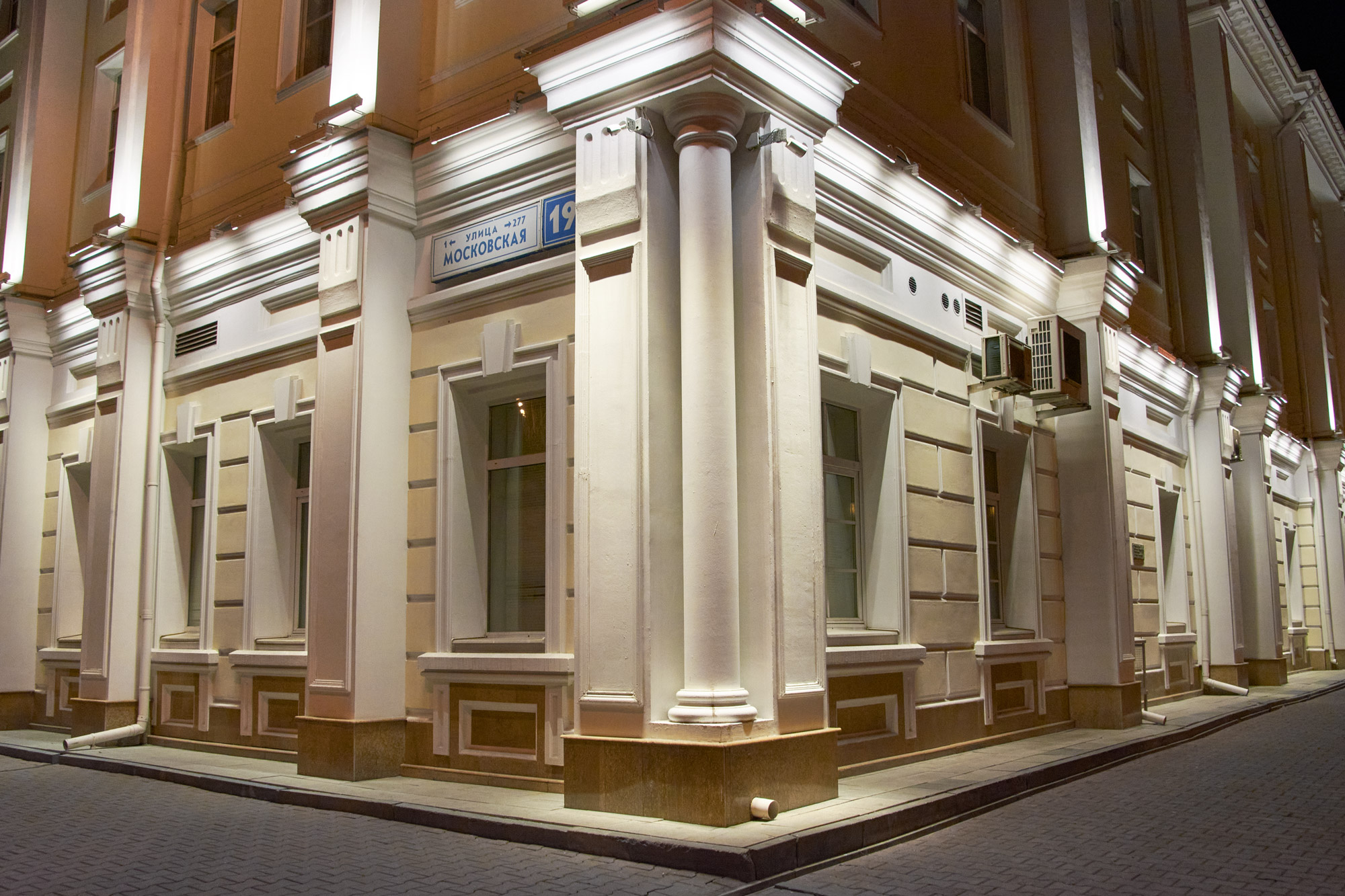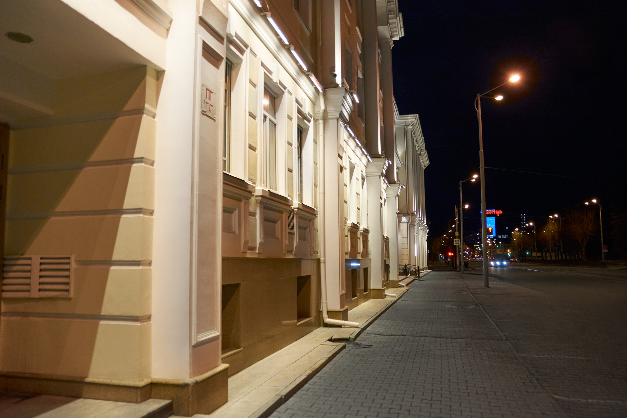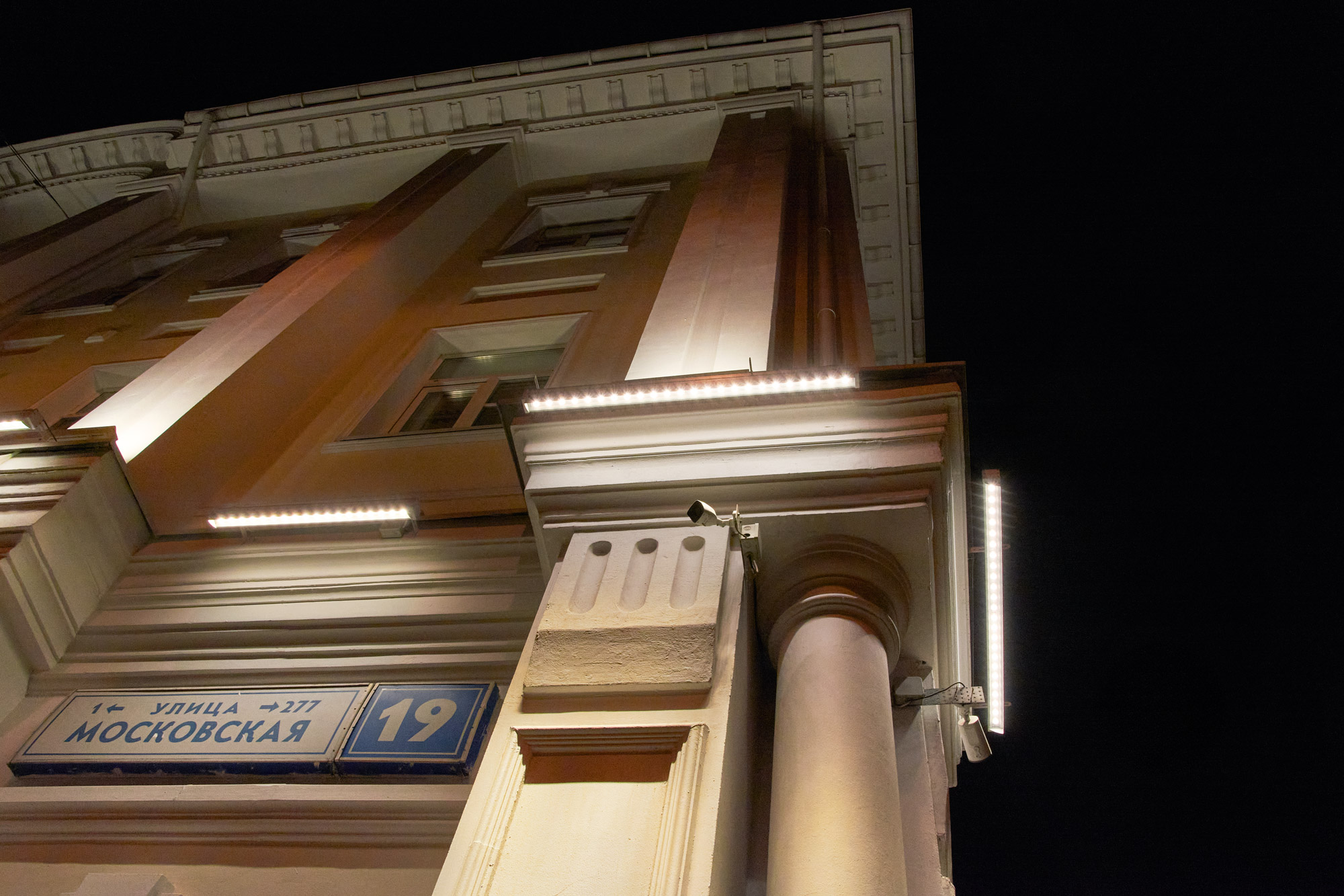 Компанией PromLED изготовлено светодиодное оборудование с учетом требований заказчика (окрашивание корпуса в цвет фасада, применение шторок для снижения потерь освещения и ослепления, применена оптика). Квалифицированными сотрудниками подрядной организации произведен монтаж и юстировка освещения на фасаде, осуществлена настройка оборудования для управления освещением.