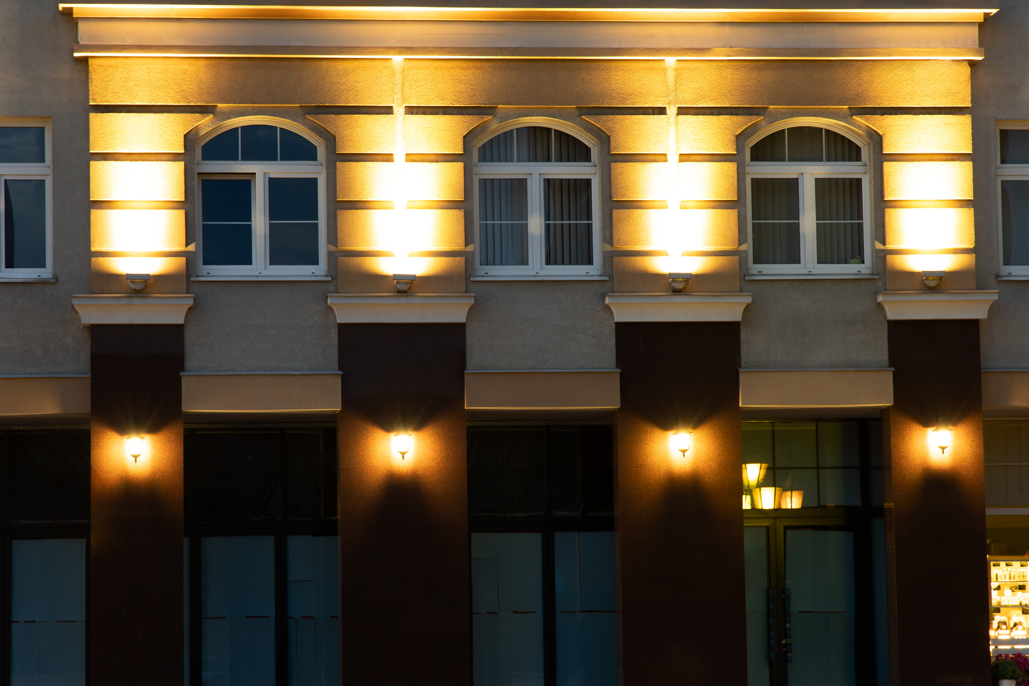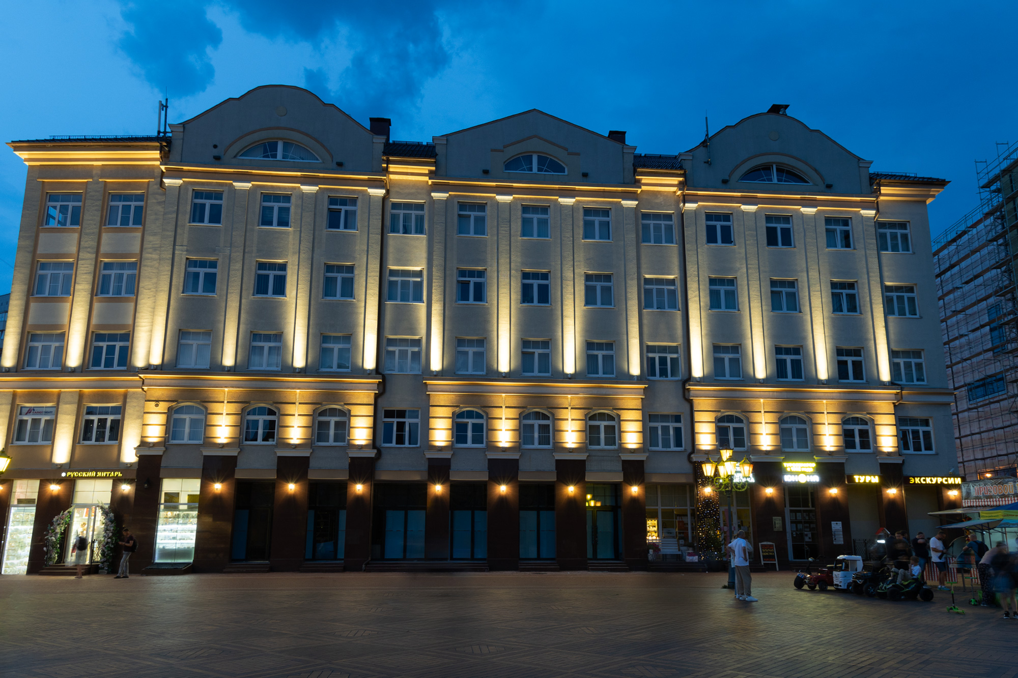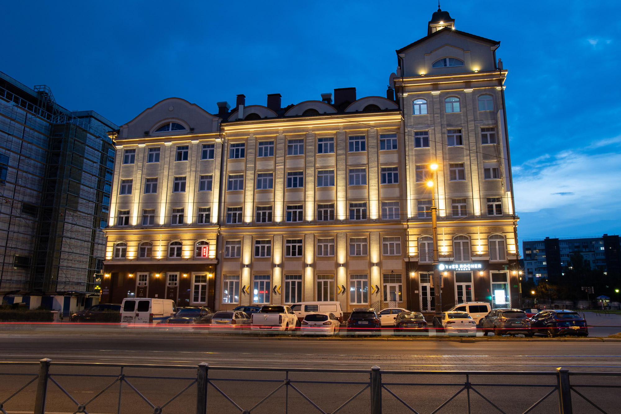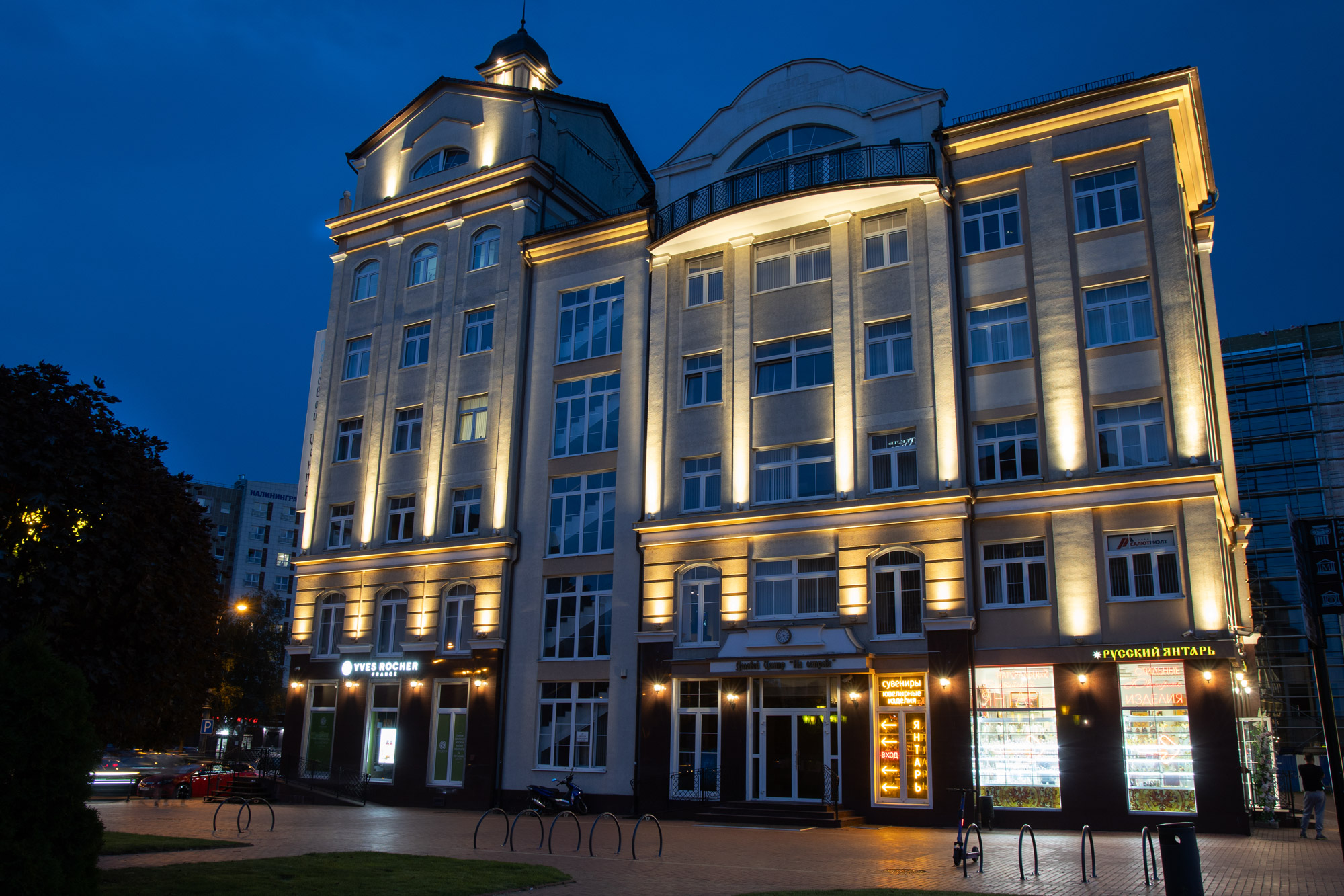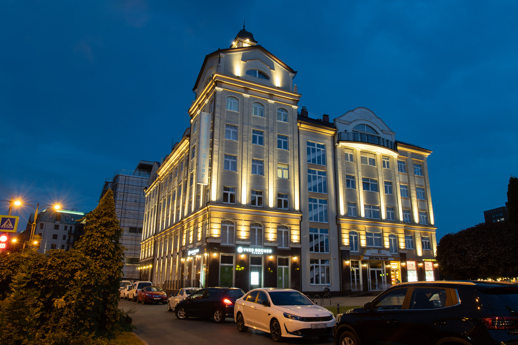 сделан светотехнический расчет архитектурного освещения здания, для реализации проекта были предложены светодиодные светильники серии «Акцент» различной мощности и светораспределения, а также светодиодные прожекторы серии «Прожектор К».