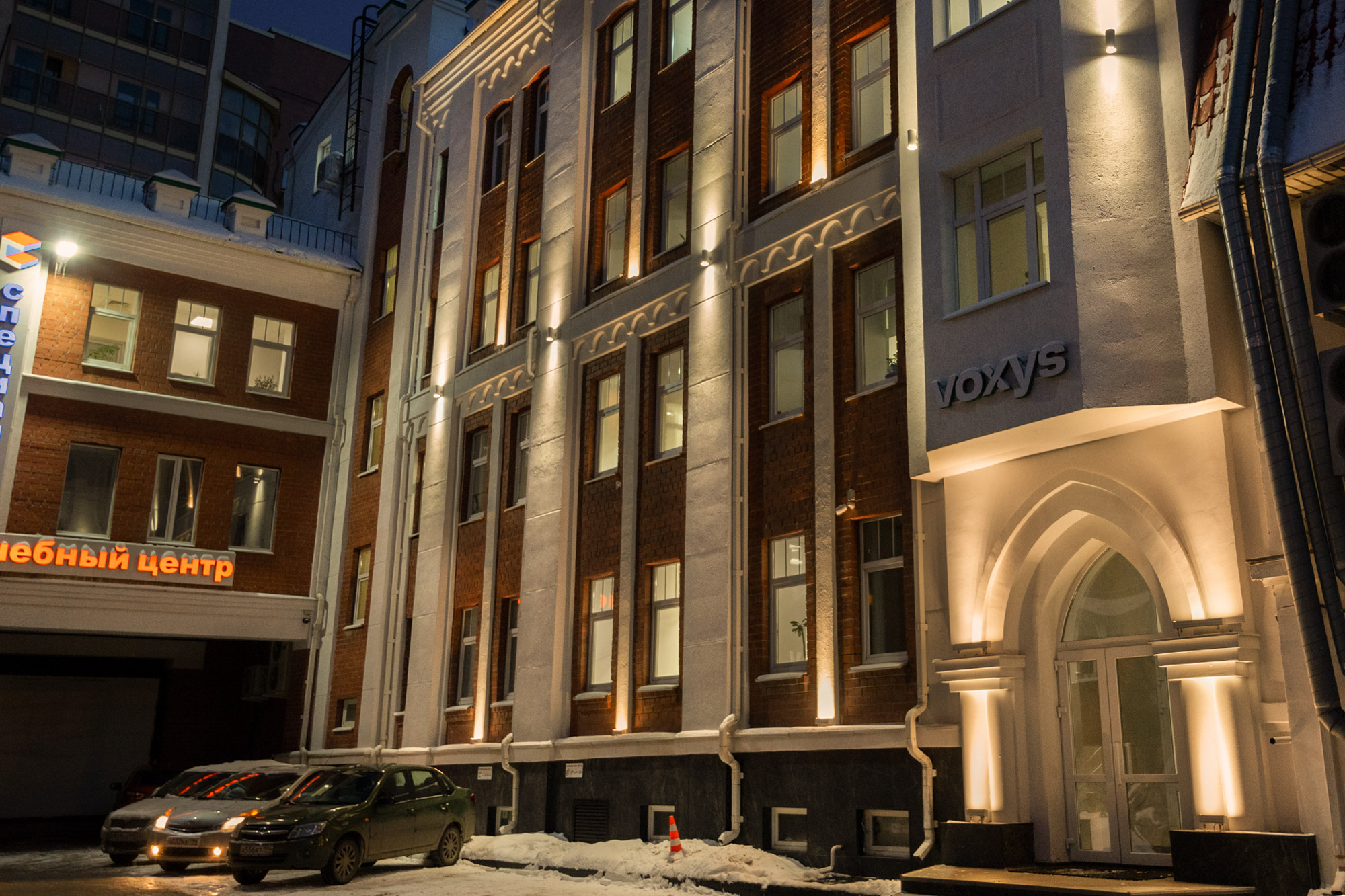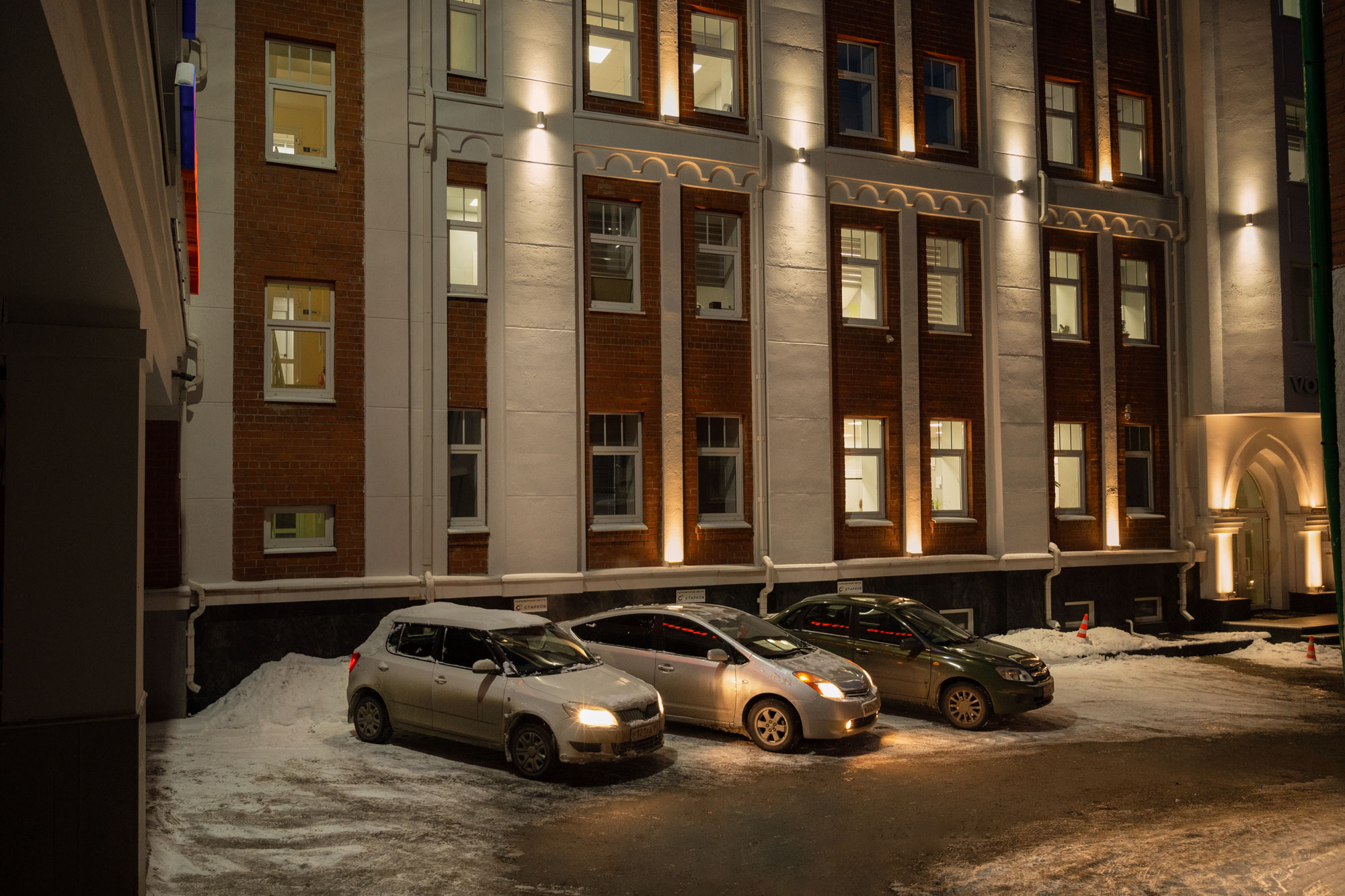 на основании светотехнического расчета были выбраны светильники «Акцент Дуо» и «Прожектор К», покрытые порошковой краской в цвет фасада.