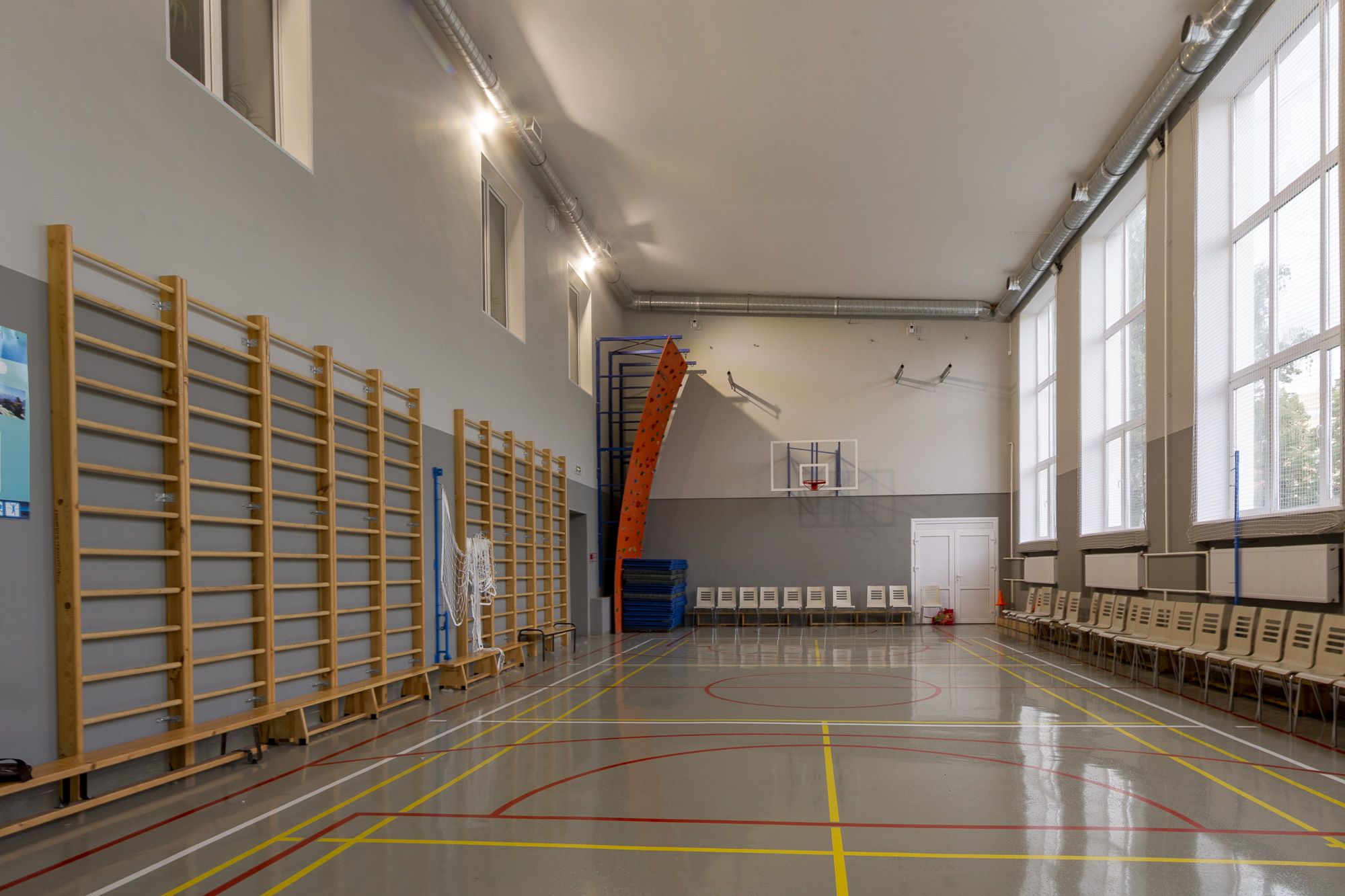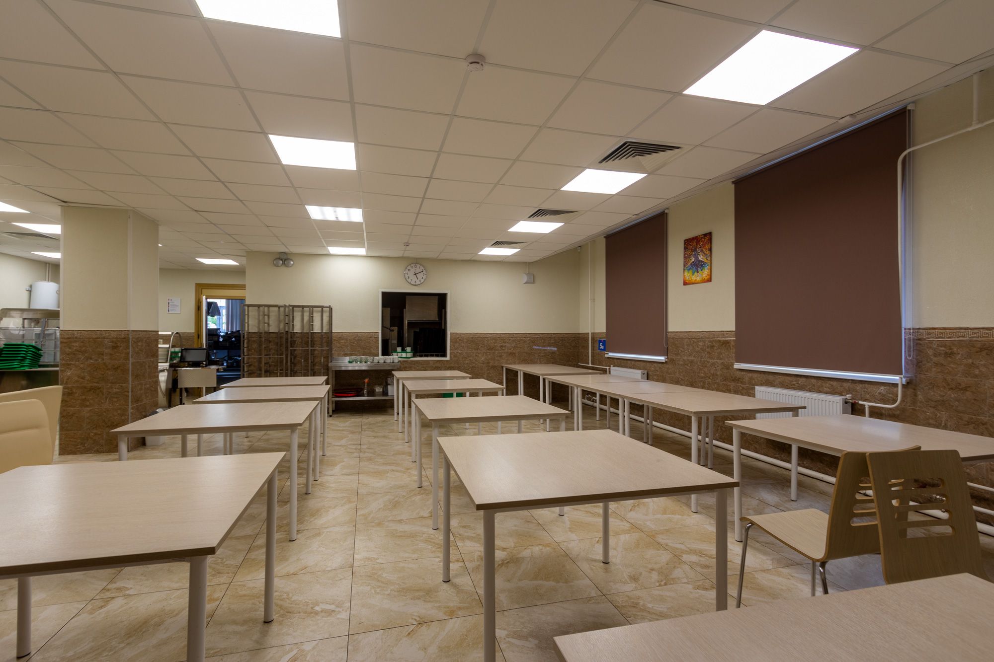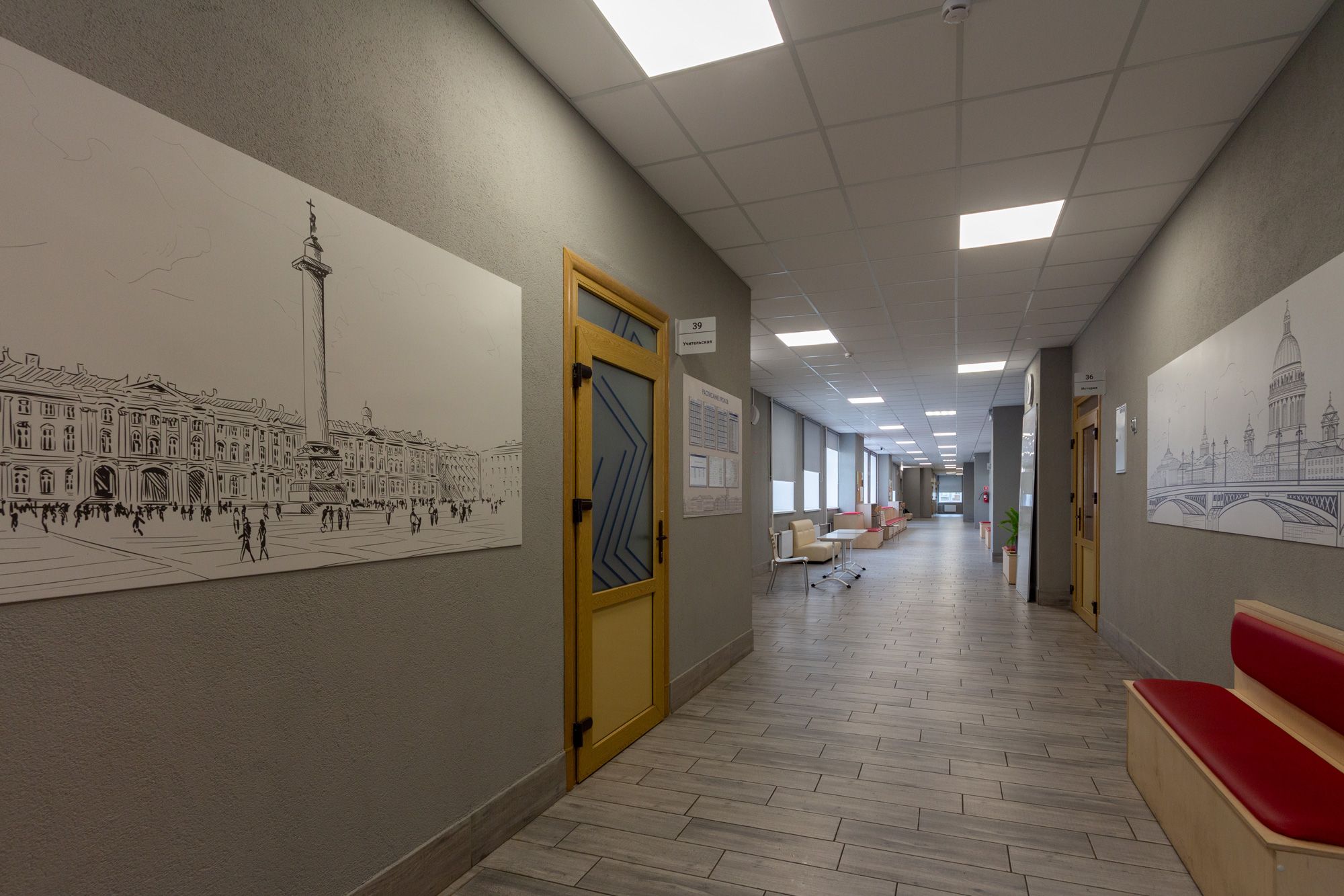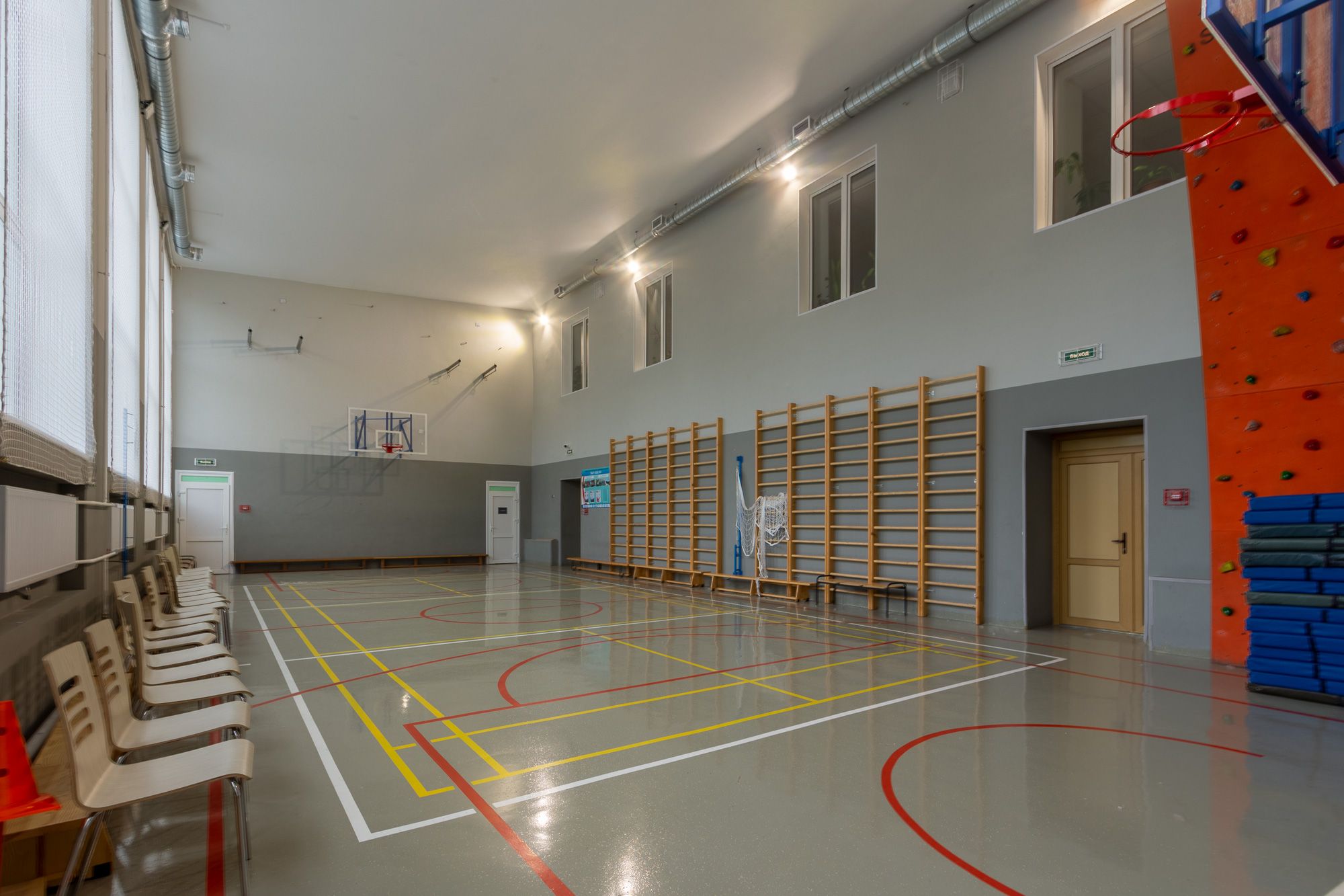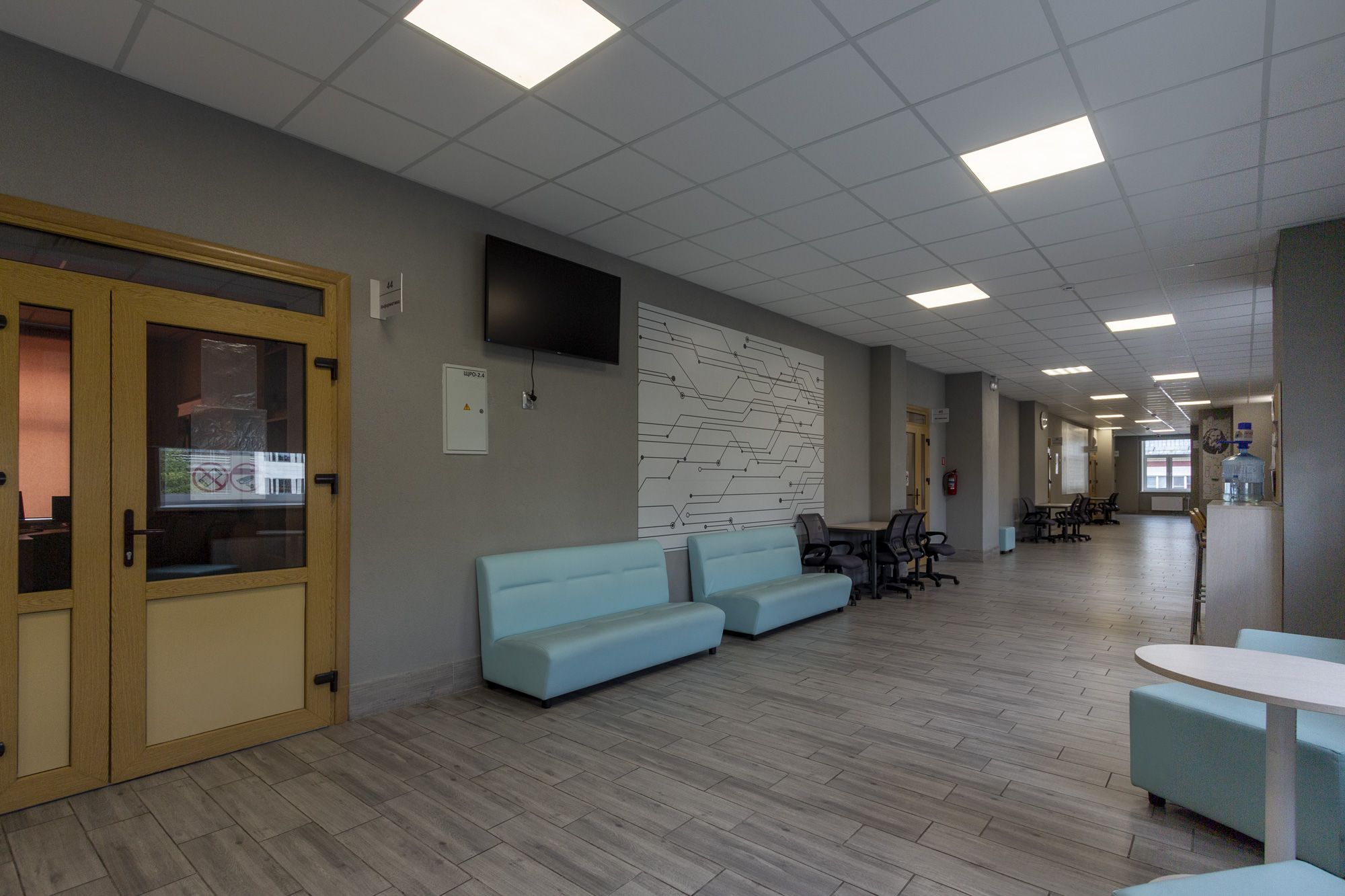 холла, коридоров, классов, столовой, спортивного зала. Для реализации светотехнического решения были установлены светодиодные светильники: