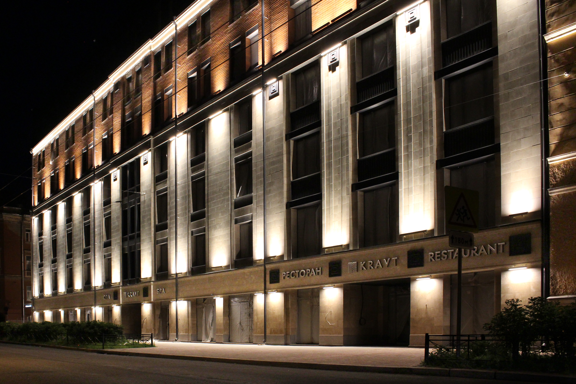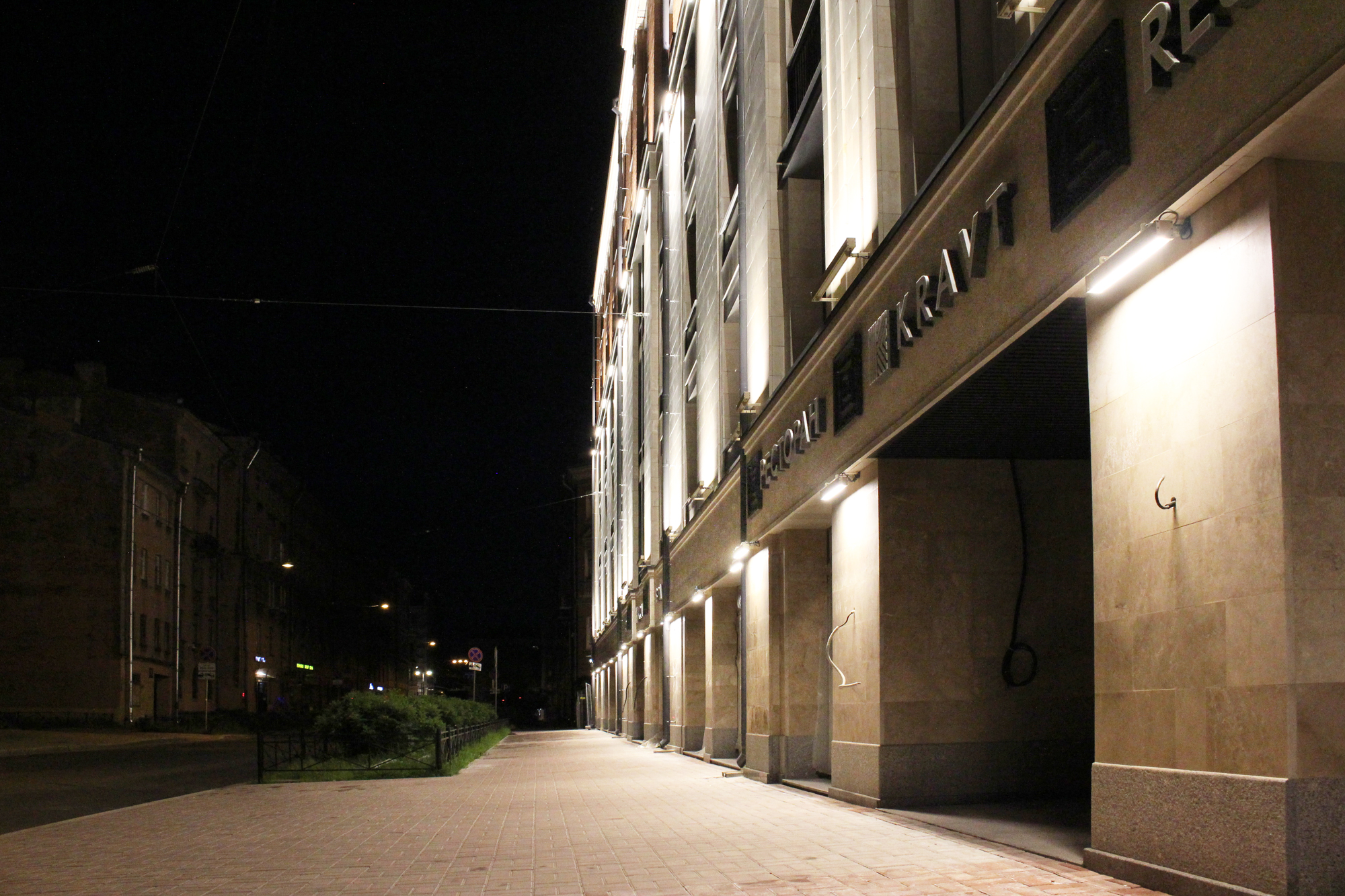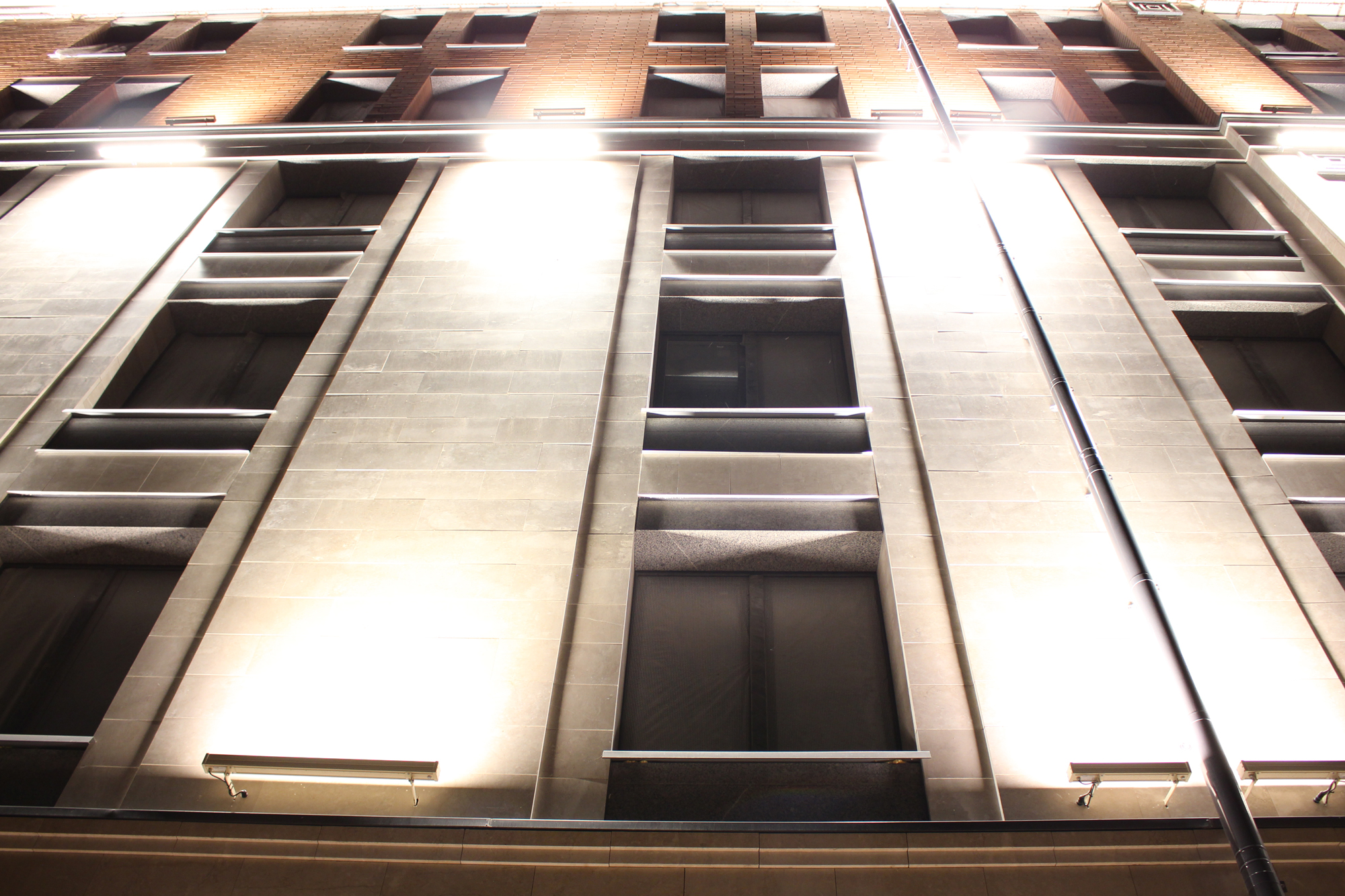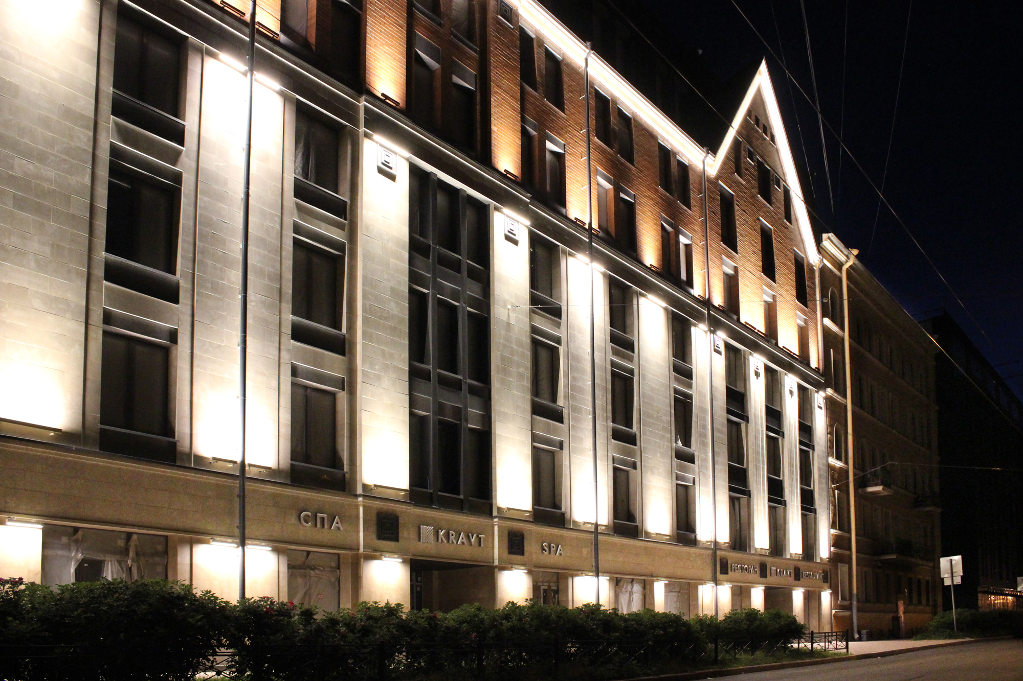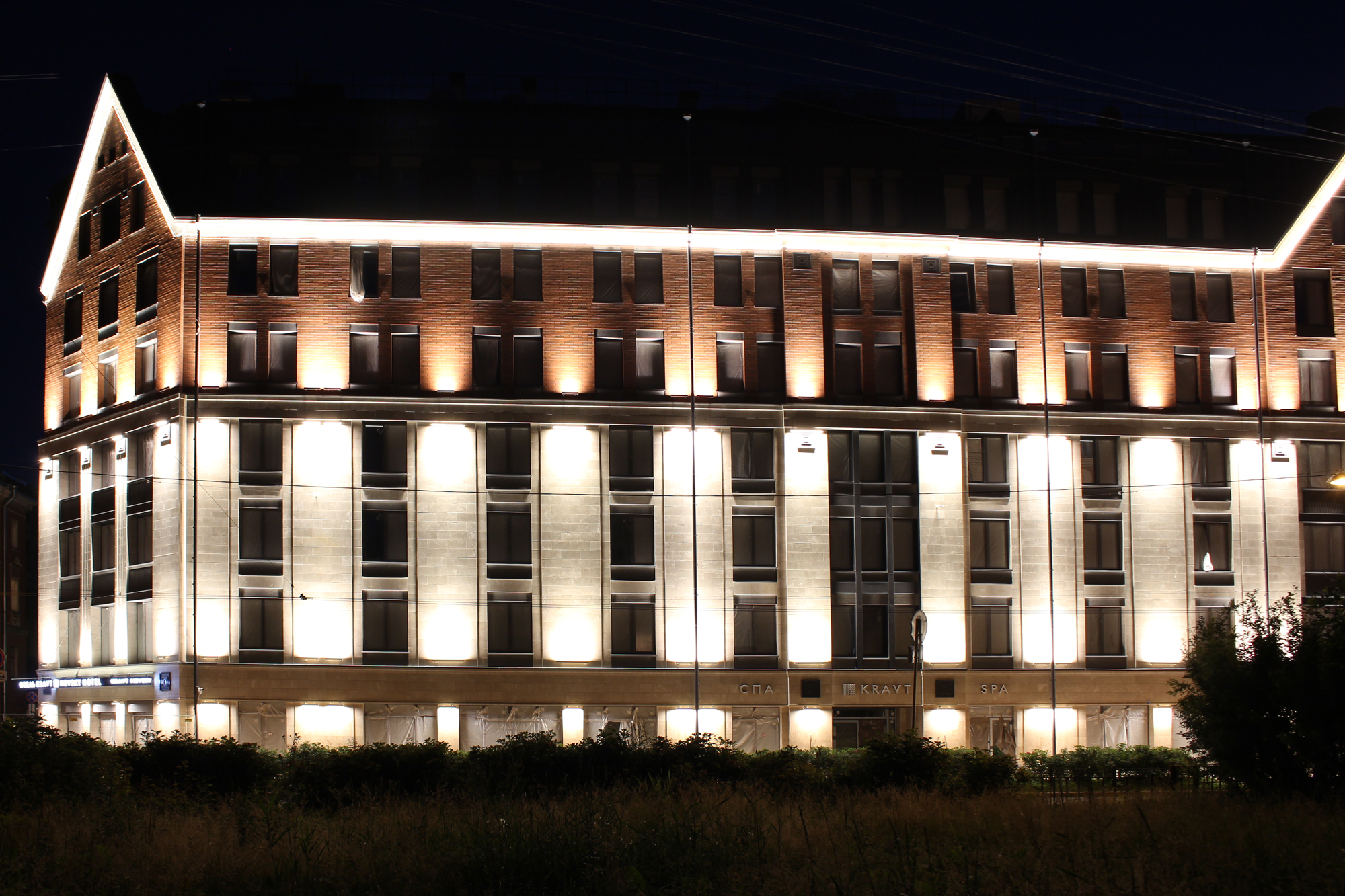 Предложенное осветительное решение: Для контурной подсветки линии крыши мансарды установили светодиодные светильники ПромЛед Модерн 10 1000мм 3000К Опал. Для освещения межоконных проемов, архитектурных элементов и подсветки выступов на фасаде здания установили светодиодные светильники ПромЛед Барокко Оптик 3000К 10×65° различной мощности.