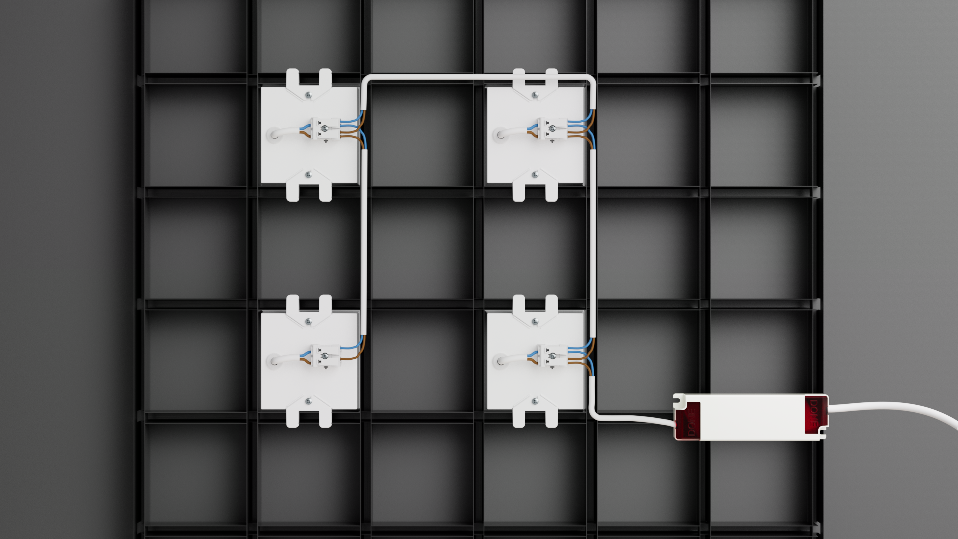 Процесс установки максимально прост: модули вкладываются в ячейки потолка, соединяются между собой и с источником питания проводами, поставляемыми в комплекте, при помощи удобных нажимных контактных зажимов.
