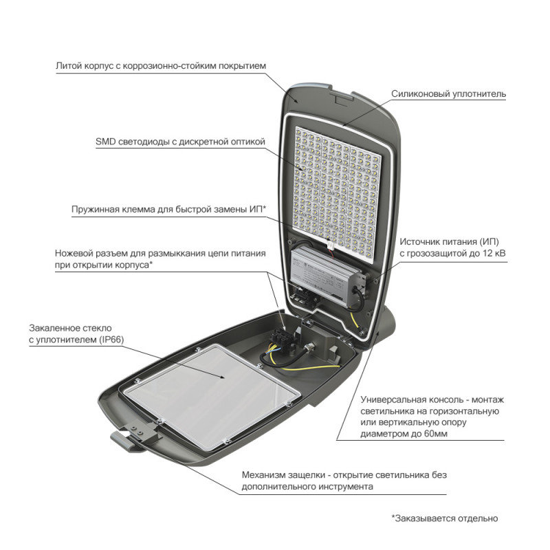 • литой корпус, обеспечивающий малые вес и габариты, регулировку угла наклона светильника, а также удобное обслуживание (доступ в корпус без дополнительного инструмента);
