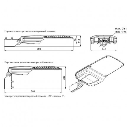 Светильники оснащены поворотным креплением, которое позволяет устанавливать их как на консольную, так и на торшерную опору диаметром от 45 до 60 мм. С помощью крепления можно регулировать угол наклона светильника в диапазоне ±20° с шагом 5°.