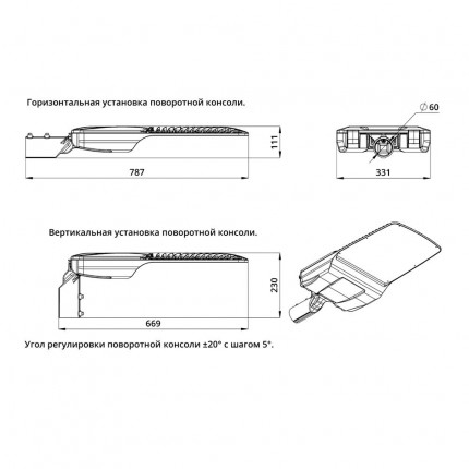 Светильники оснащены поворотным креплением, которое позволяет устанавливать их как на консольную, так и на торшерную опору диаметром от 45 до 60 мм. С помощью крепления можно регулировать угол наклона светильника в диапазоне ±20° с шагом 5°.