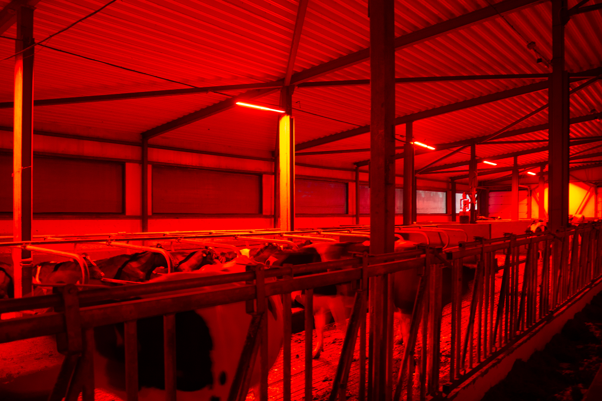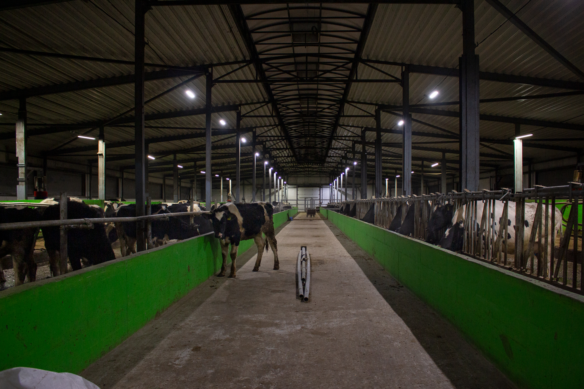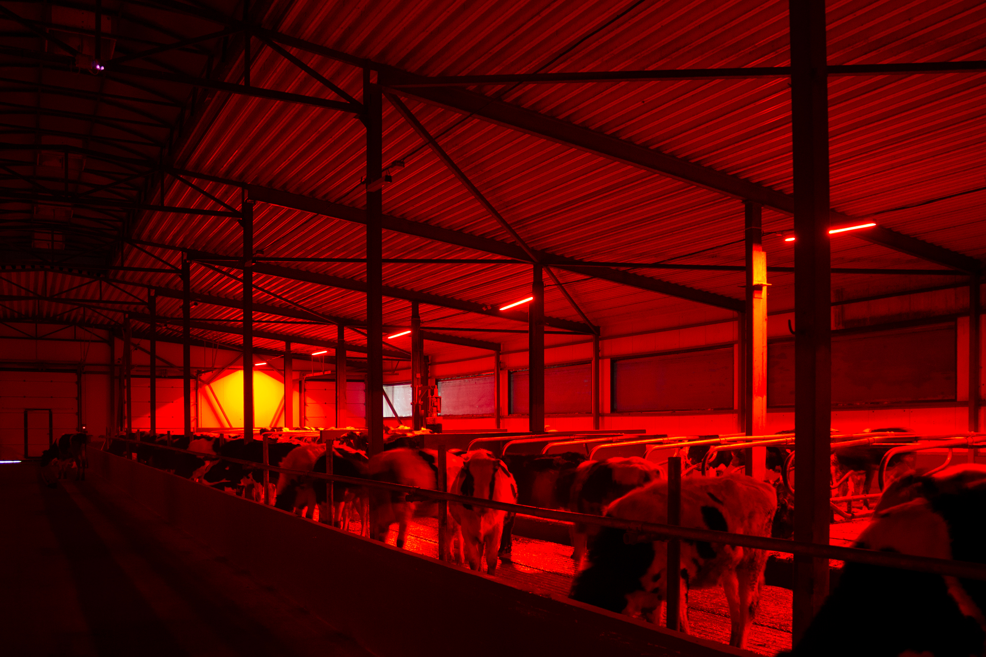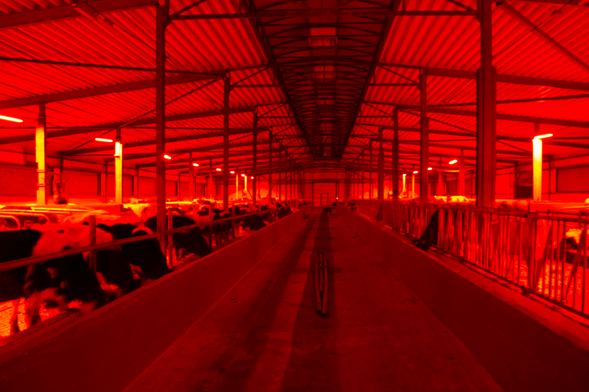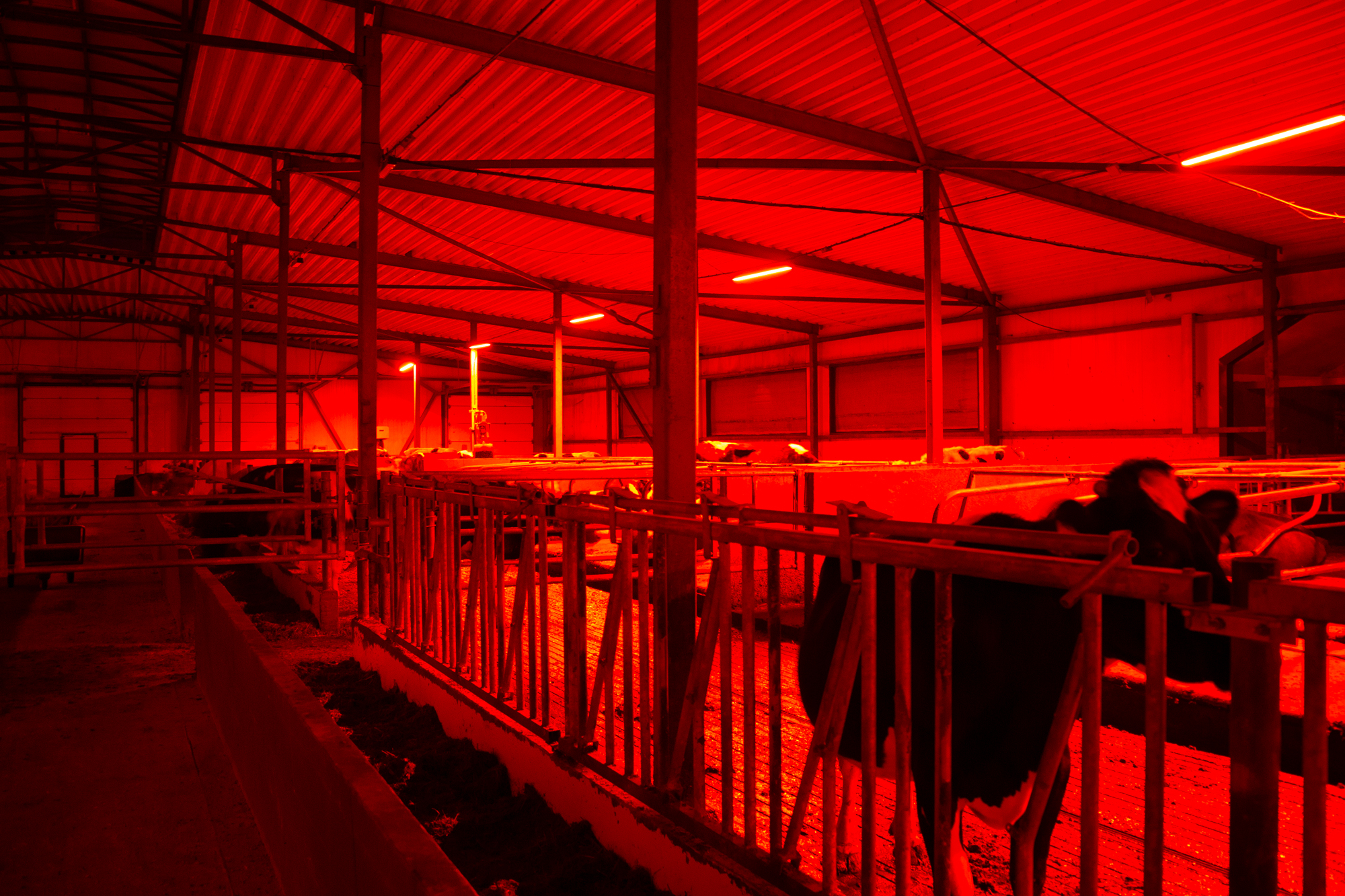 Предложенное осветительное решение: Специально под данный проект был спроектирован и установлен светильник Т-Линия v2.0 100 1500мм 4000К Прозрачный с несколькими режимами, первый режим – дневной, основное освещения Хлева. Второй – ночной, излучает красный свет. Крупнорогатый скот не воспринимает излучения красного света, так как находится за пределами его видимой области спектра, но при этом света достаточно для ночных контрольных обходов.