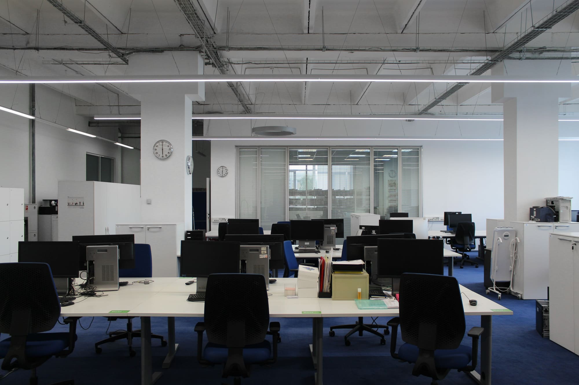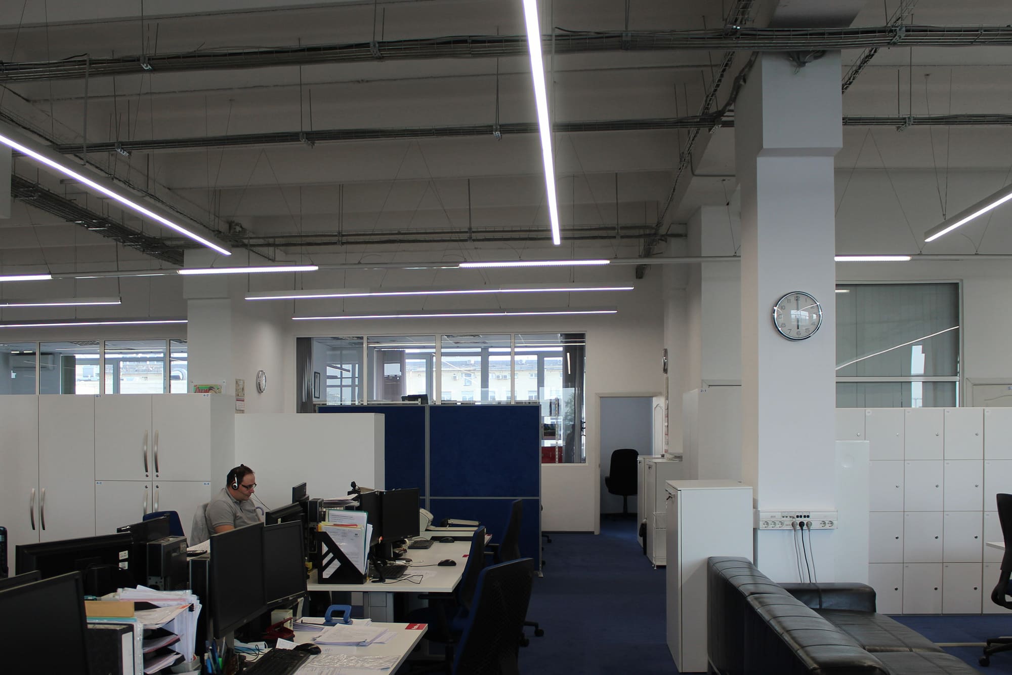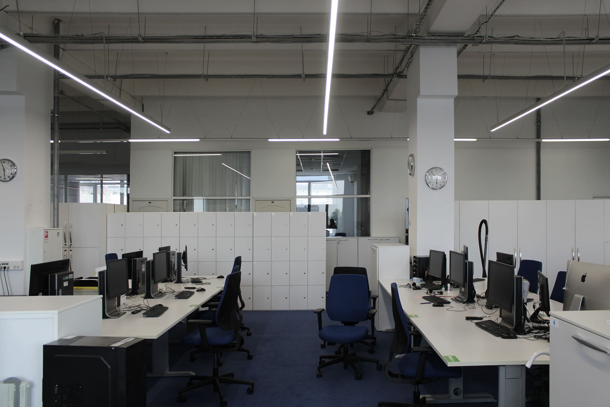 Поставленная задача: освещение открытого (open space) офисного пространства. Для заказчика были важны современный дизайн светильников, отсутствие слепящего эффекта и возможность соединять светильники в одну линию.