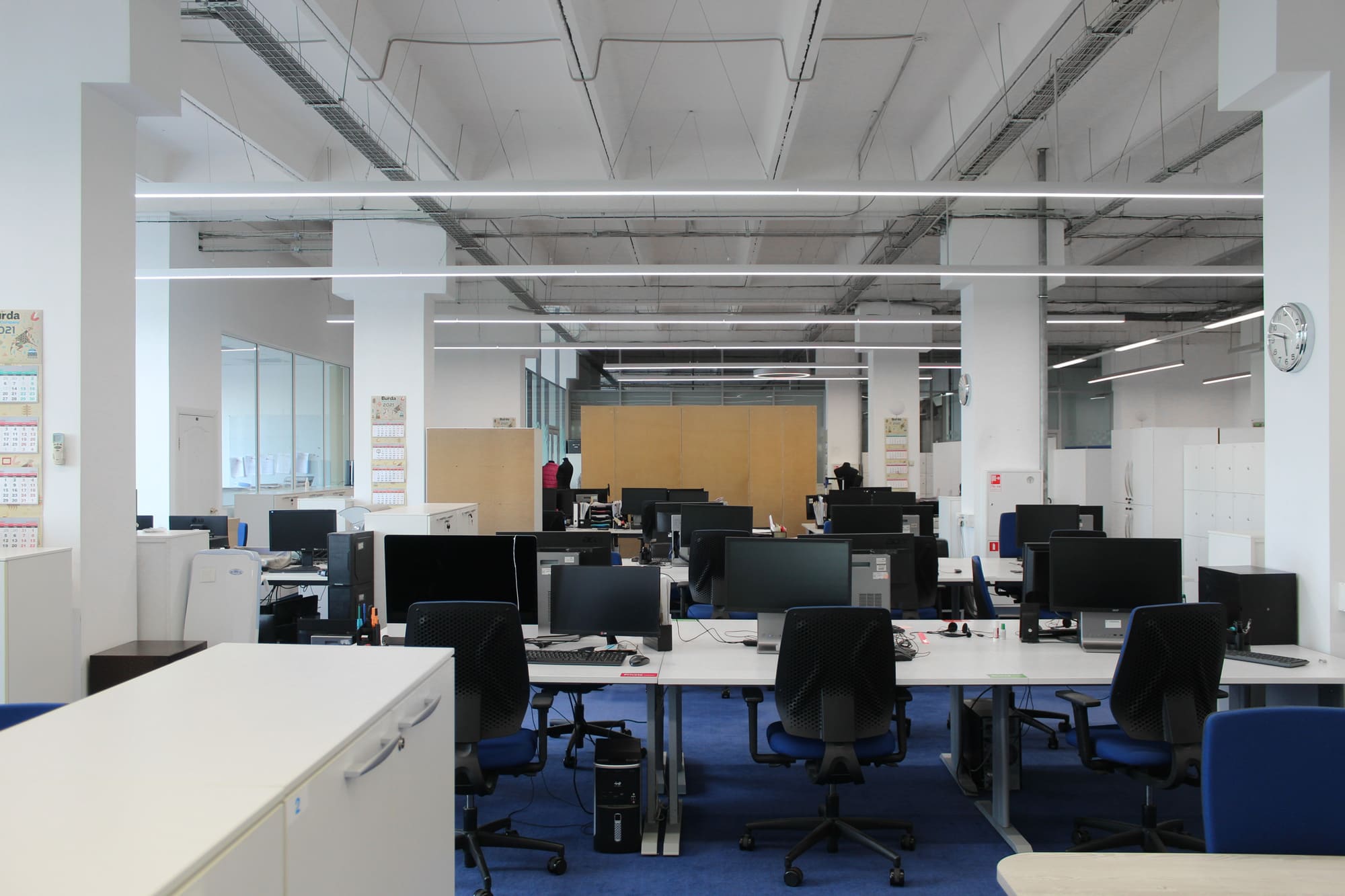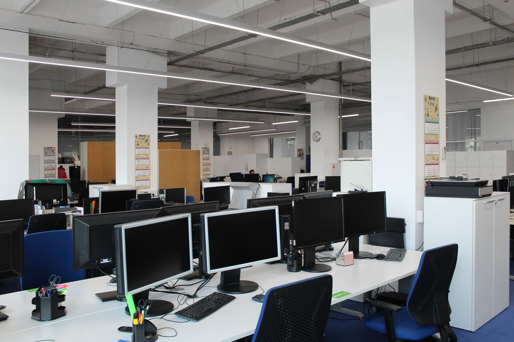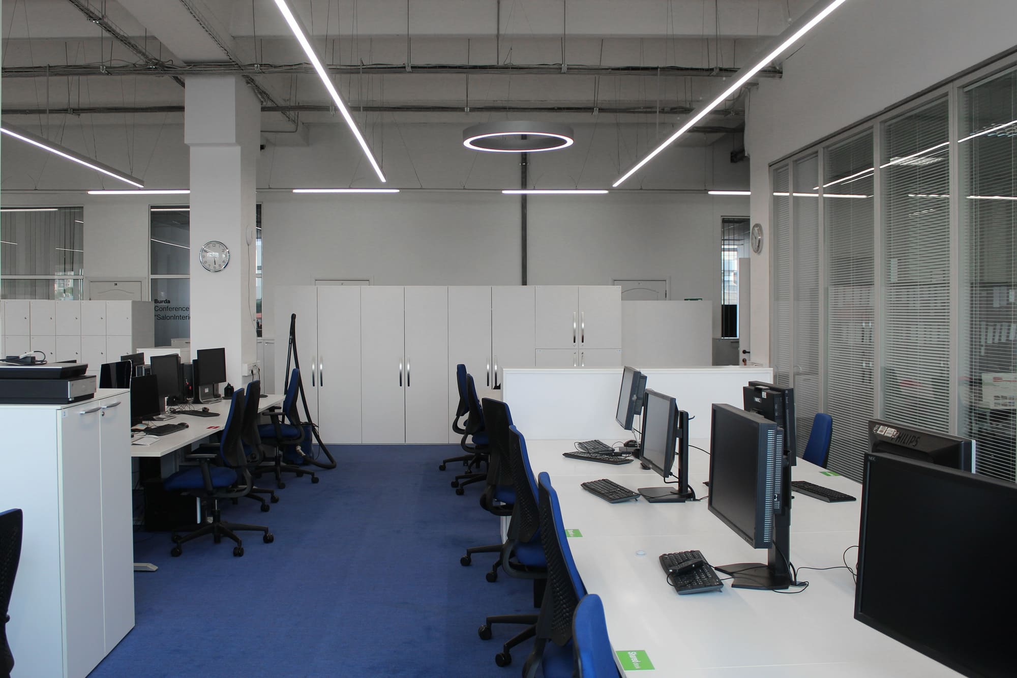 Поставленная задача: освещение открытого (open space) офисного пространства. Для заказчика были важны современный дизайн светильников, отсутствие слепящего эффекта и возможность соединять светильники в одну линию.