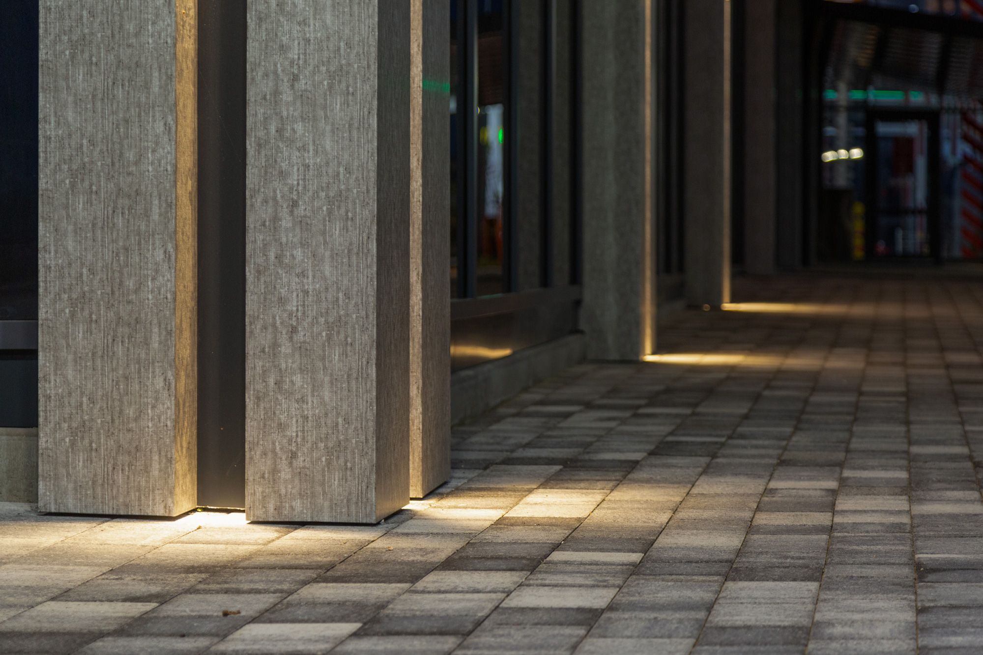 Согласно этим материалам светотехнический отдел PromLED подобрал оптимальное решение как для заливки светом козырька кафе, так и для подсветки колонн.