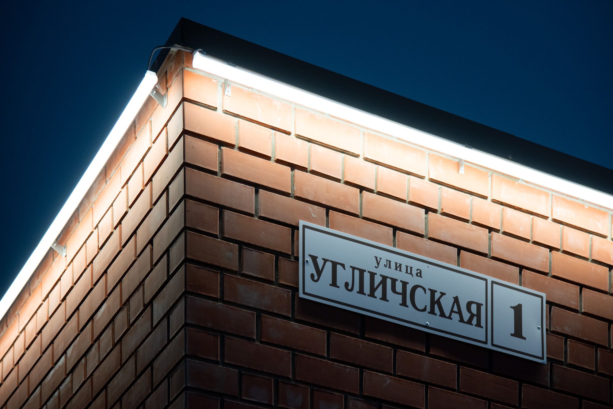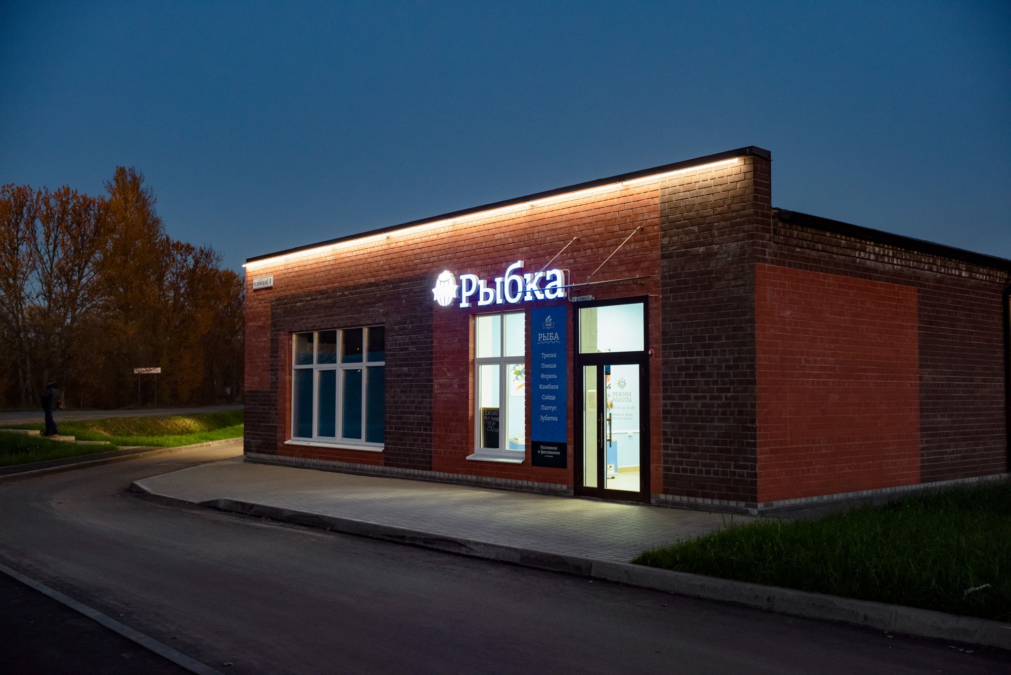 серии «Модерн» для архитектурного освещения фасада магазина и светильников серии «Прожектор Нео» для освещения прилегающей парковки.