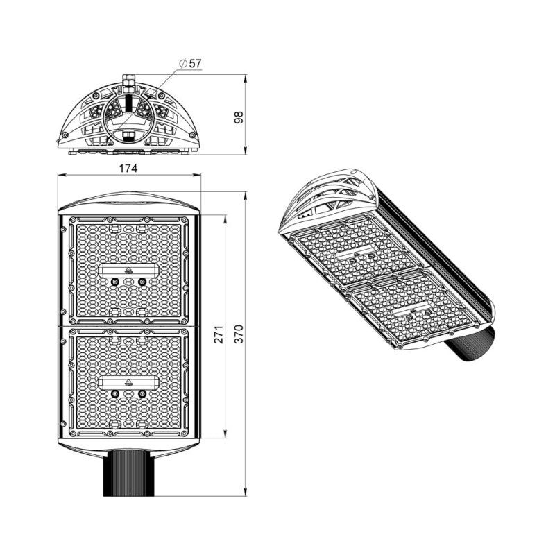 Светильники крепятся на консоль круглого сечения диаметром до 57 мм. Данная серия не имеет возможности регулировки угла наклона светильников.