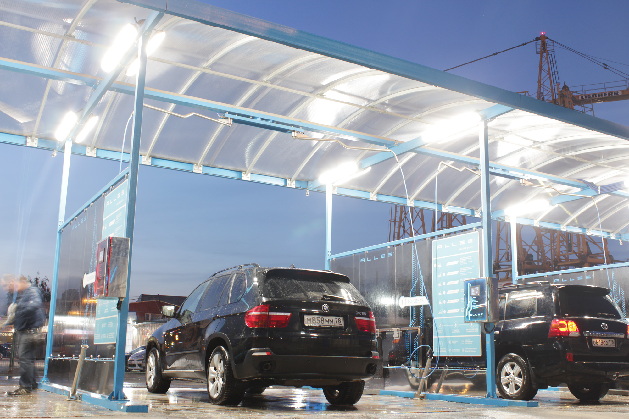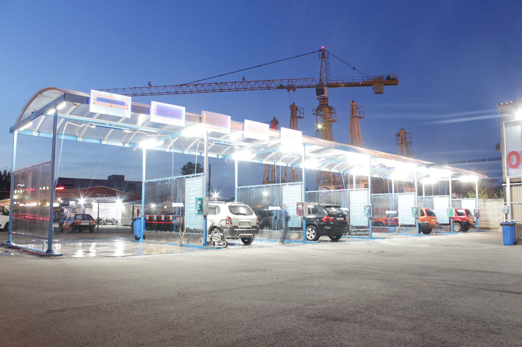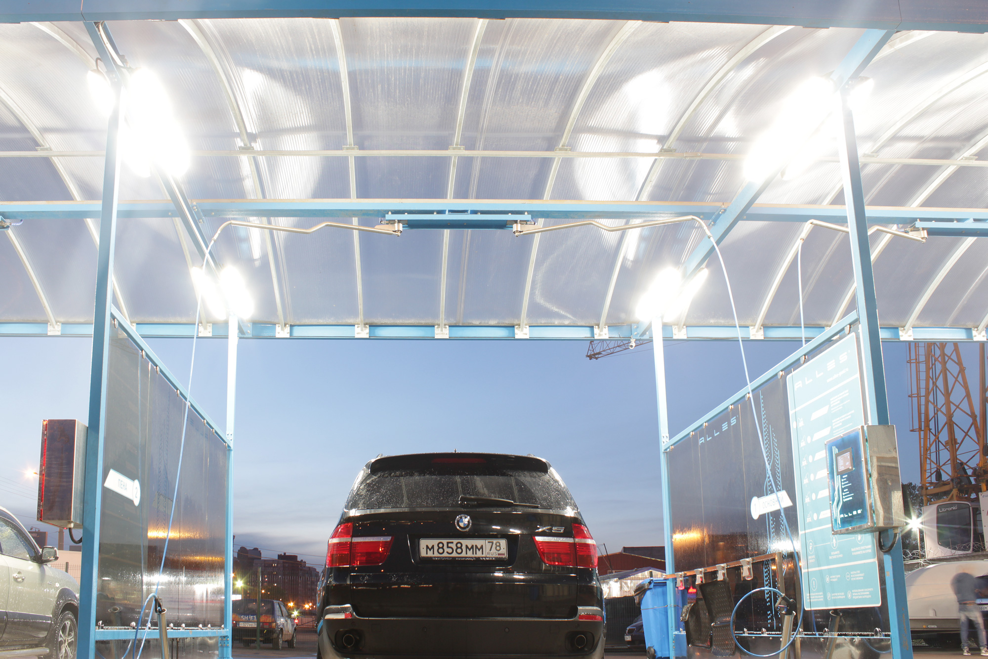 Предложенное осветительное решение: На мойке самообслуживания люкс класса "ALLES" в Санкт-Петербурге установлены светильники Айсберг 60 1250мм 4000К Опал для более мягкого свечения. В каждом боксе установлено 4 светильника.