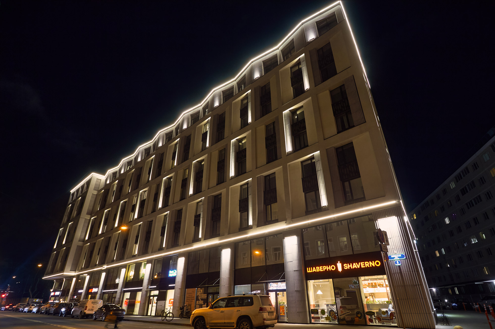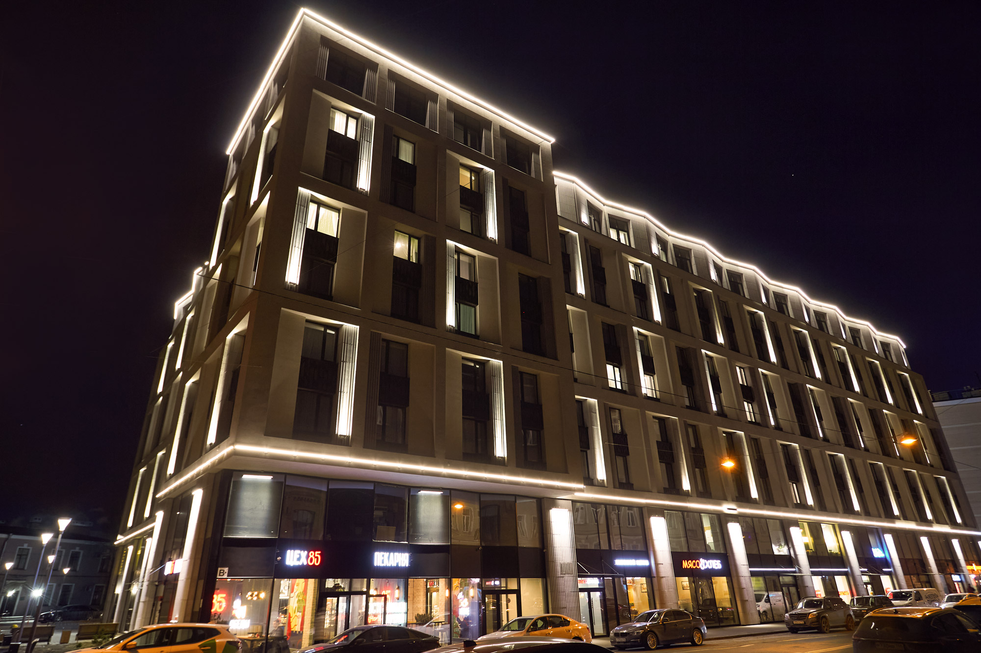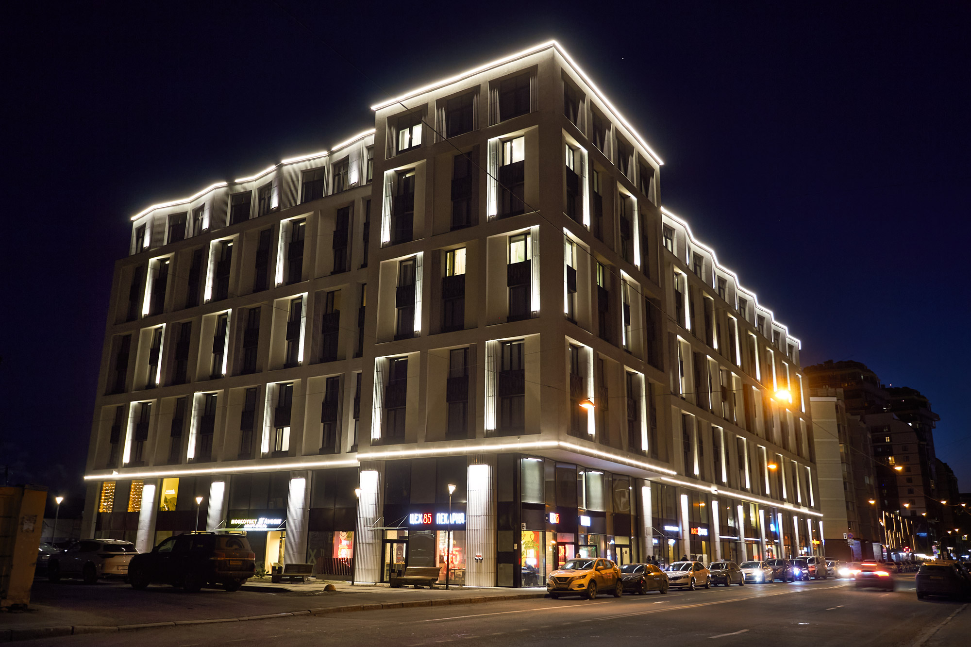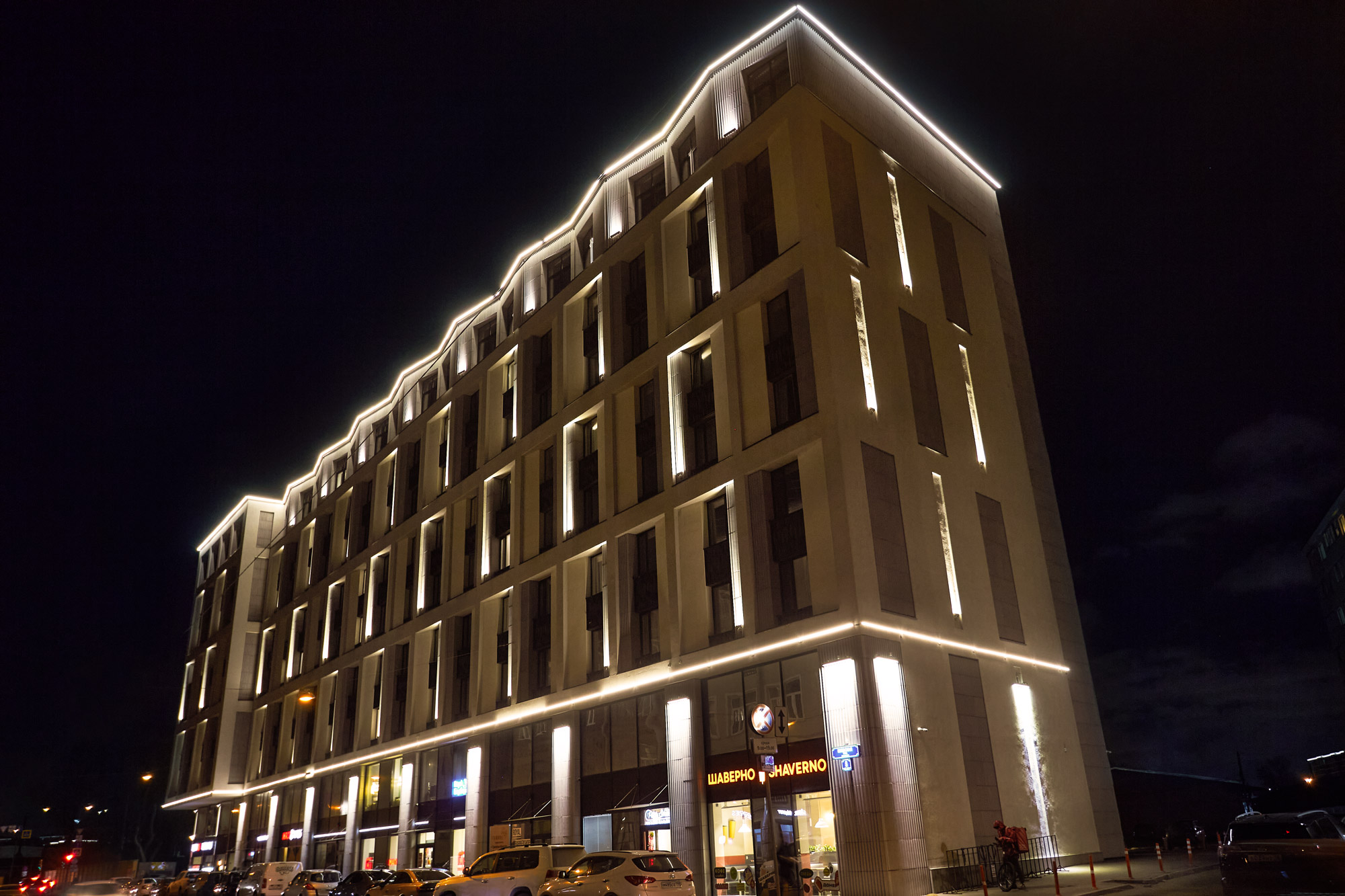 выполнить архитектурно-художественную подсветку апарт-комплекса.