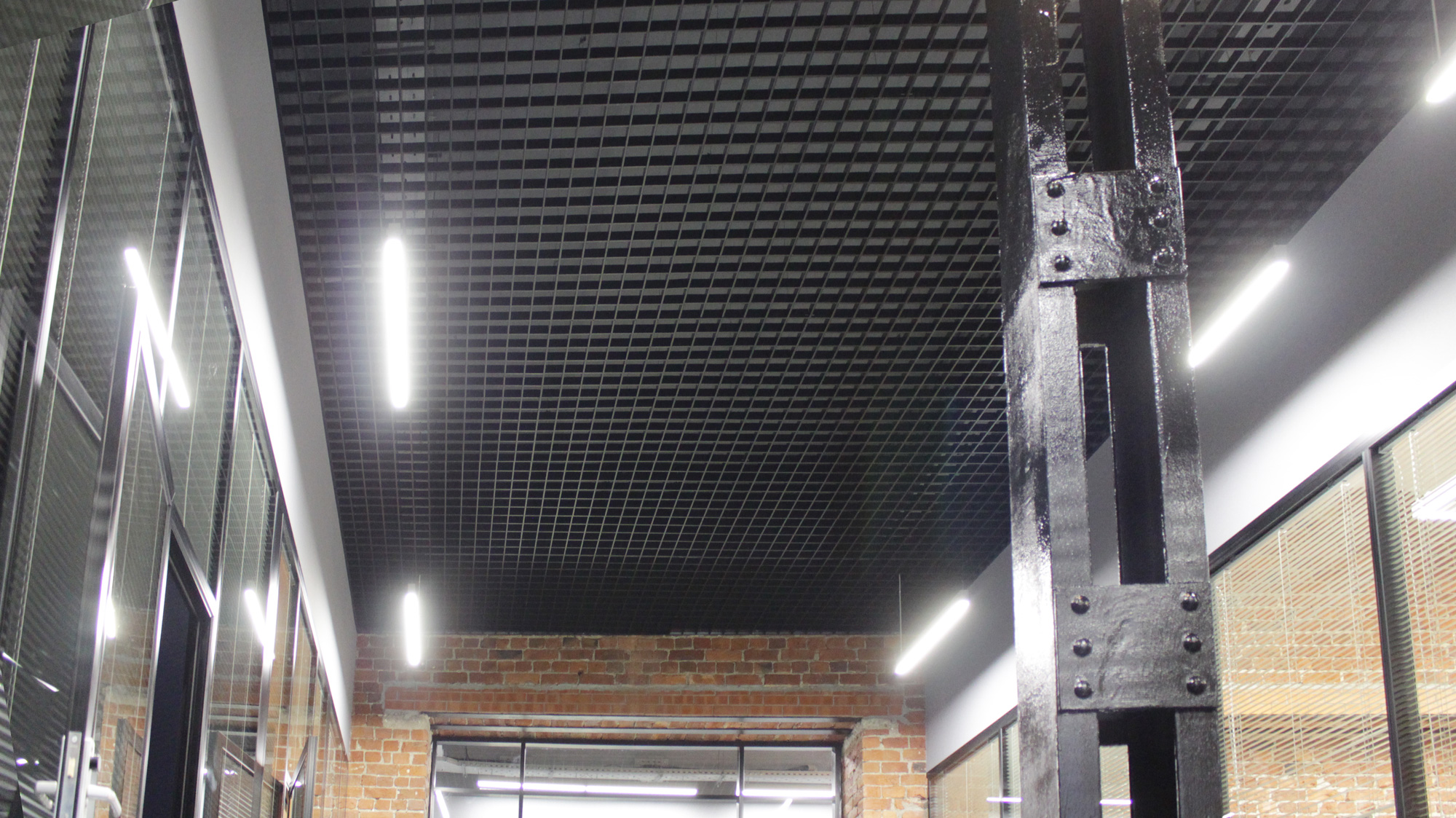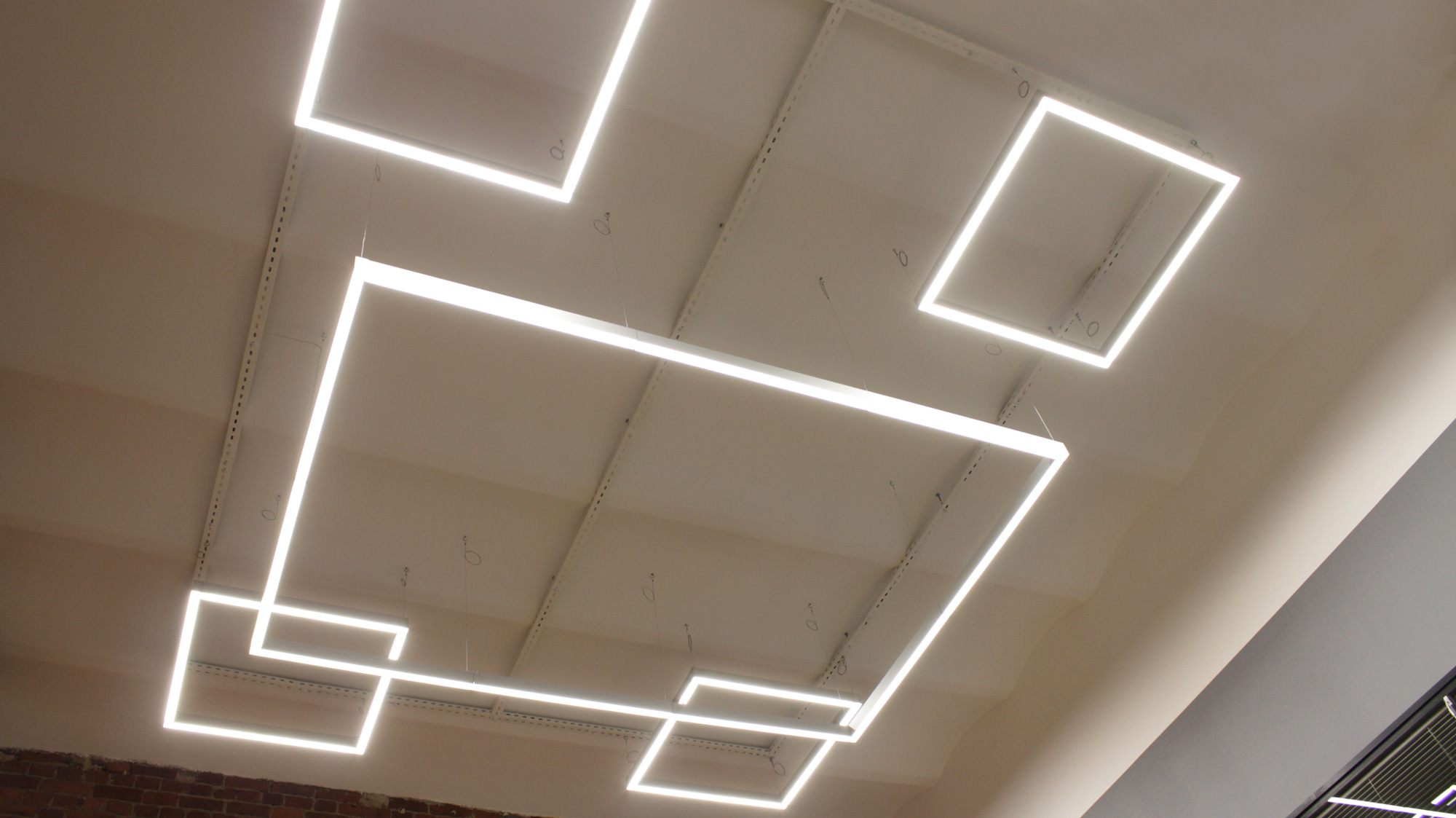 Совместно с дизайнерами проекта были разработаны геометрические световые фигуры из светильников ПромЛед Элегант-20 и Элегант-30 Экстра и применены нестандартные решения расположения светильников по периметру кабинетов.