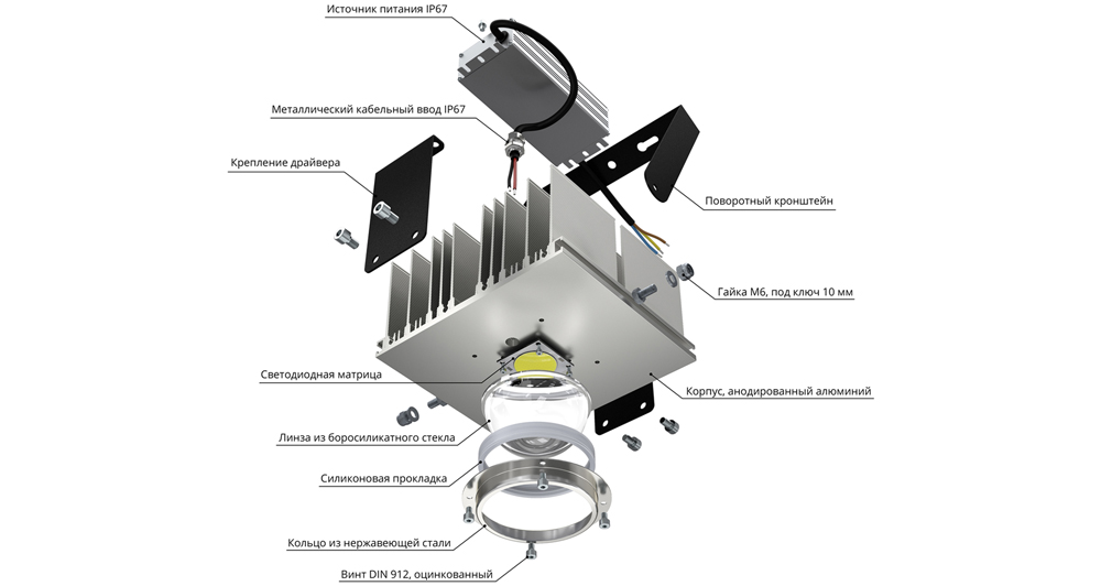 - Защищенность светильника на уровне IP 67, что позволяет использовать его практически в любых климатических зонах и агрессивных средах;
