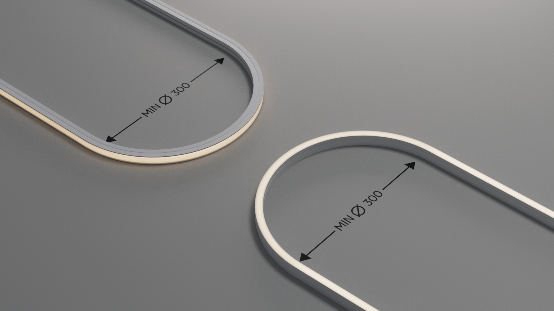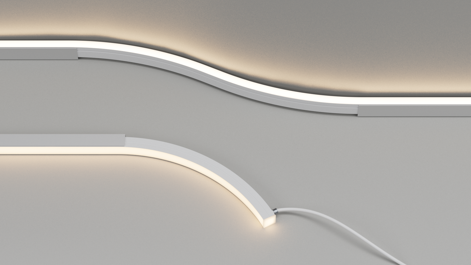 Корпус позволяет устанавливать светильники на поверхностях сложной геометрии, огибать их по радиусу (минимальный радиус изгиба — 150 мм) и создавать различные световые линии.