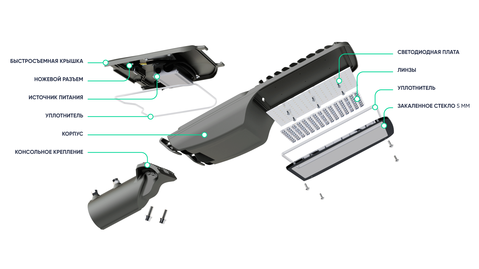 Конструкция корпуса позволяет открывать отсек коммутации без дополнительных инструментов прямо на месте установки светильника и производить быструю замену драйвера.