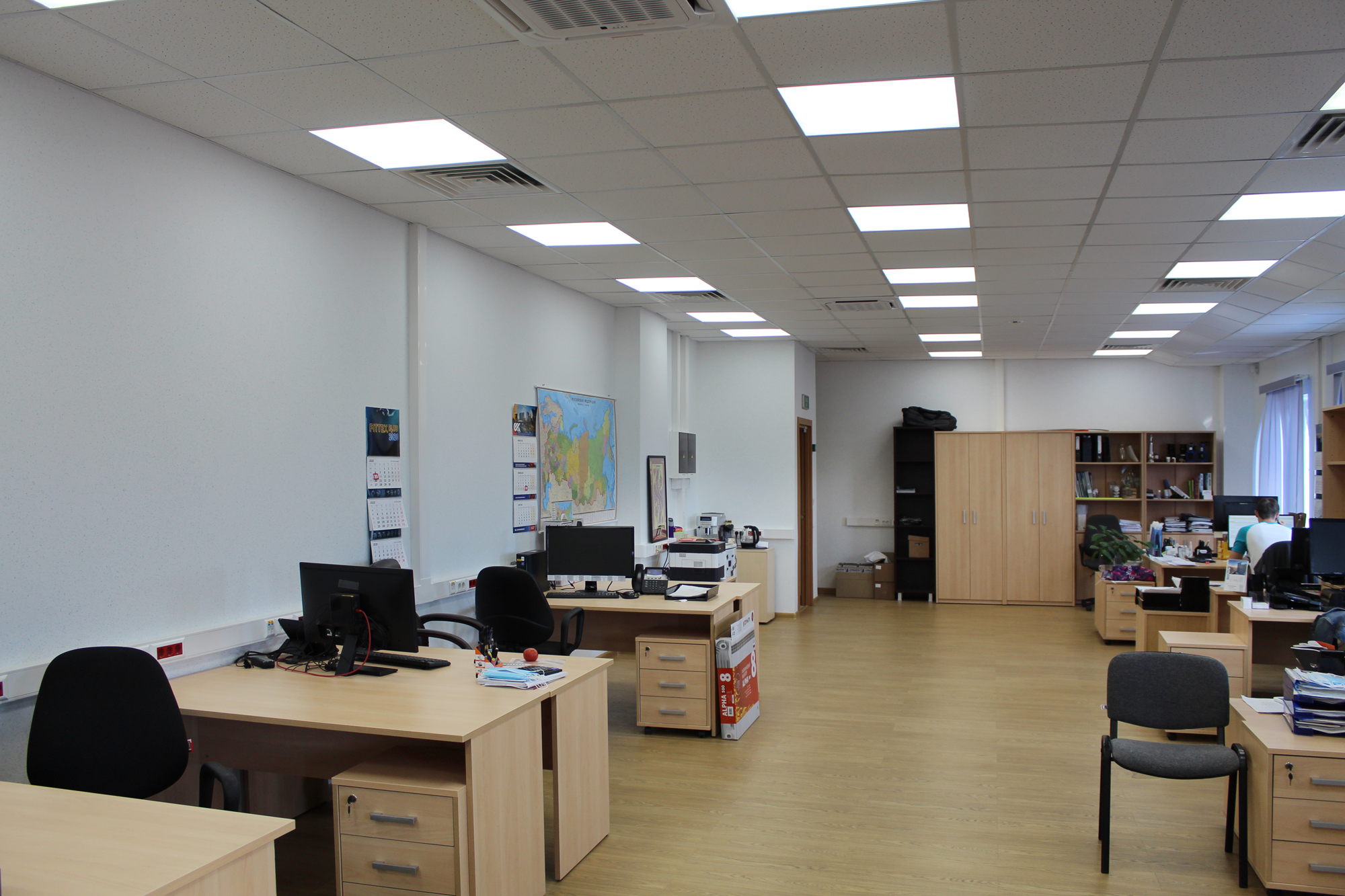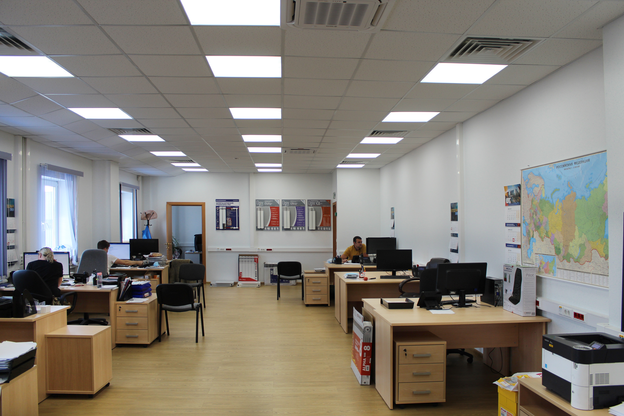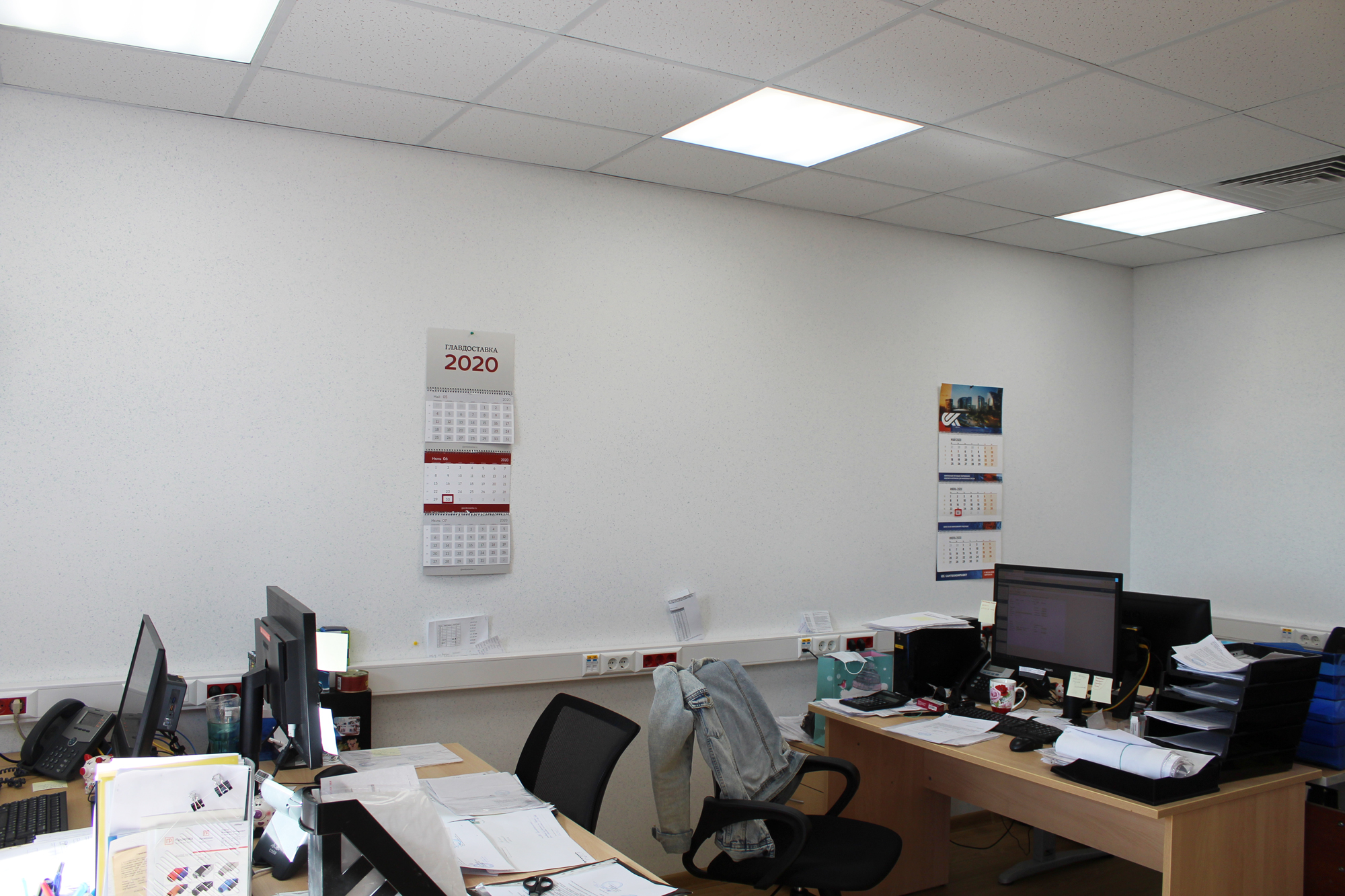 Предложенное осветительное решение: Установили светодиодные светильники ПромЛед Офис 30 ЭКО 5000К Опал в количестве 190 штук для освещения офисных помещений и ПромЛед Айсберг v2.0 40 1200мм 5000К Опал в количестве 20 штук для освещения лестничных пролетов