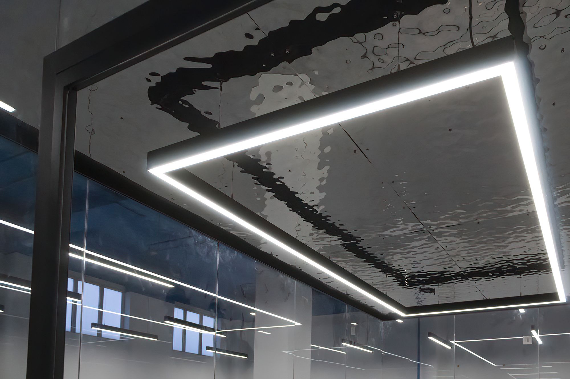 Особенности проекта: использовались нестандартные формы сборки светильников «Элегант» - два прямоугольника 4500х2000 мм и 3000х1500 мм.