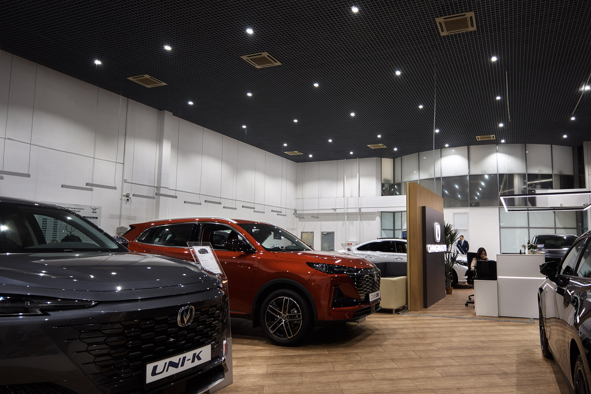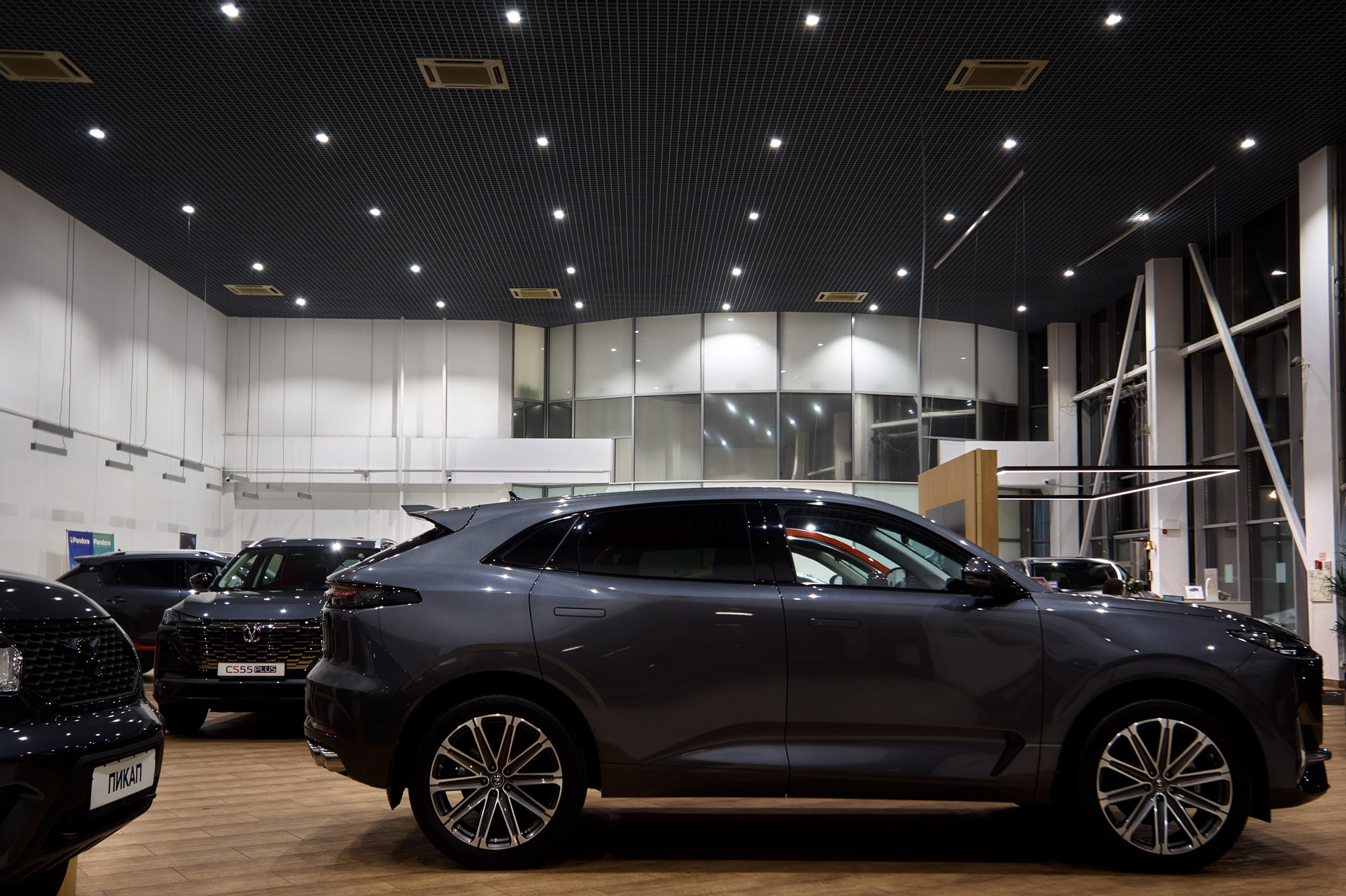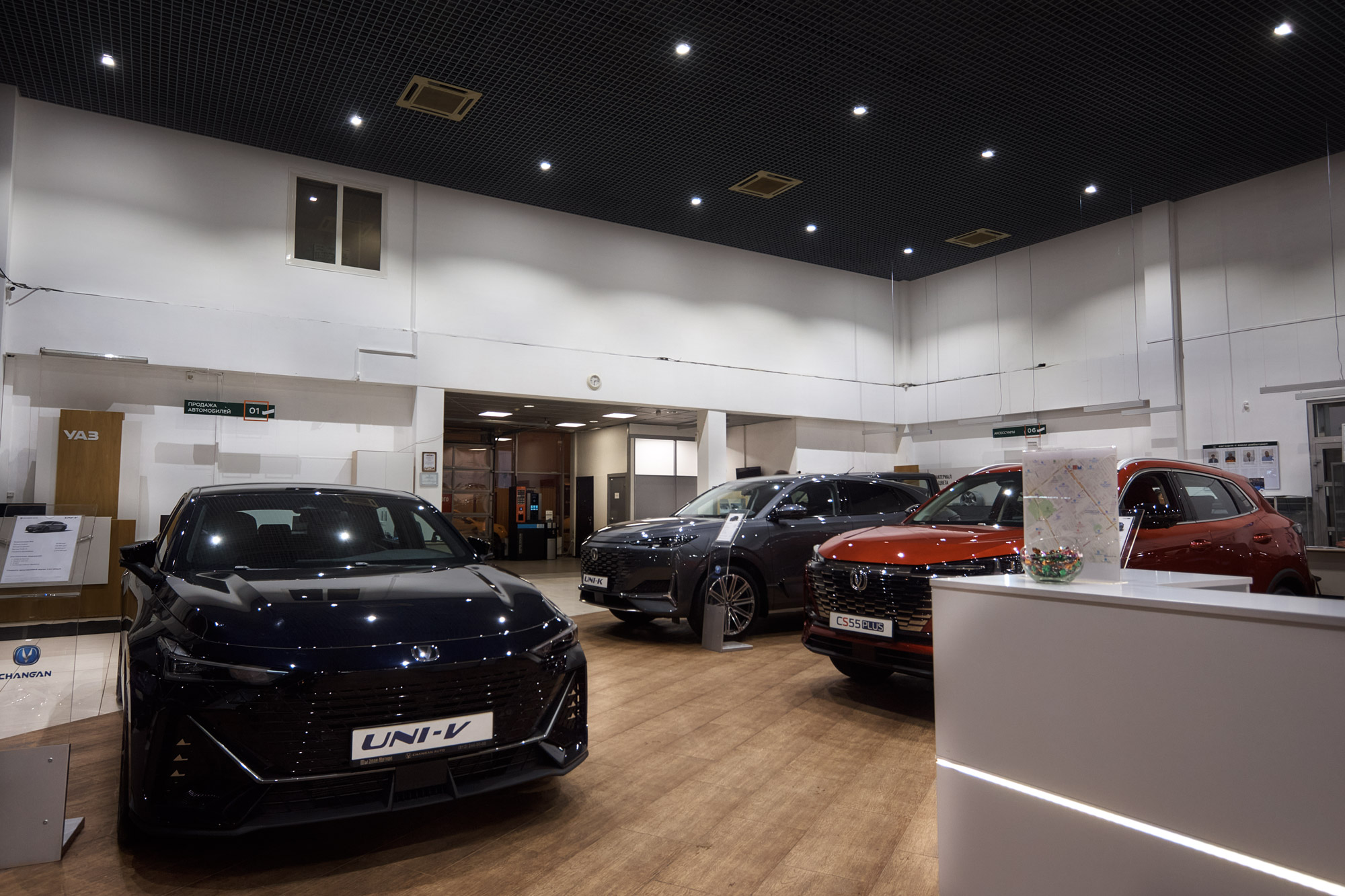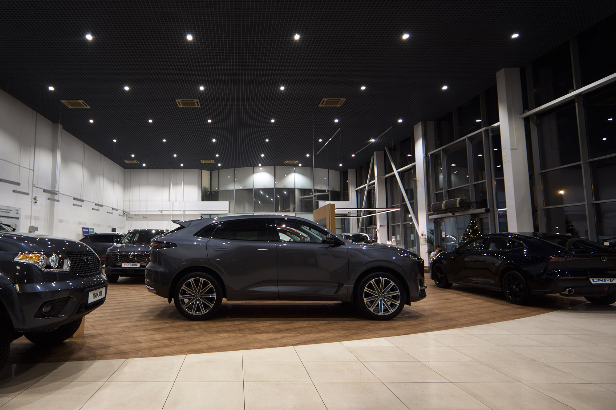 выполнены светотехнические расчеты и предоставлены чертежи интеграции светильников серии «Профи v2.0» в потолок «грильято». Для акцентного освещения зоны демонстрации автомобилей и рабочих мест были предложены светодиодные светильники серии «Элегант» с креплением на трос.