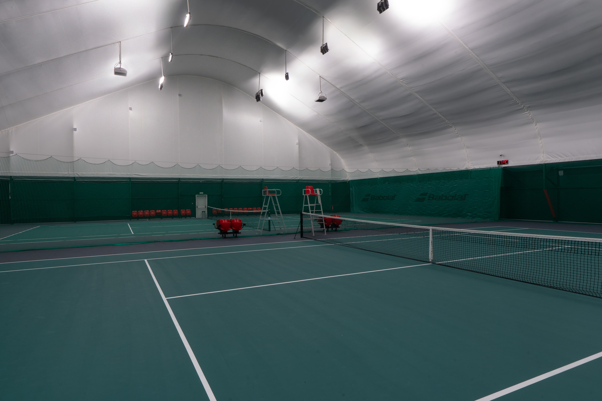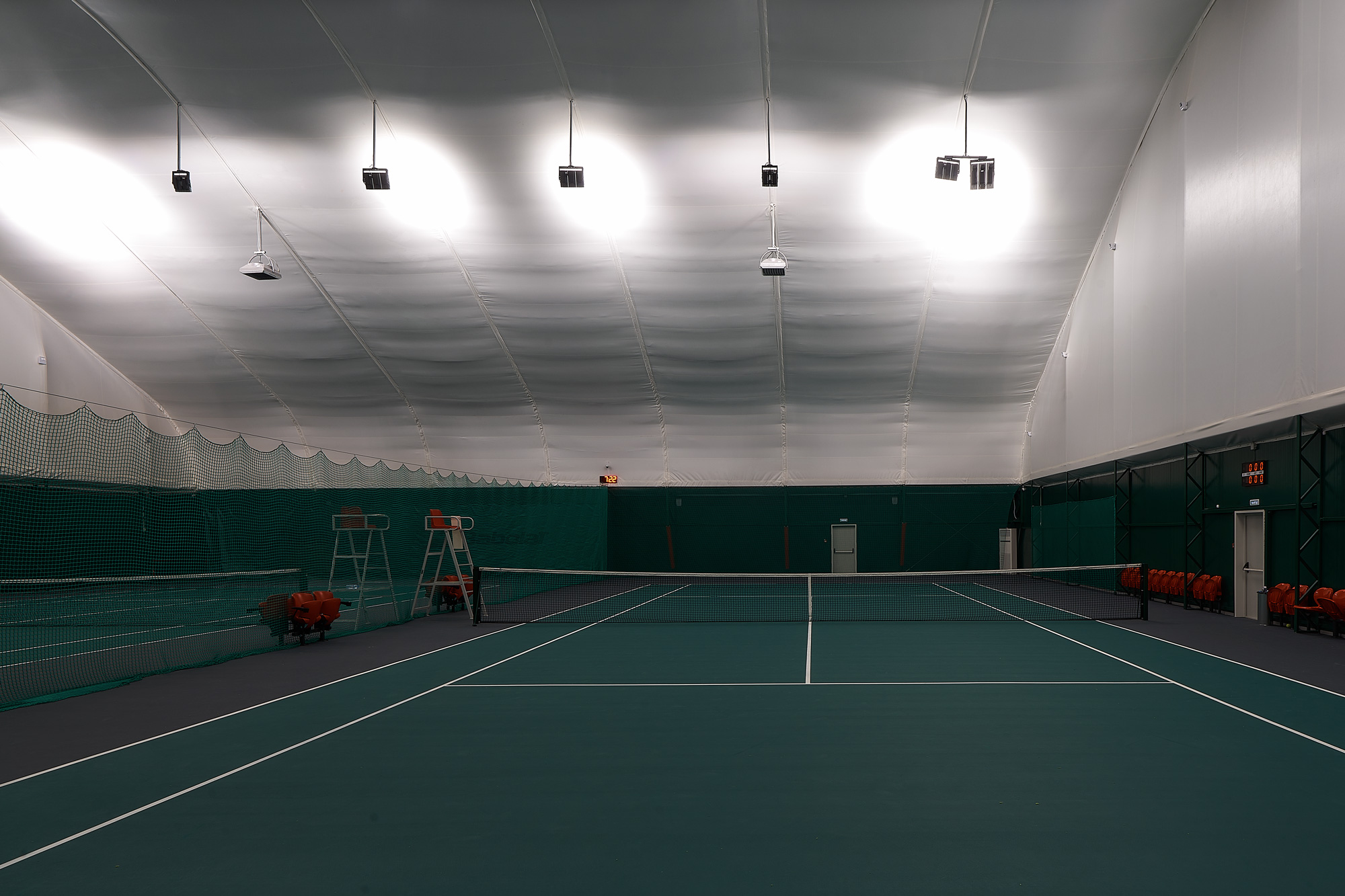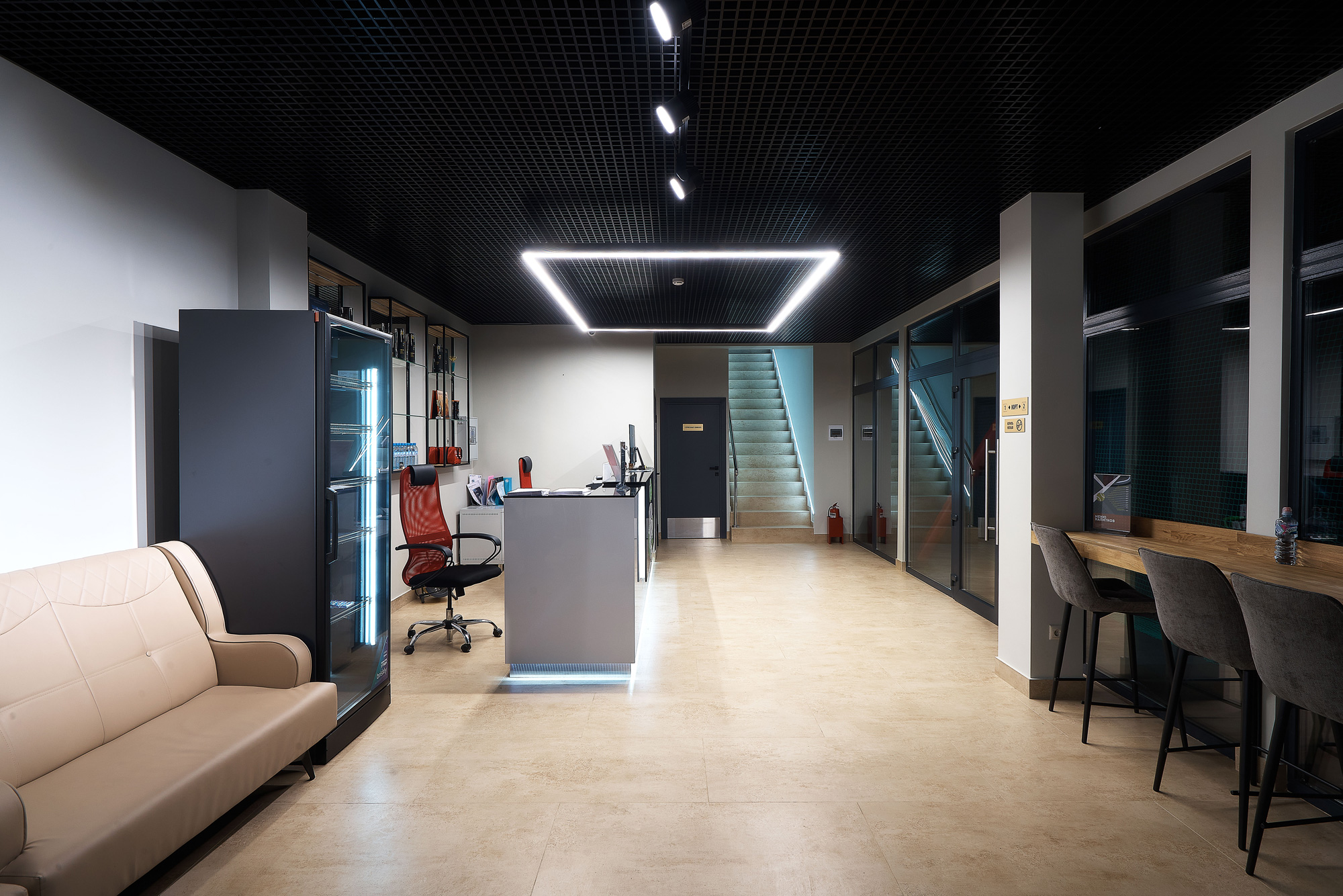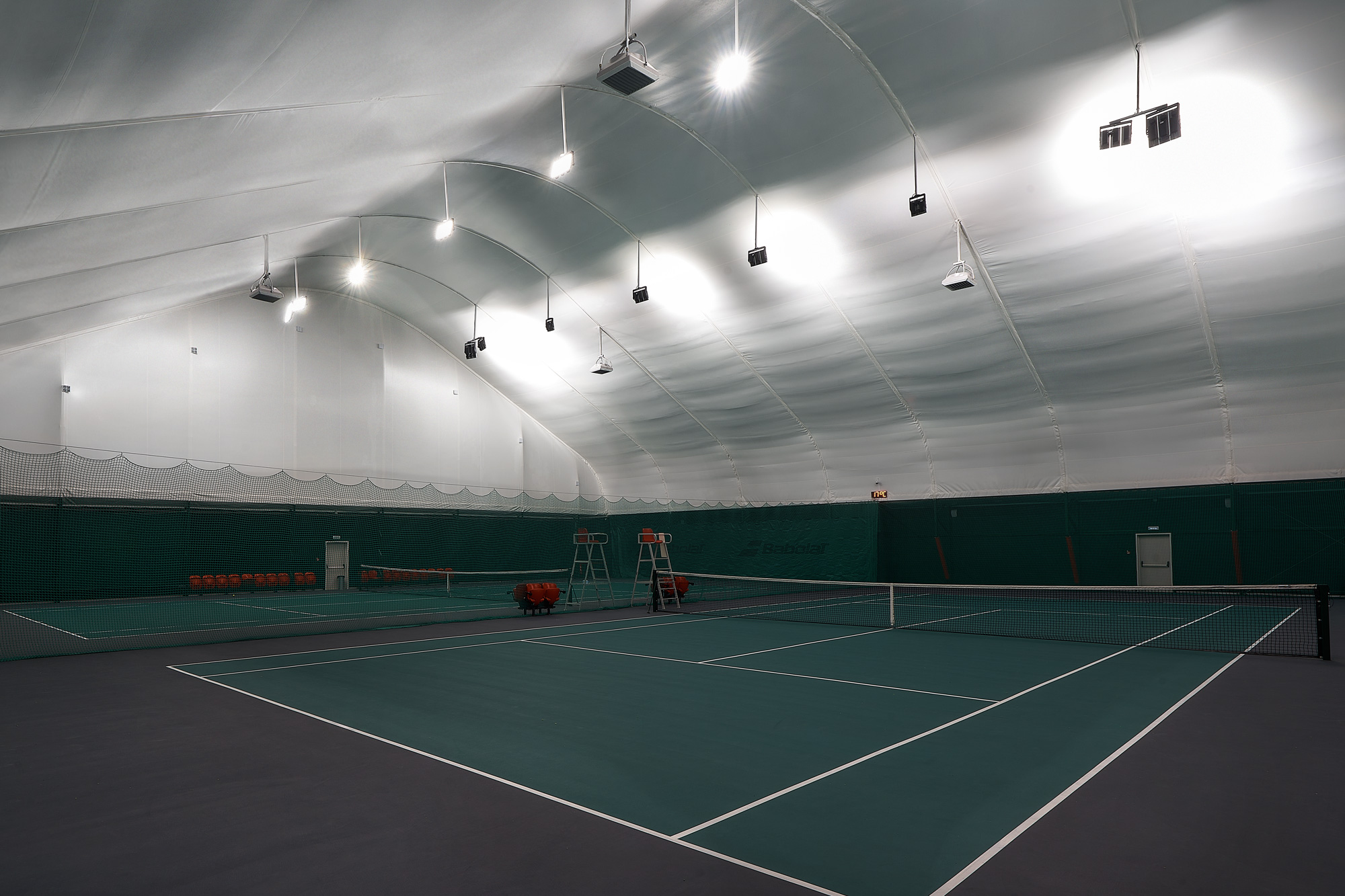 для освещения теннисного корта выбраны светильники серии «Плазма S» с направленным в потолок световым потоком. Использование отраженного света обеспечивает равномерную засветку и исключает ослепленность игроков. В зоне ресепшен размещена конструкция прямоугольной формы из светильников серии «Элегант».