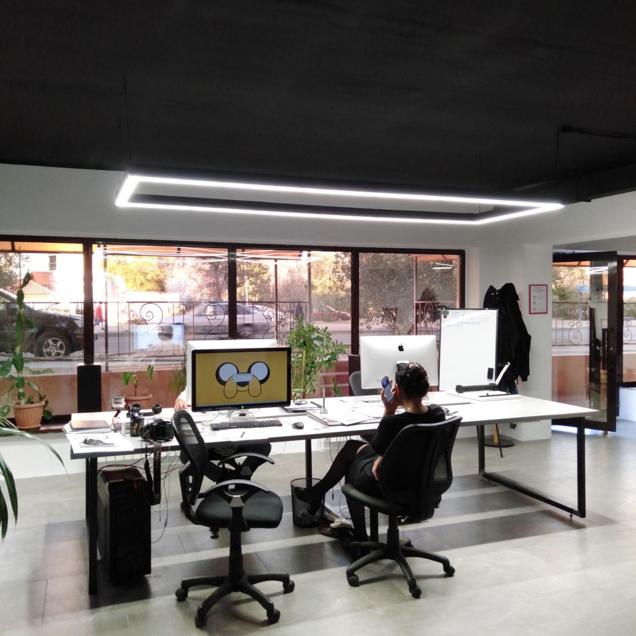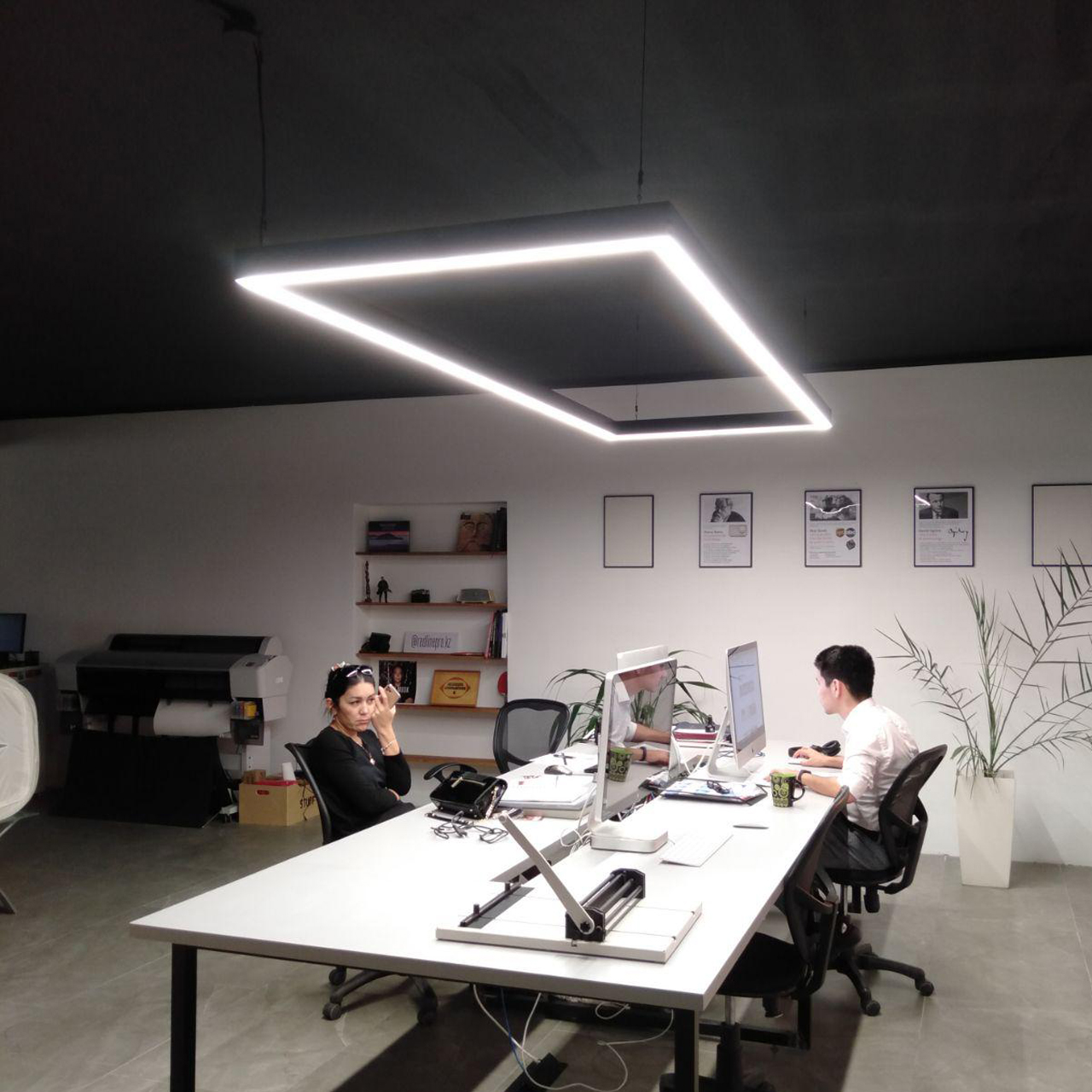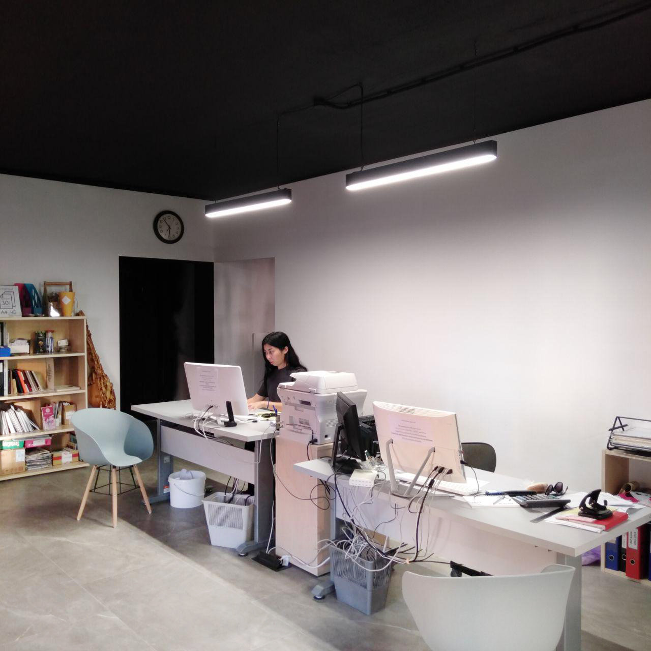 Поставленная задача: Установка дизайнерских светильников в офисное помещение. Согласно проекту необходим был светильник прямоугольной формы, составленный из линейных светильников, а также одиночные линейные светильники. Светильники должны быть чёрного цвета (RAL 9005).