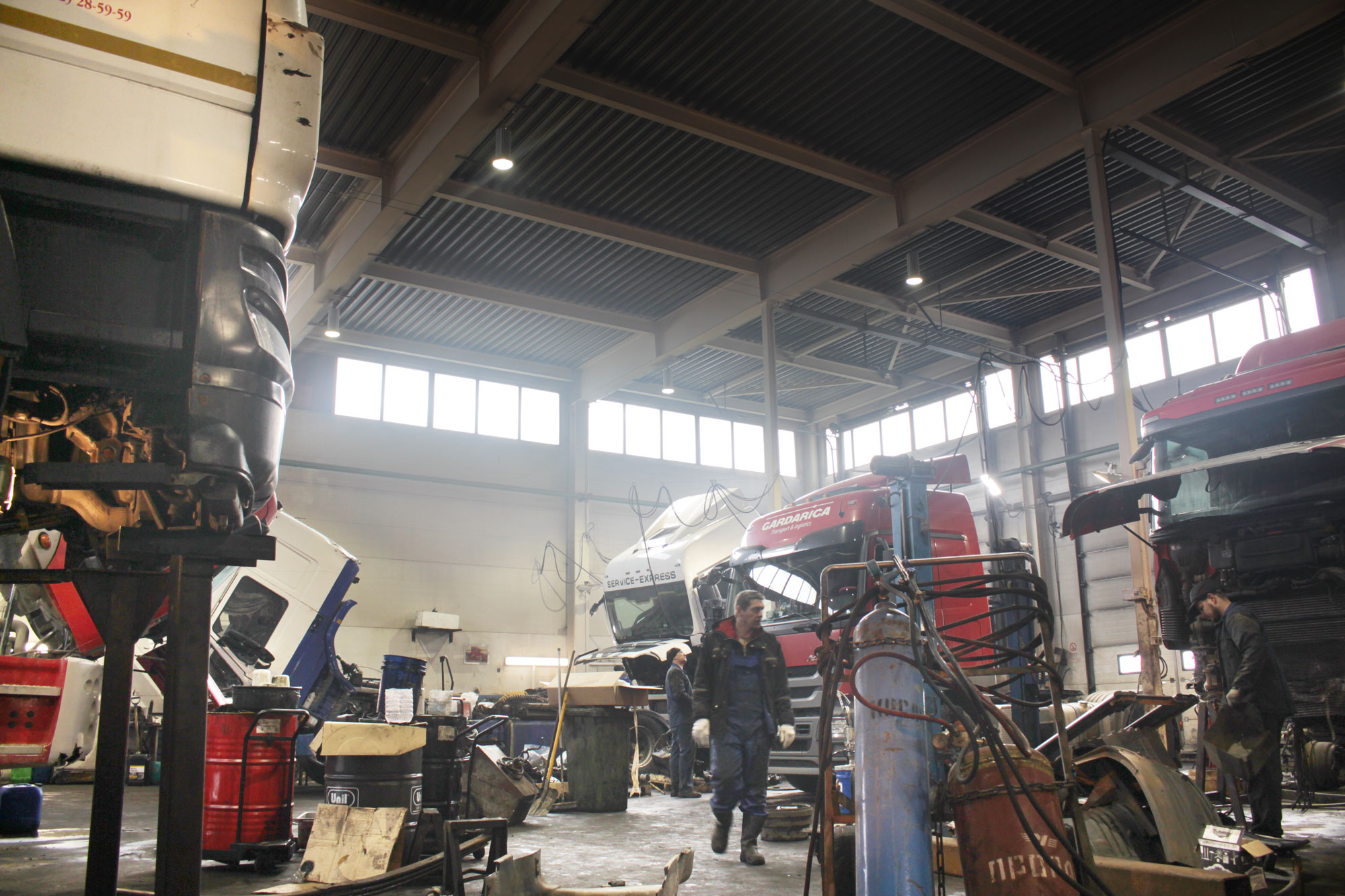 Предложенное осветительное решение: Для освещения ремонтного бокса с высотой потолков 5 метров рекомендованы светодиодные светильники ПромЛед Профи v2.0-120 с оптикой 120 градусов