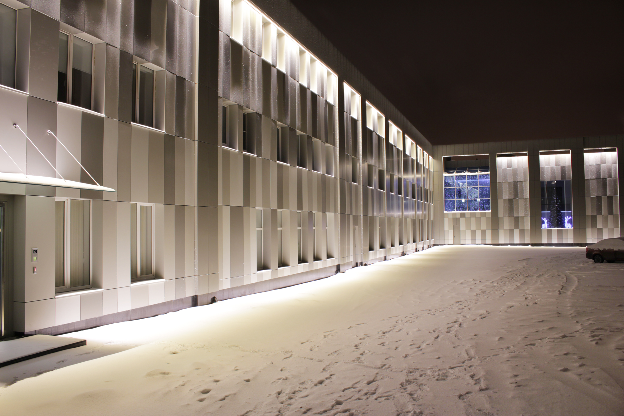 Предложенное осветительное решение: Под данный проект специально были изменены размеры светодиодных светильников ПромЛед Барокко-40-1000 Оптик и Барокко-20-500 Оптик на требуемые под ниши фасадных кассет здания бизнес-центра. Благодаря собственному производству наши специалисты подберут и при необходимости разработают оптимальное решение для любой поставленной задачи, как это быо сделано для текущего проекта.