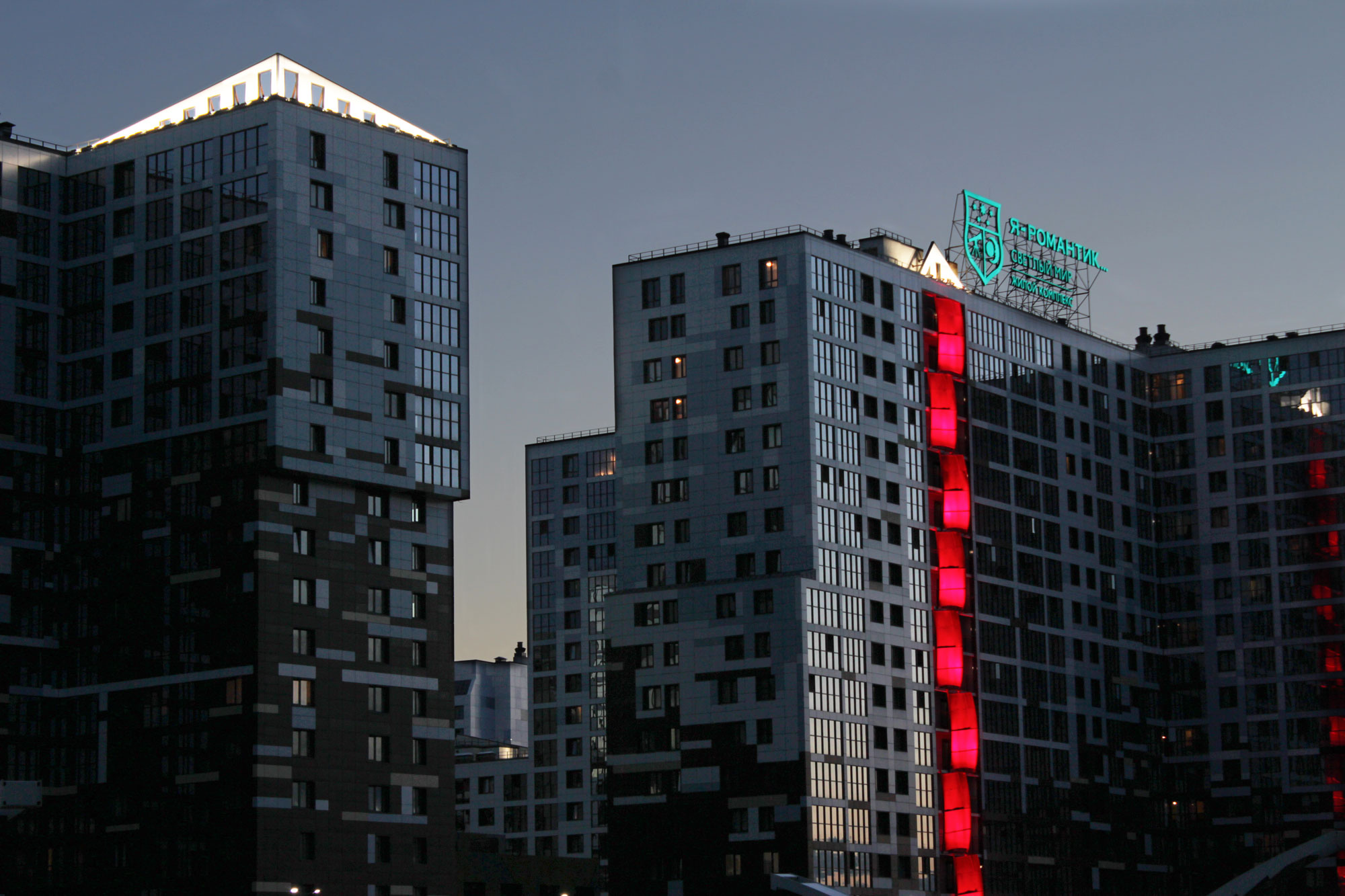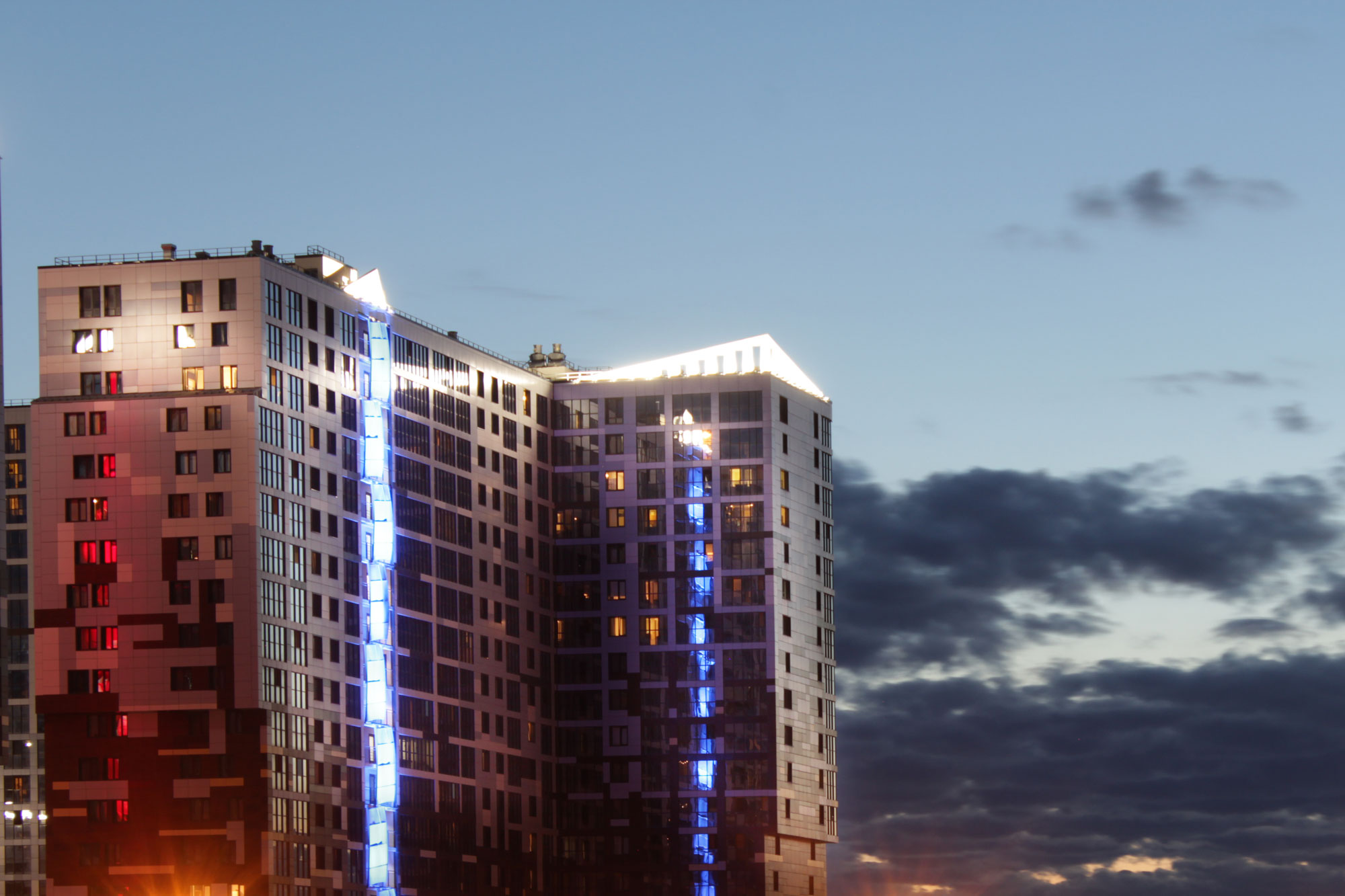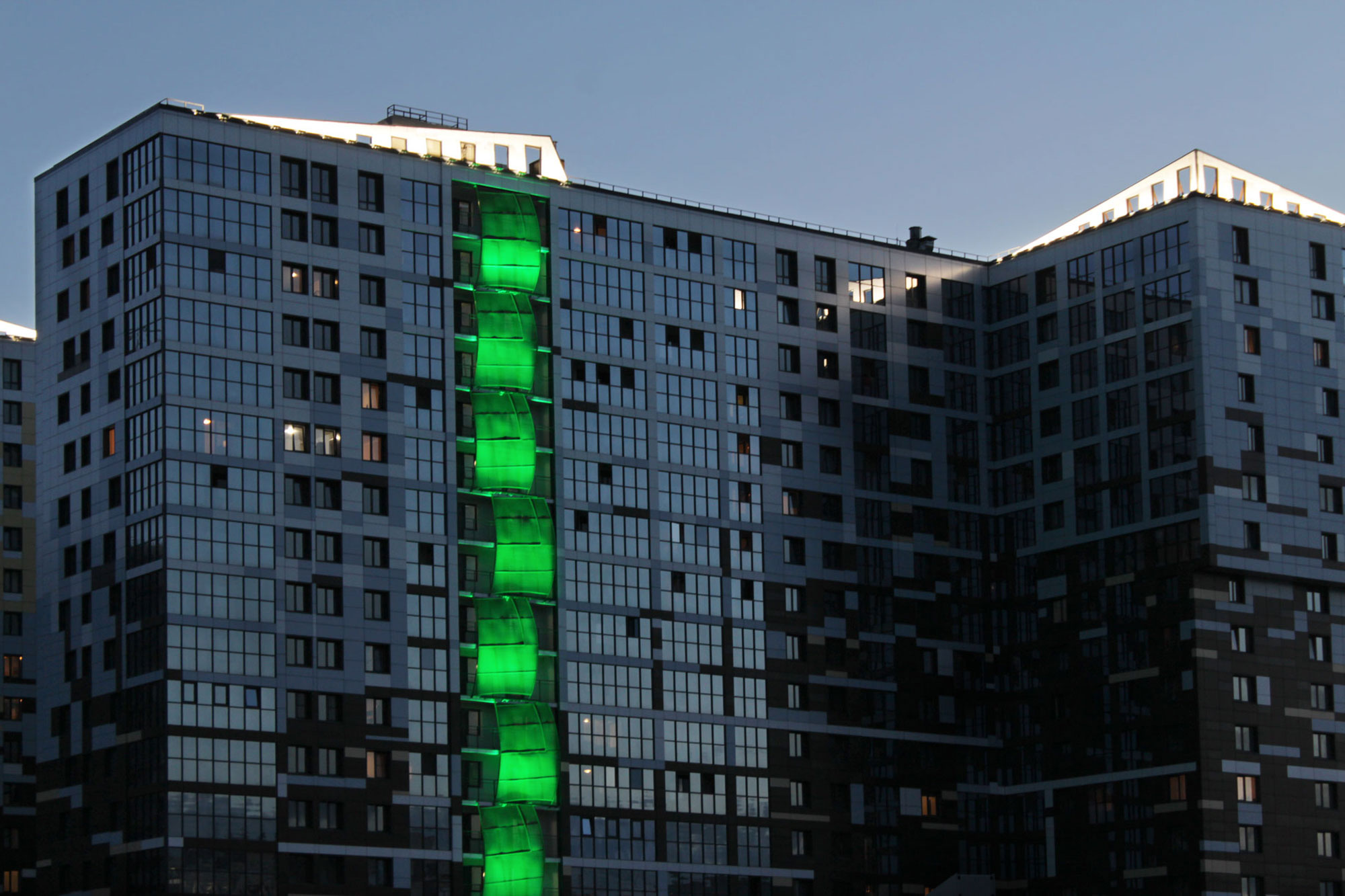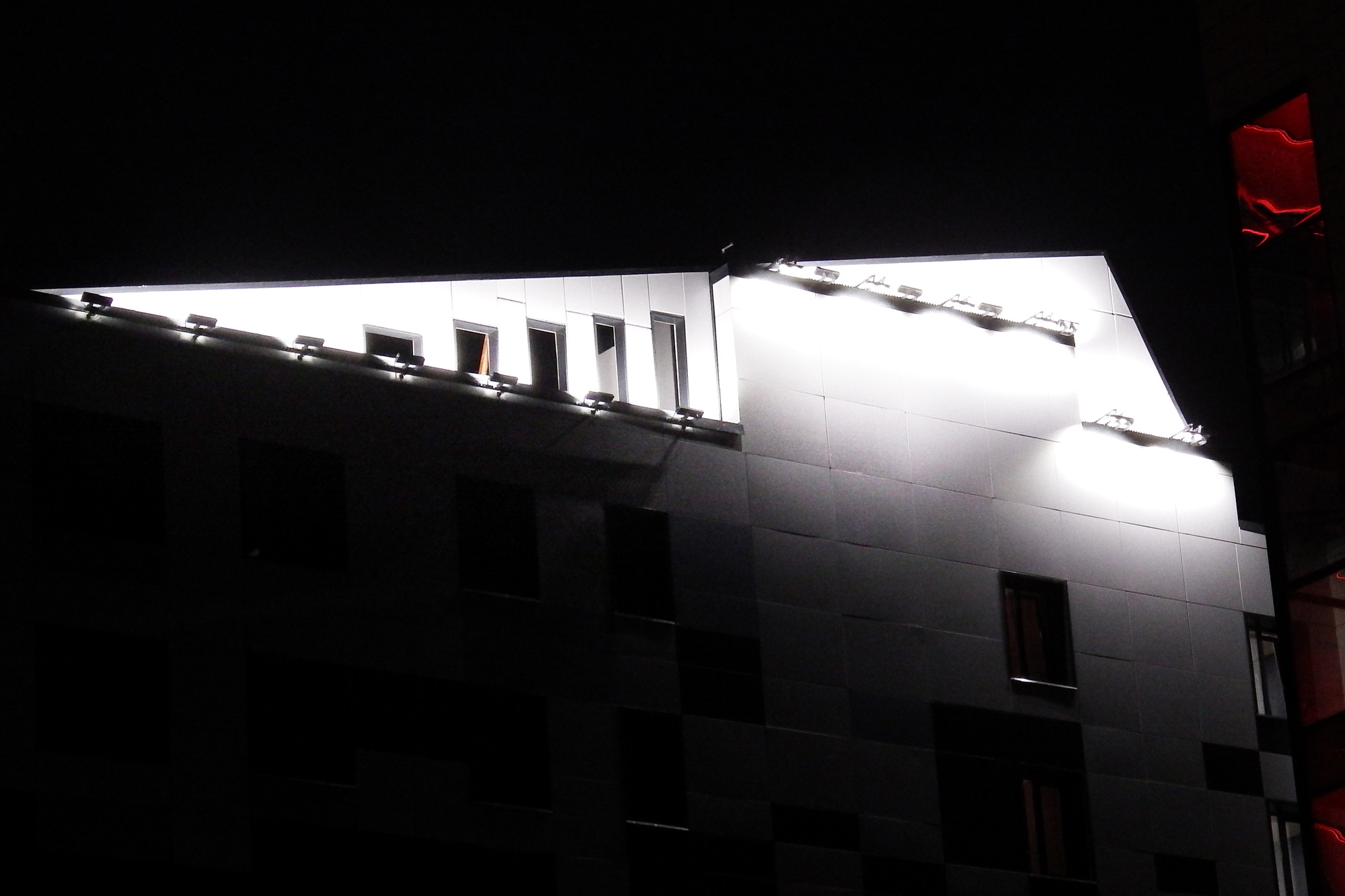Предложенное осветительное решение: Установили светодиодные светильники ПромЛед Магистраль v2.0-100 с линзой 130*80 градусов и цветовой температурой 4500К. Конструкция светильников была изменена - каждый светильник имел два вывода провода питания, соединенного коннекторами (IP67) в линейные группы по 5-10 светильников. Также отдельно разрабатывался и применялся специальный кронштейн, учитывающий архитектурный особенности фасада и стоящей светотехнической задачи