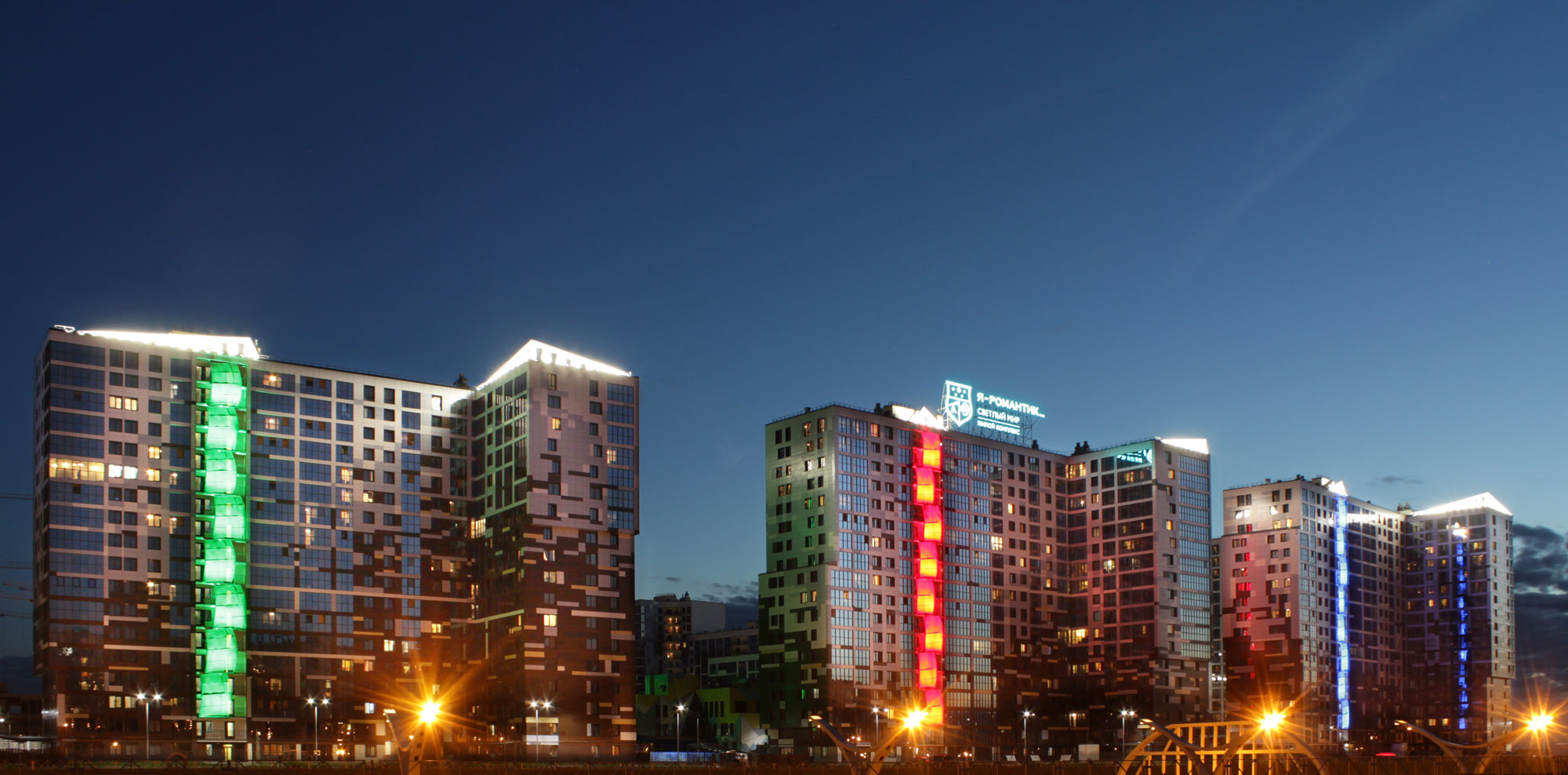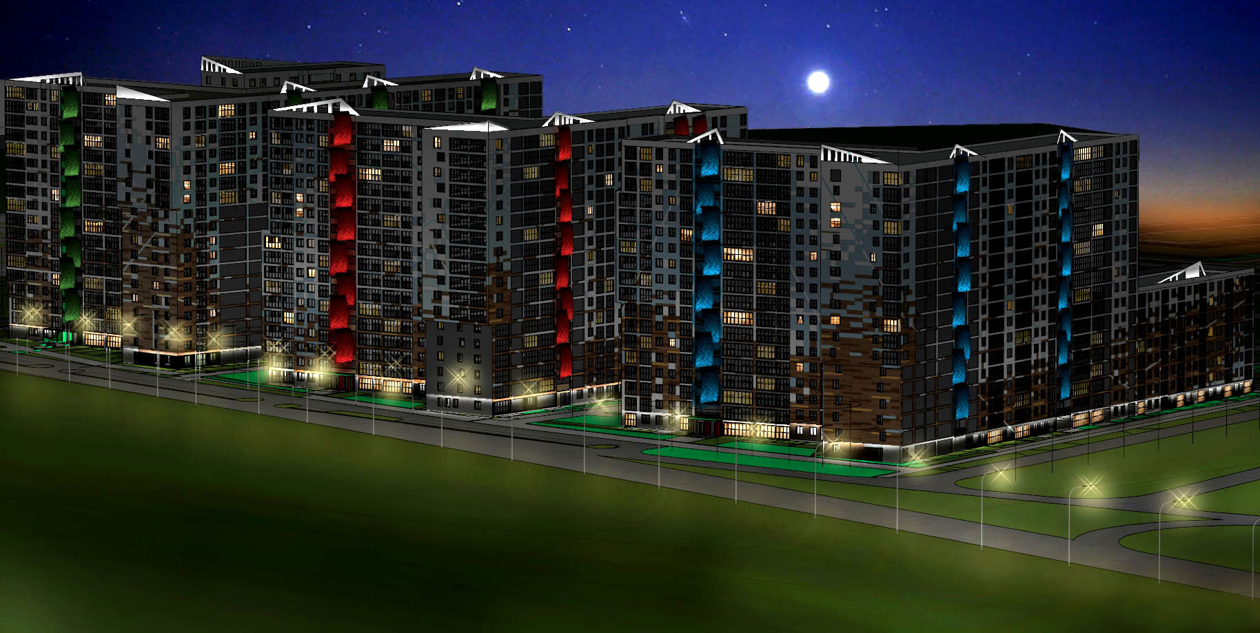 Поставленная задача: Выделить архитектурные особенности зданий ЖК «Светлый Мир Я-Романтик...», на верхних ярусах акцентные конструкции из легких материалов - «треугольники»