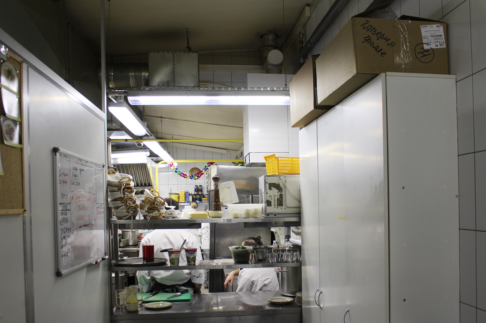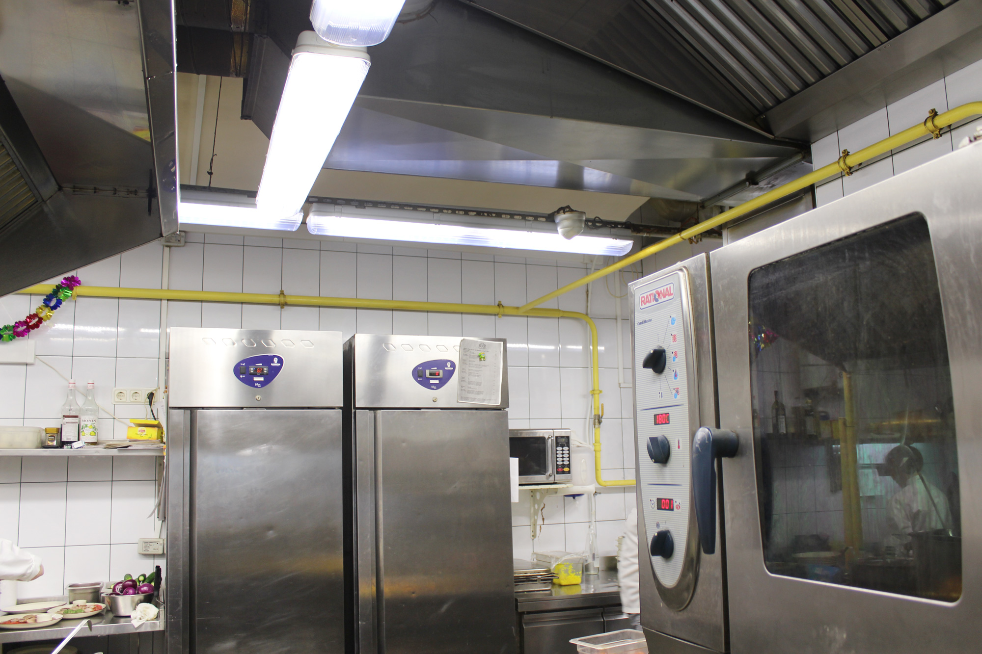 Управляющий рестораном «Таверна Гролле», который расположен по адресу г. Санкт-Петербург, Большой проспект Васильевского острова 20, обратился в нашу компанию с целью освещения кухни. Шеф-повар выразил пожелания добиться хорошей освещенности в общем по помещению, а так же дополнительно осветить рабочие места в зоне приготовления. После изучения помещения и построения проекта освещения нашими специалистами был предложен светодиодный светильник ПромЛед Айсберг-40. Монтаж был произведен по всему периметру кухни и в зоне выдачи блюд.