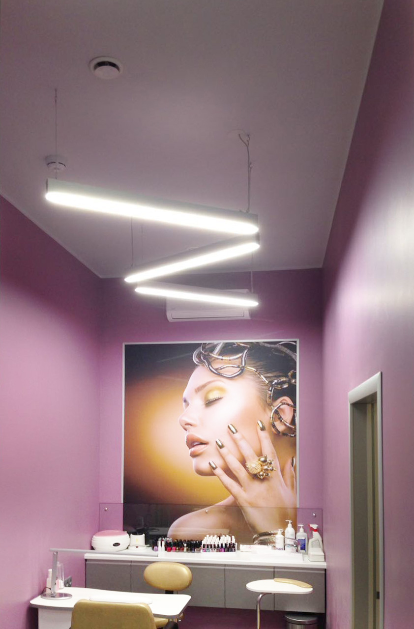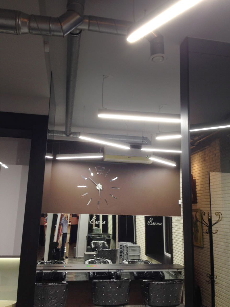 В начале ноября в нашу компанию обратился представитель салон красоты «Елена». Данный объект расположен в городе Тосно. Строительство салона подходило к концу и появилась необходимость в качественном и стильном освещении. После переговоров было принято решение по установке светильников ПромЛед Элегант-40. Данные светильники дают не только яркий и равномерный свет, но и имеют несколько видов соединений, с помощью которых можно выстраивать разнообразные сложные конструкции под разными углами.