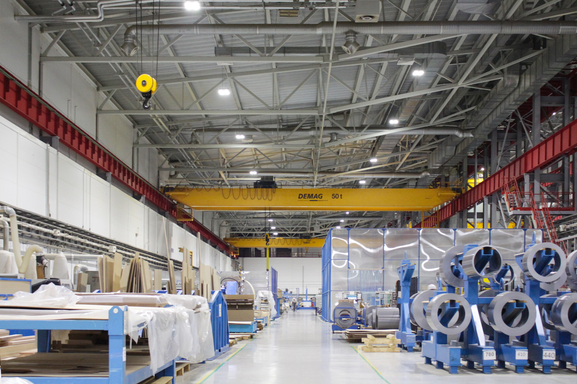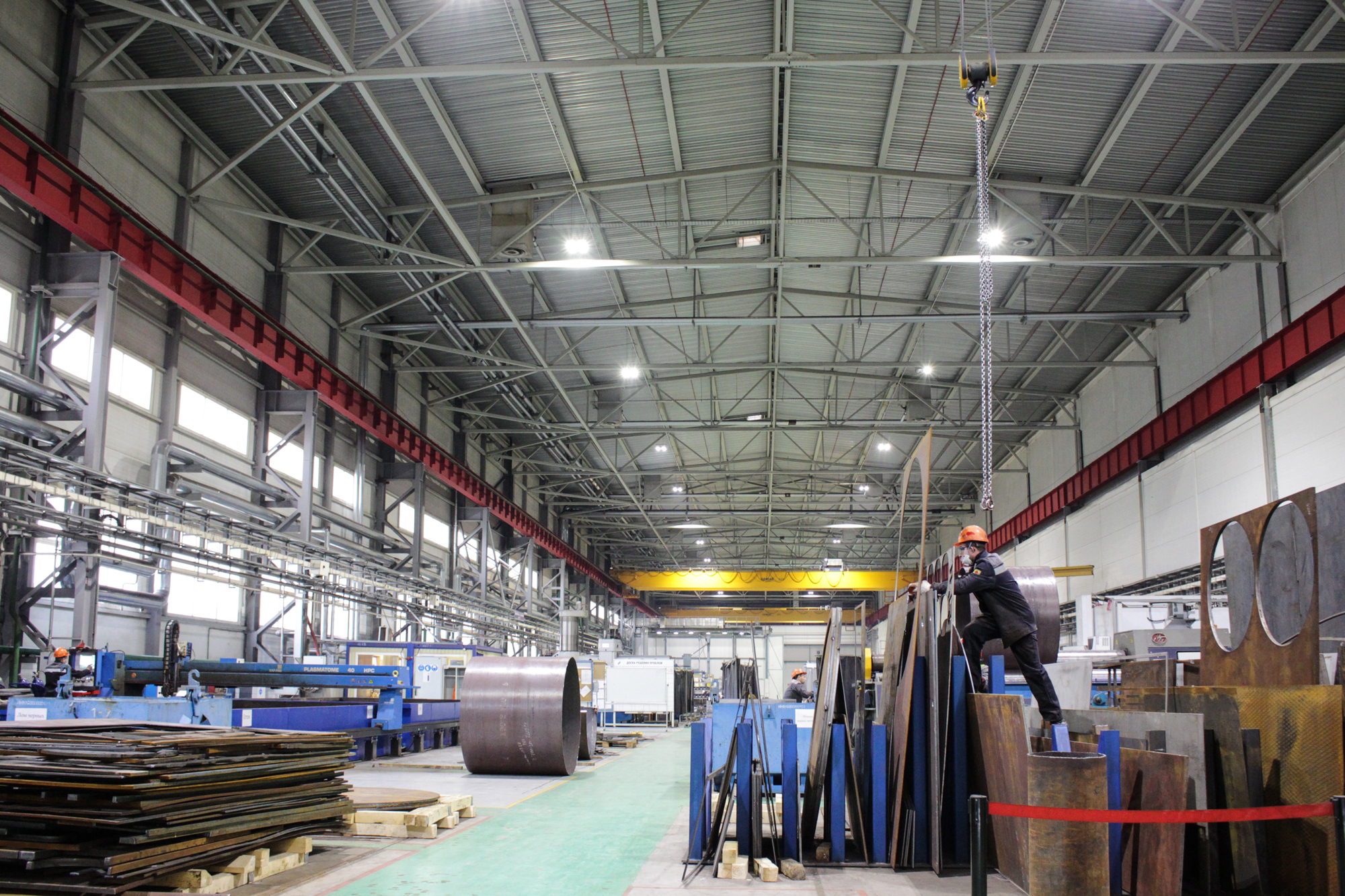 Предложенное осветительное решение: Инженеры нашей компании специально под проект разработали светильник на базе модели Профи v3.0 Мультилинза, состоящий из четырех модулей. Светильник мощностью в 600Вт выдает световой поток 102000Лм. Светильники установлены в пролётах в два ряда на высоте 28 метров. Средняя освещённость производственных помещений составляет 300 люкс.