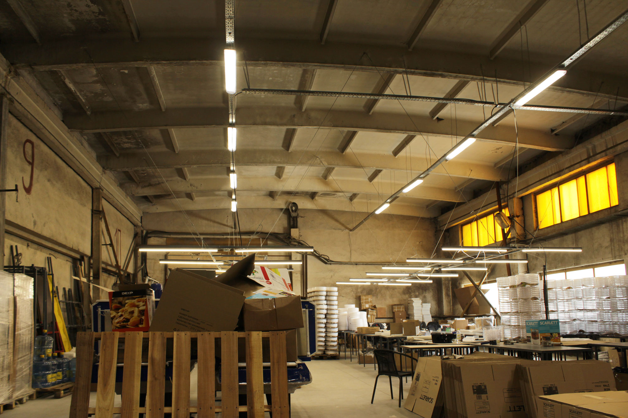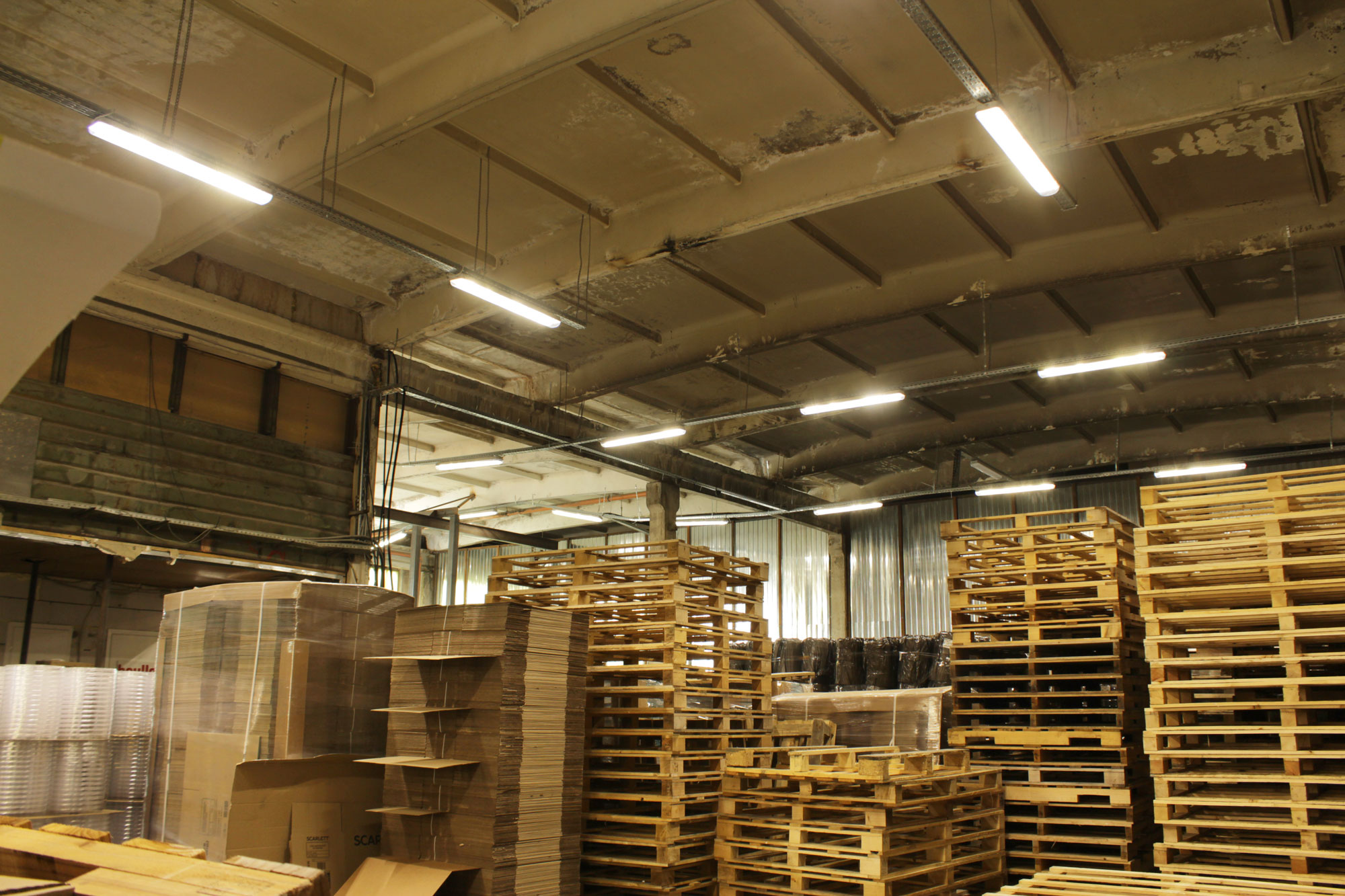 Компания ООО «Лаборатория идей», расположенная по адресу: г. Пушкин, ул. Промышленная 13, поставила задачу значительно увеличить уровень освещения в производственно-складских помещениях, а также уменьшить электропотребление.