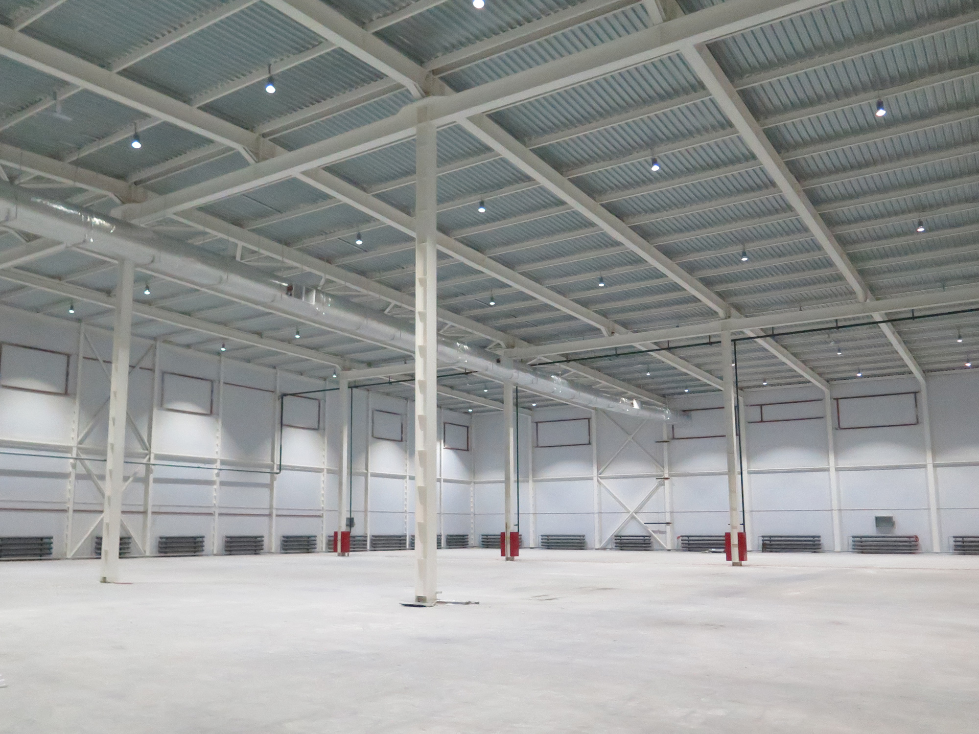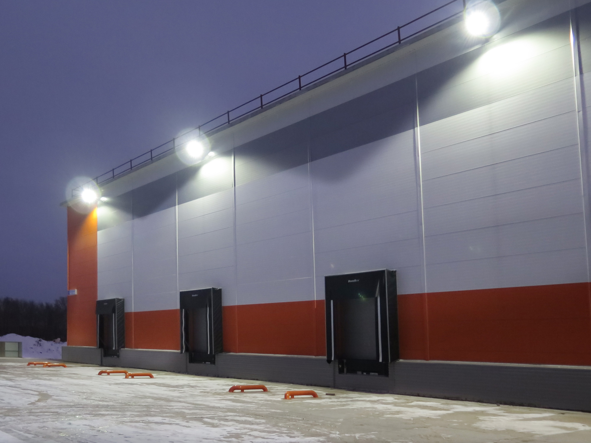 Поставленная задача: Оснастить светодиодными светильниками внутреннее помещение нового склада, фасадное освещение здания и близлежащую дорогу к нему