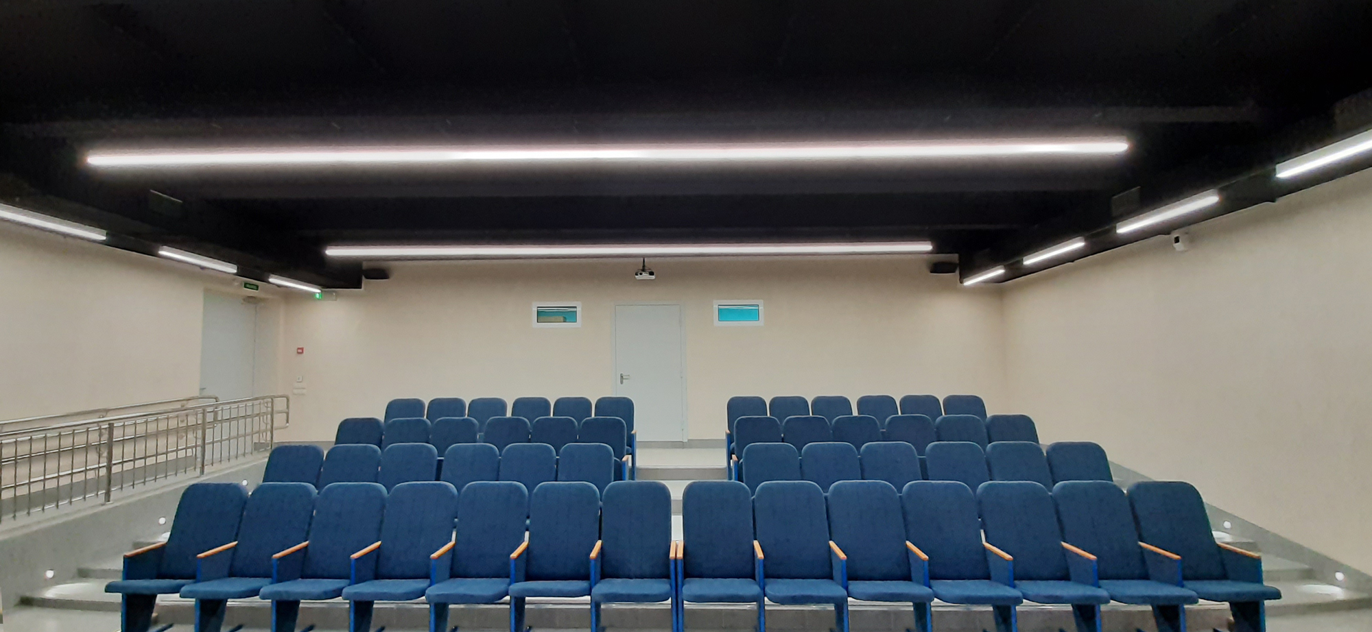 Предложенное осветительное решение: Установили светодиодные светильники Элегант-20-1000 и Элегант-20-500. Для подсветки спуска для людей с ограниченными возможностями, а так же зоны с установленным кинопроектором применены диммируемые светильники