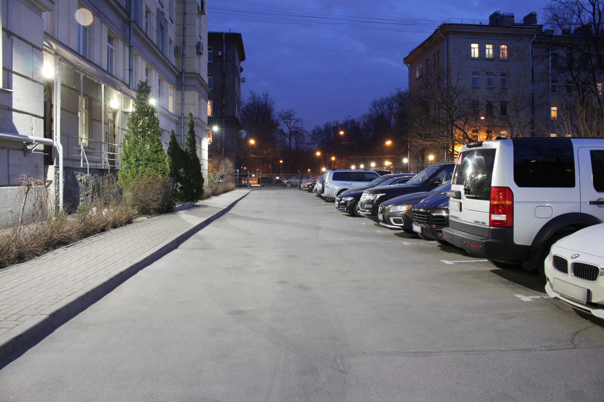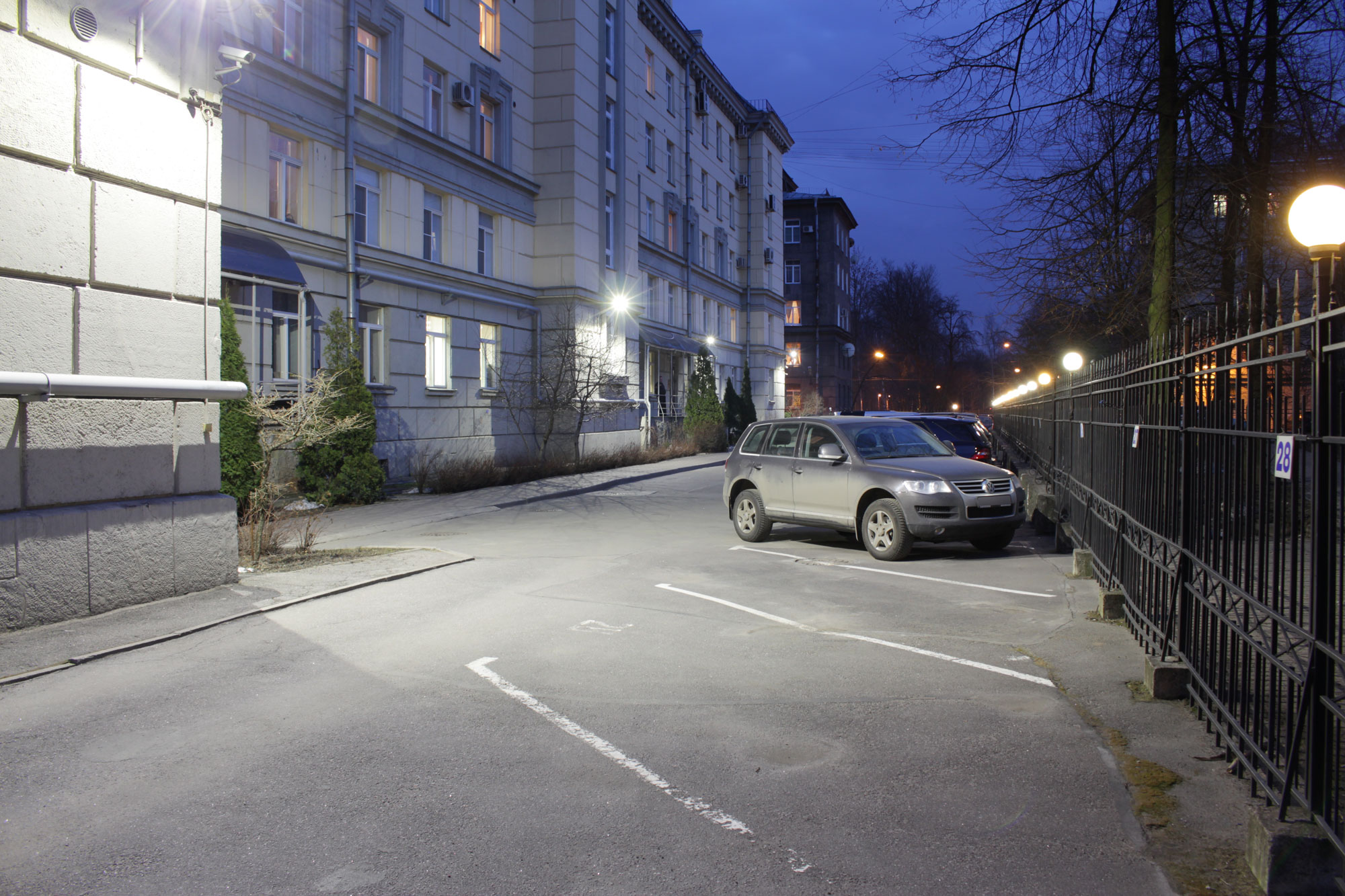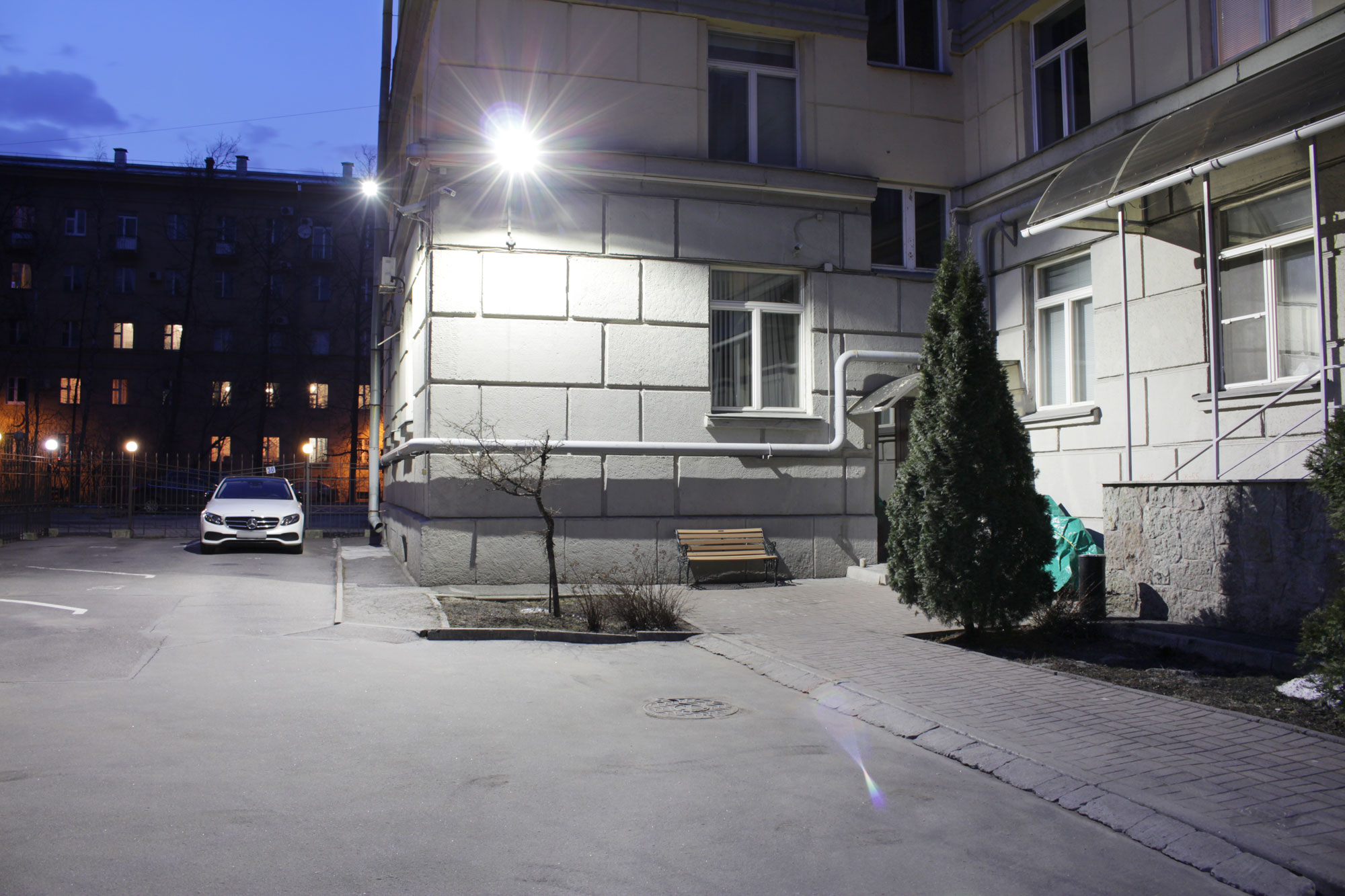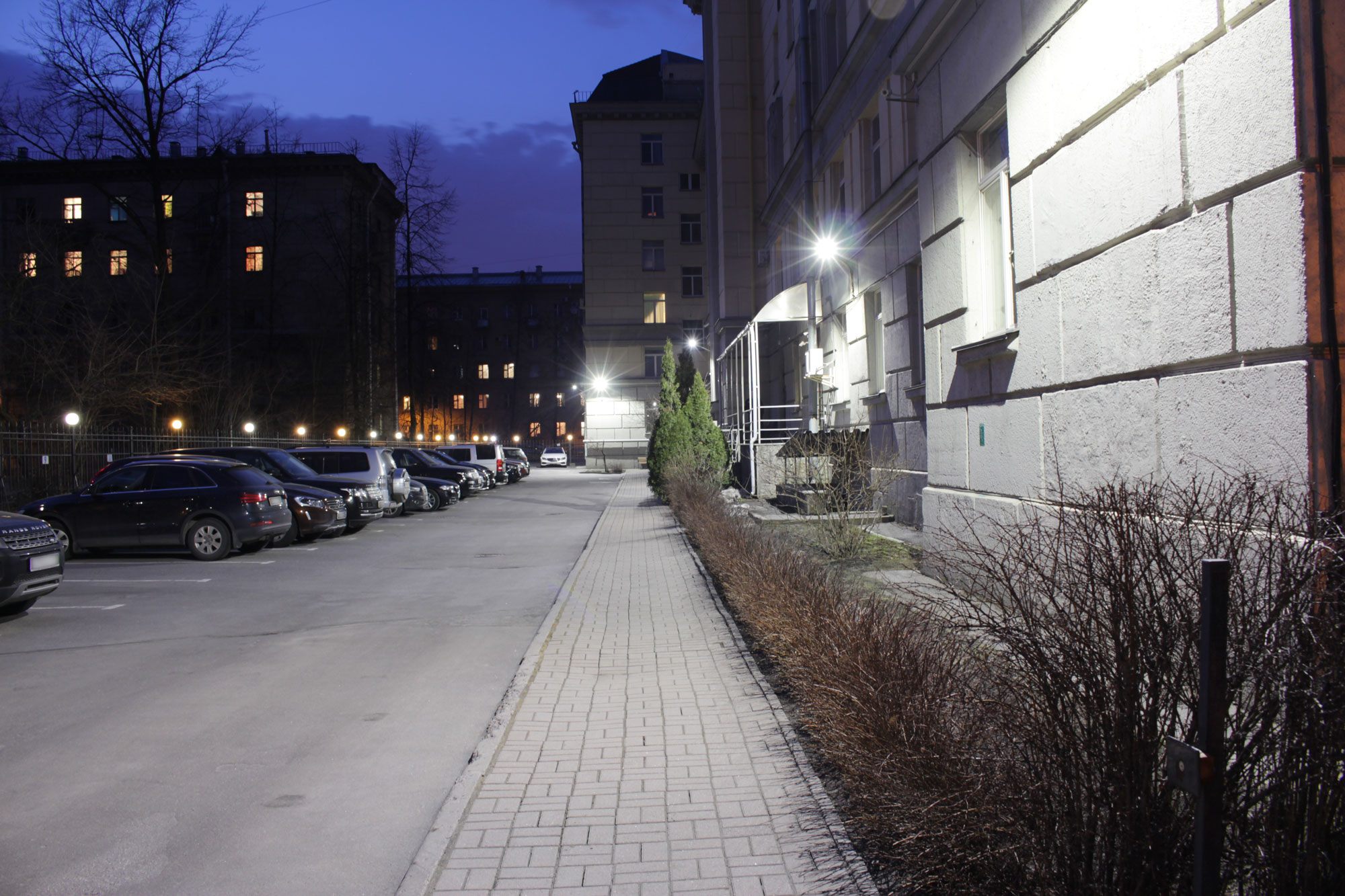 Предложенное осветительное решение: Установили светодиодные светильники ПромЛед Кобра-100 по периметру здания, над парадной установили светильники ПромЛед Кронос-18 ЭКО