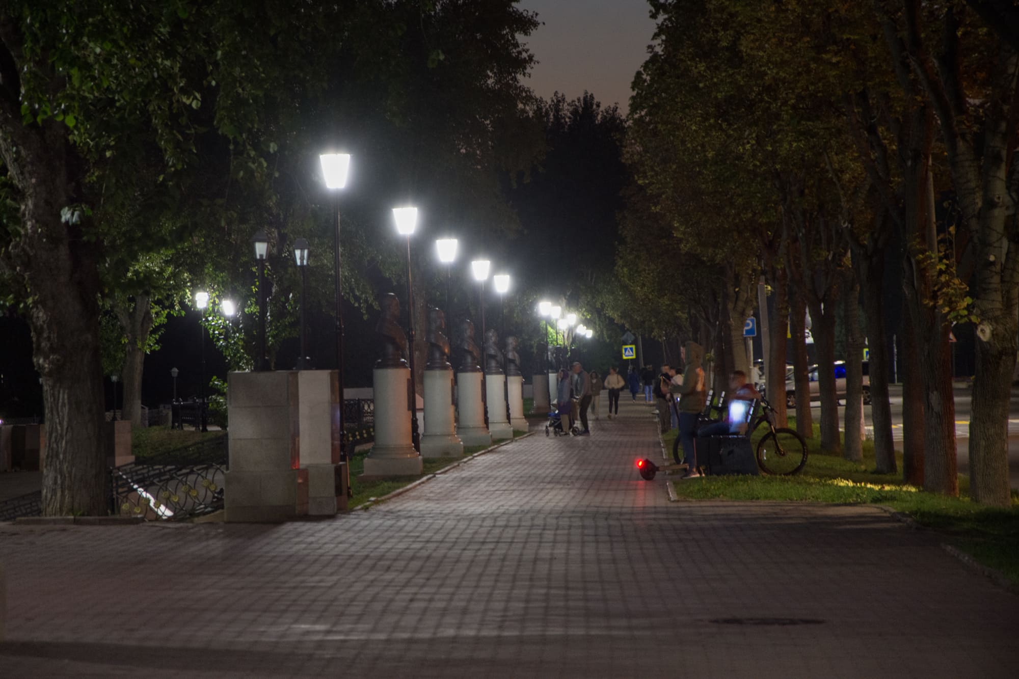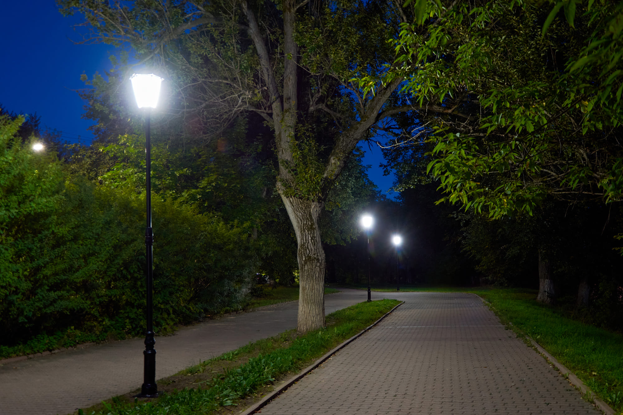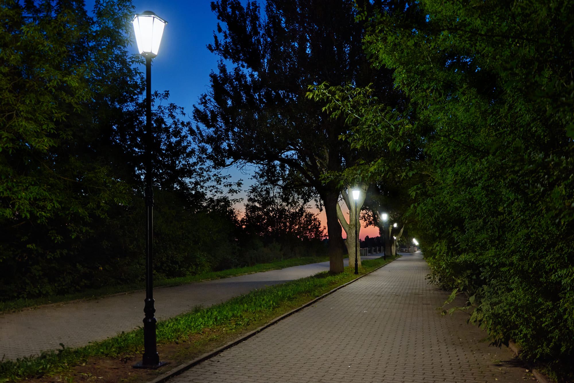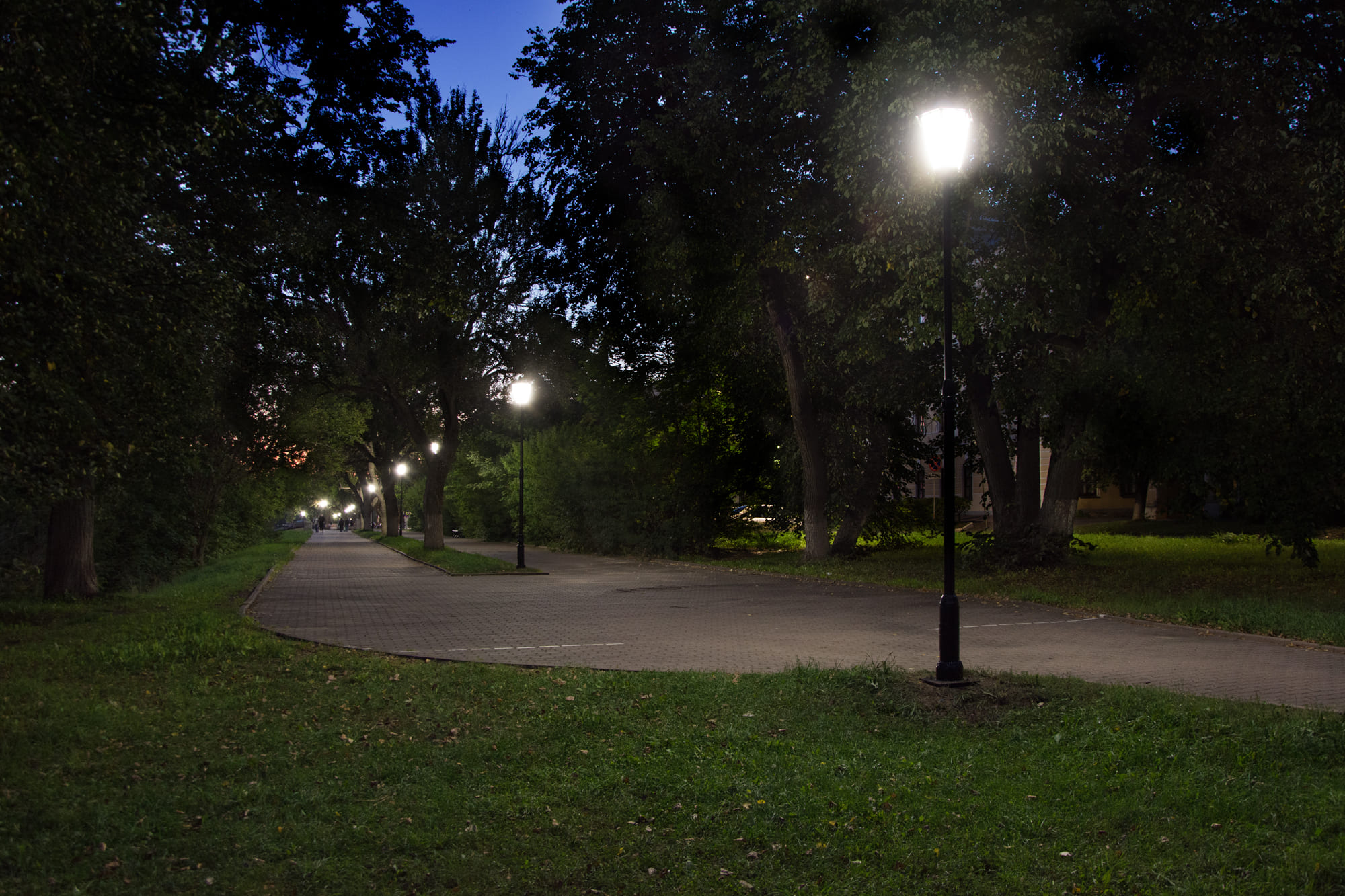 Декоративные парковые светильники создали равномерное неслепящее освещение и комфортную атмосферу для нахождения в парке в вечернее время.