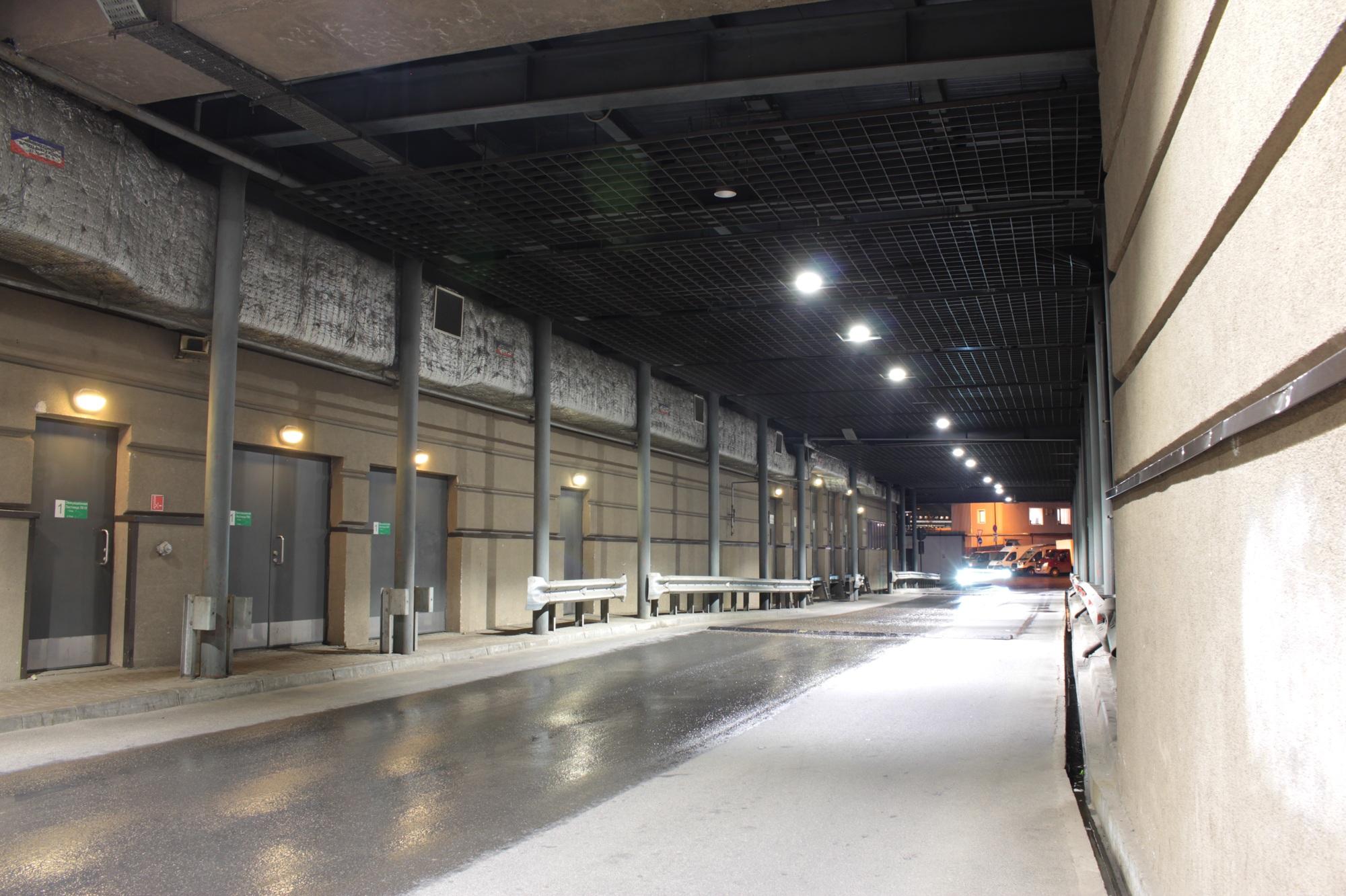 Предложенное осветительное решение: в потолок грильято смонтировали купольные светодиодные светильники Профи v2.0 100 4500К 120°. Так высота подвеса светильников 5 метров для равномерного освещения была выбрана оптическая линза с углом половинной яркости 120°.