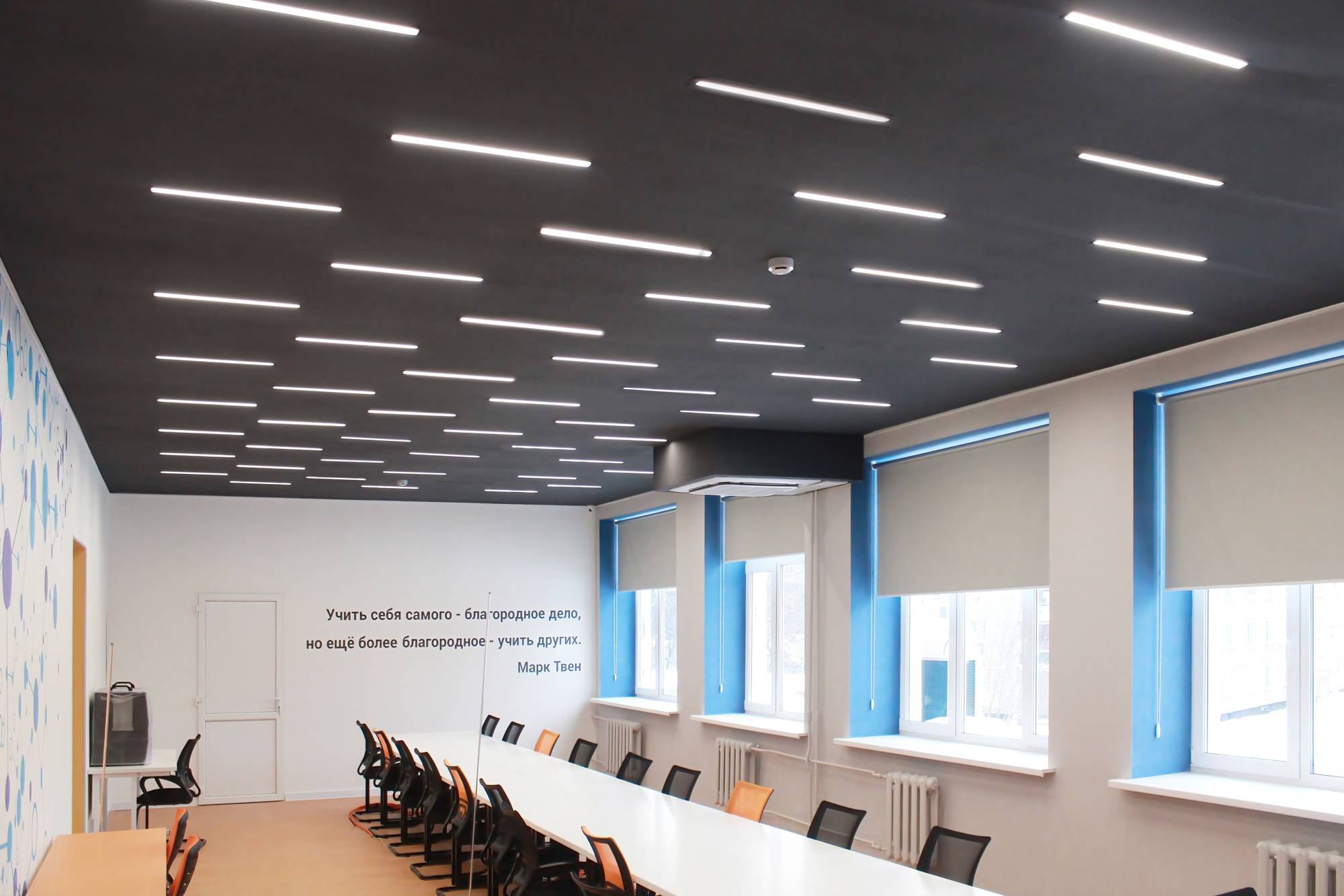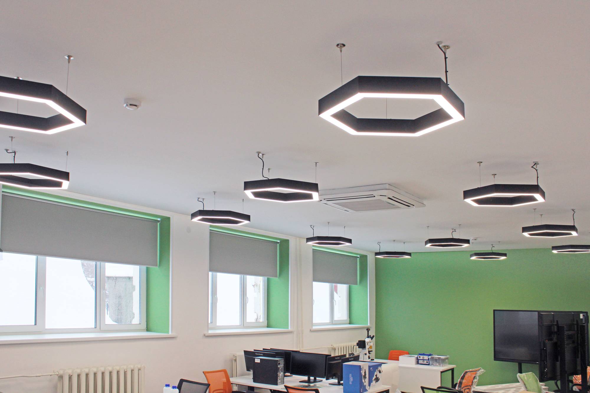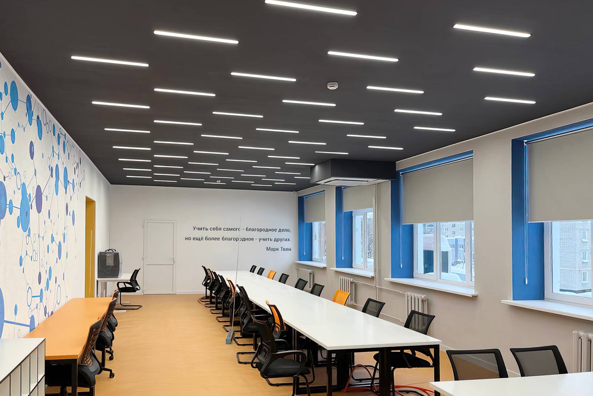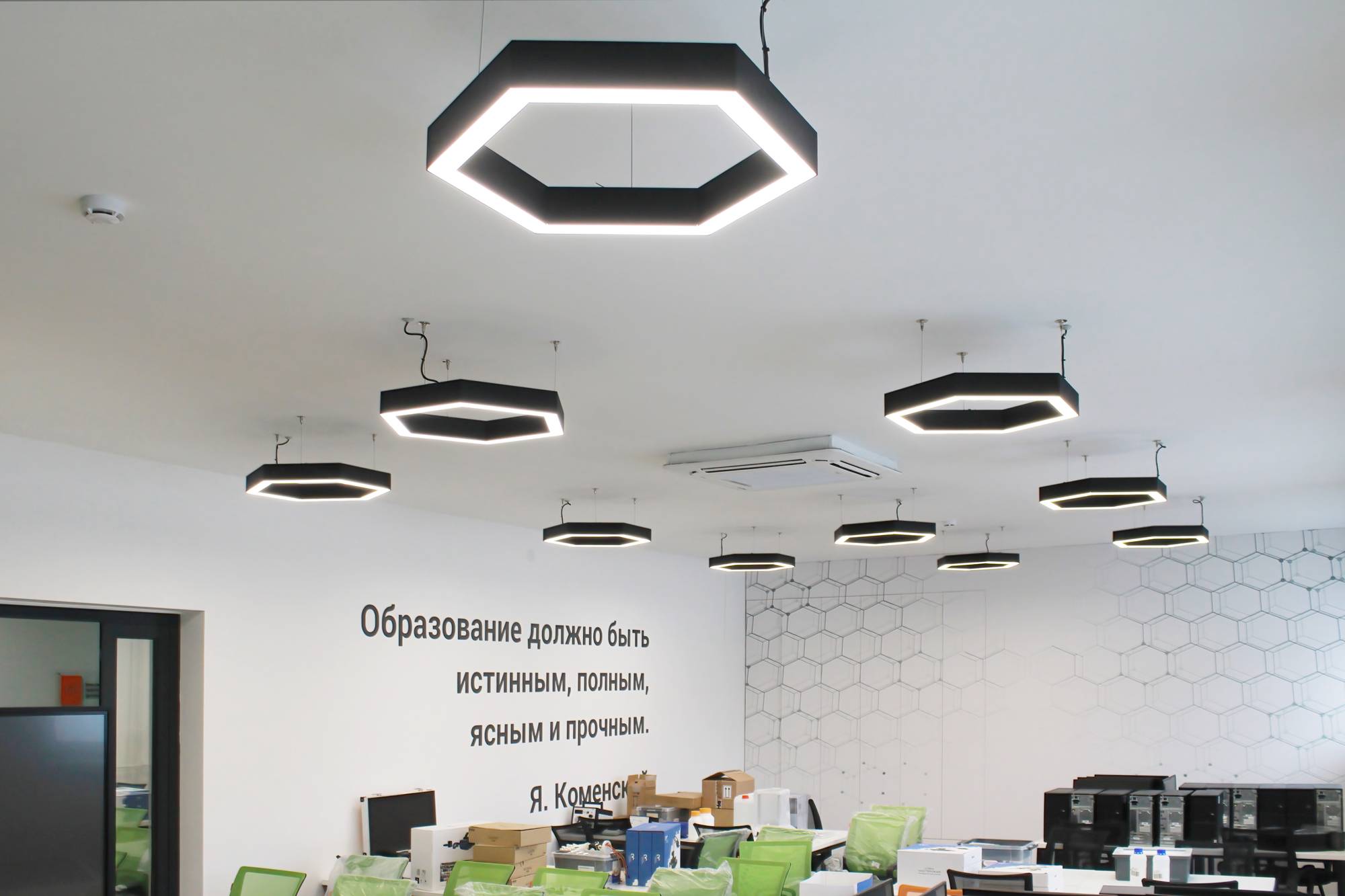 Предложенное осветительное решение: совместно с нашими дилерами компанией ООО «Энергоэффект», предложили уникальное освещение внутреннего помещения педагогического института. Разработаны оригинальные светильники в виде сот на базе светильников серии Элегант S в количестве 50 штук. Так же в потолок были встроены Элегант Встраиваемый 20 500мм 5000К в количестве 400 штук.