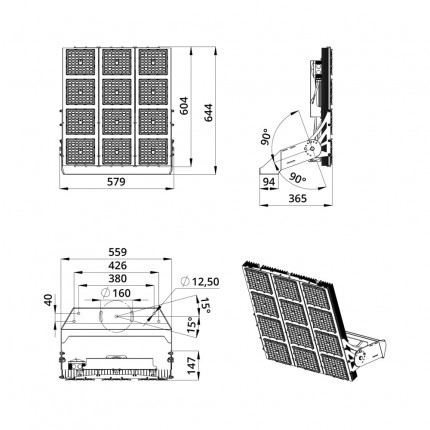 Также это исполнение имеет поворотные модули, которые можно ориентировать независимо друг от друга в разных направлениях. Количество модулей варьируется в зависимости от мощности светильника.