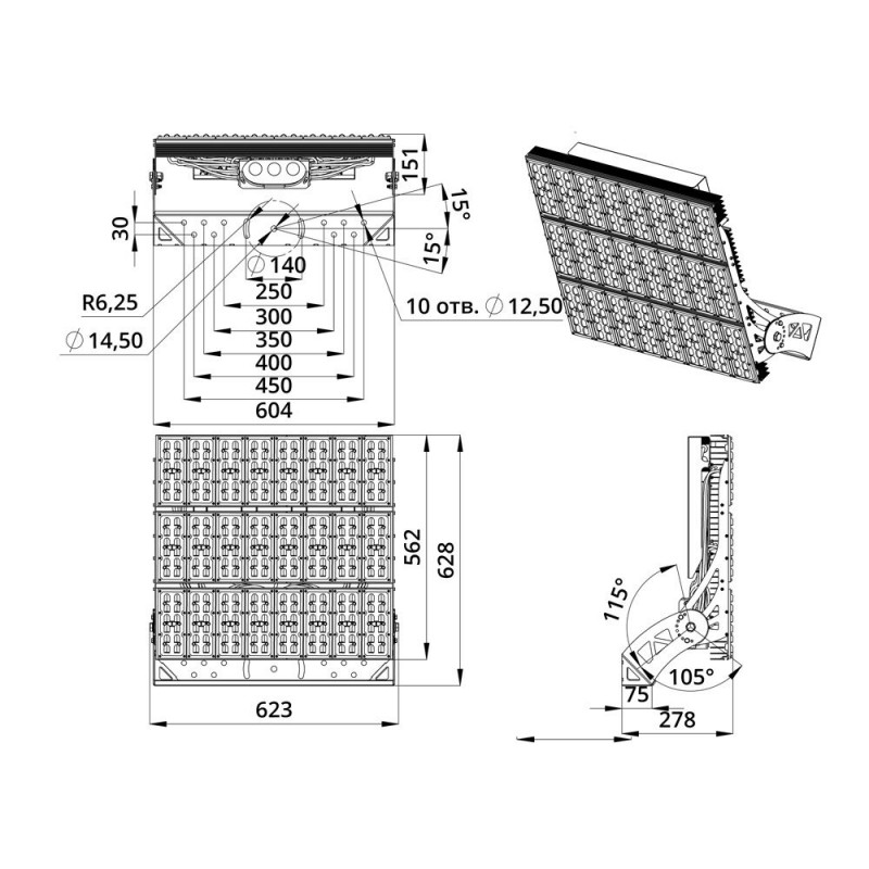 В комплекте идёт кронштейн, который позволяет регулировать угол наклона светильников. Специальные зубцы на кронштейнах дополнительно облегчают регулировку положения прожектора.